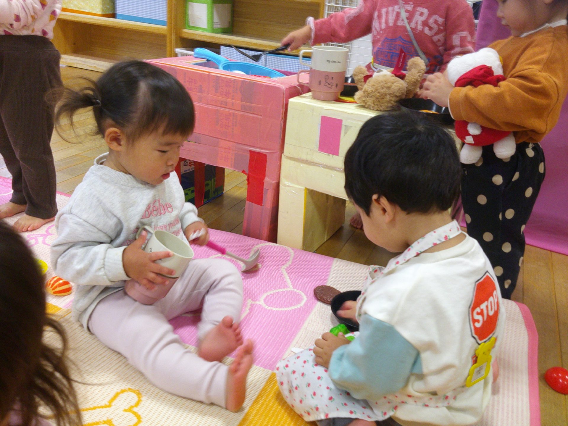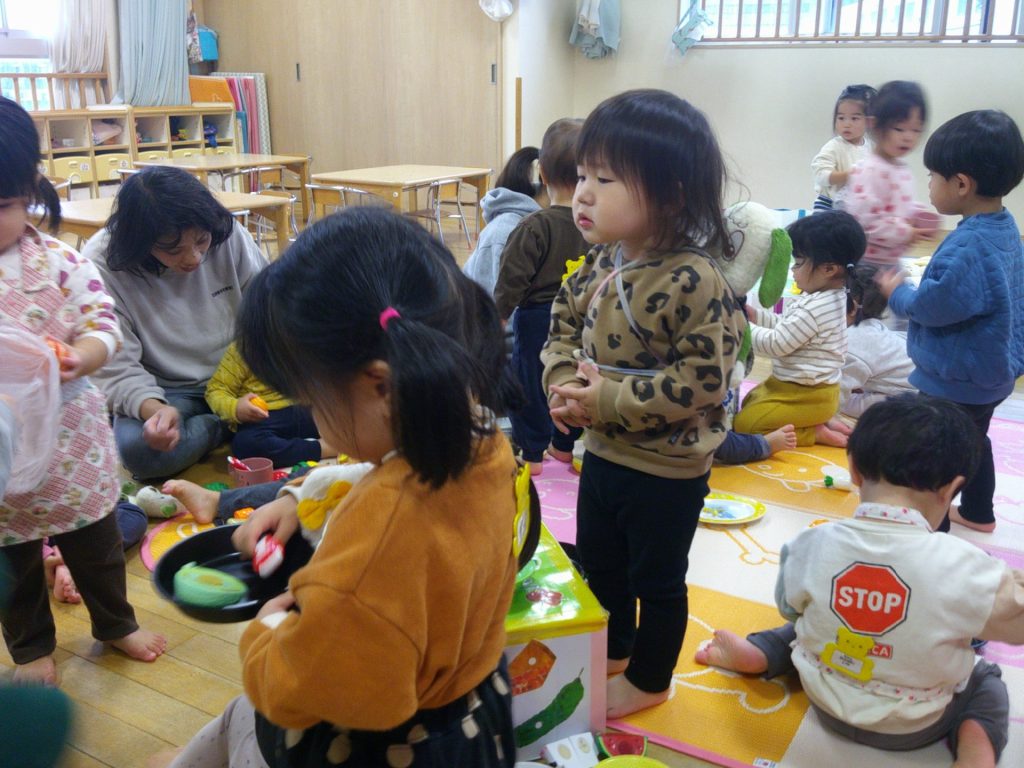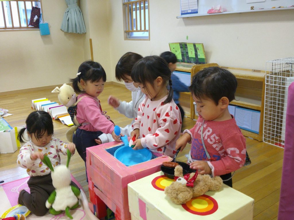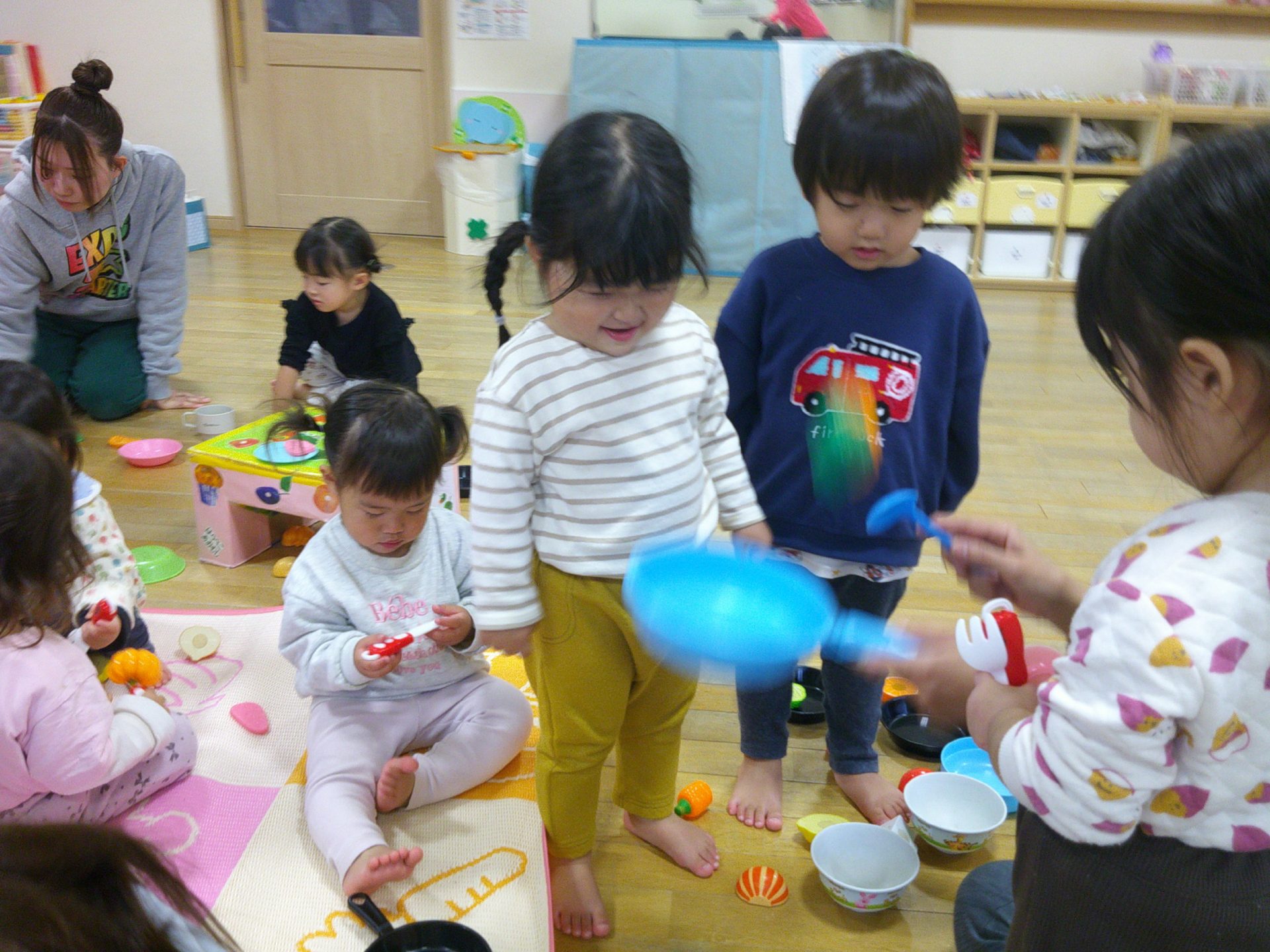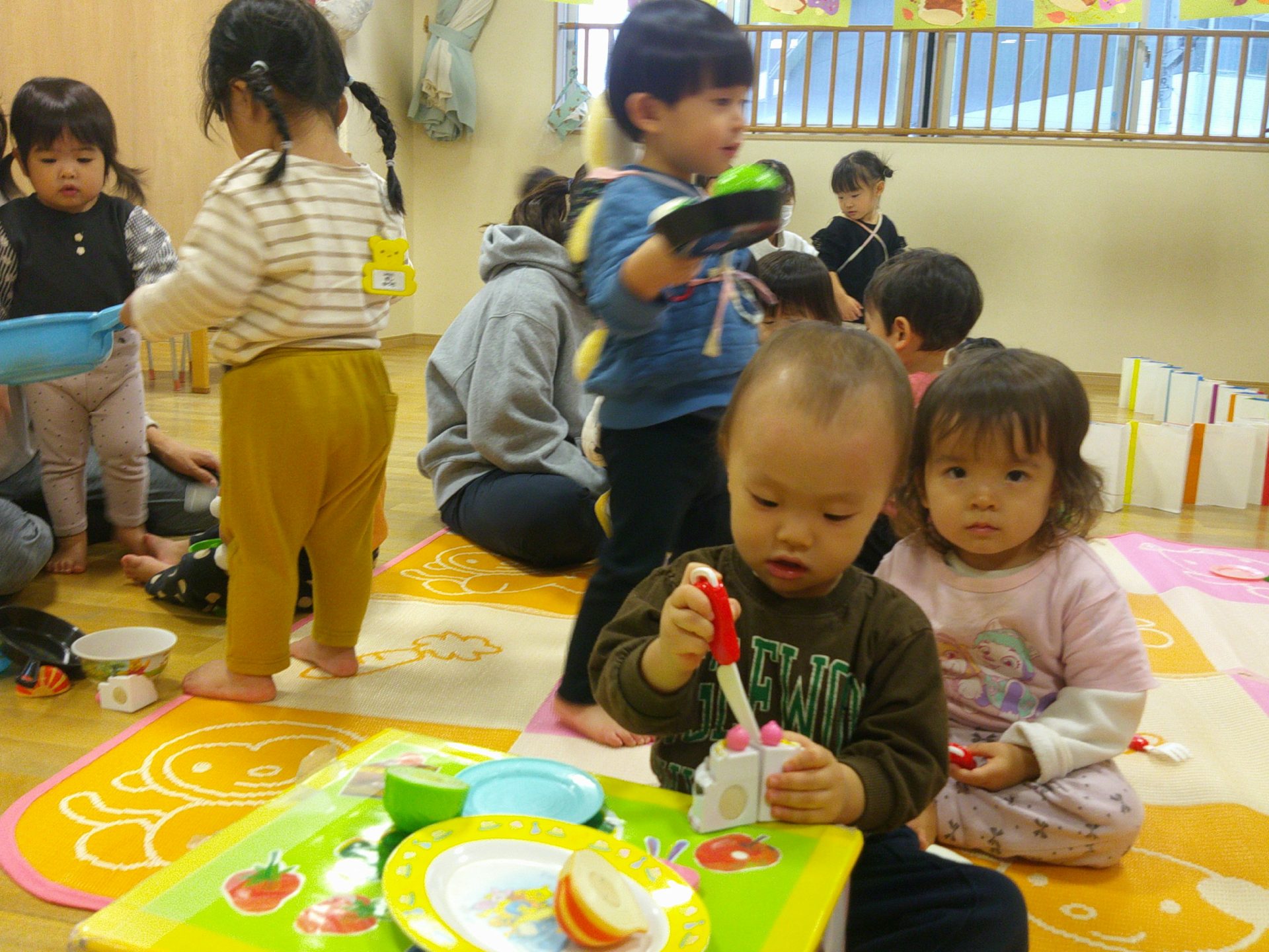 2025年11月19日 おままごとあそびをしたよ! おままごとを楽しみました。お皿にごちそうを盛ったり、テーブルを囲んで友達と一緒に楽しむ姿が見られました。お人形さんを優しく抱っこやおんぶをしたり、お布団に寝転がらしてトントンする姿が見られましたよ。