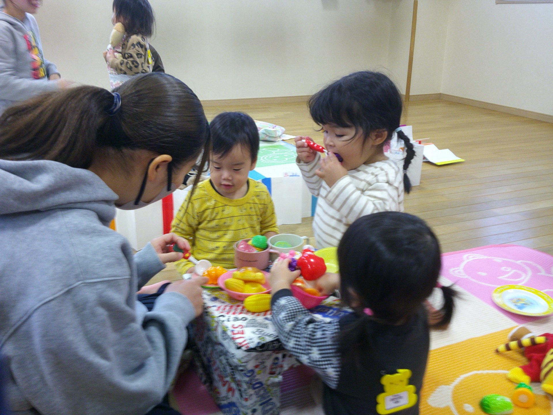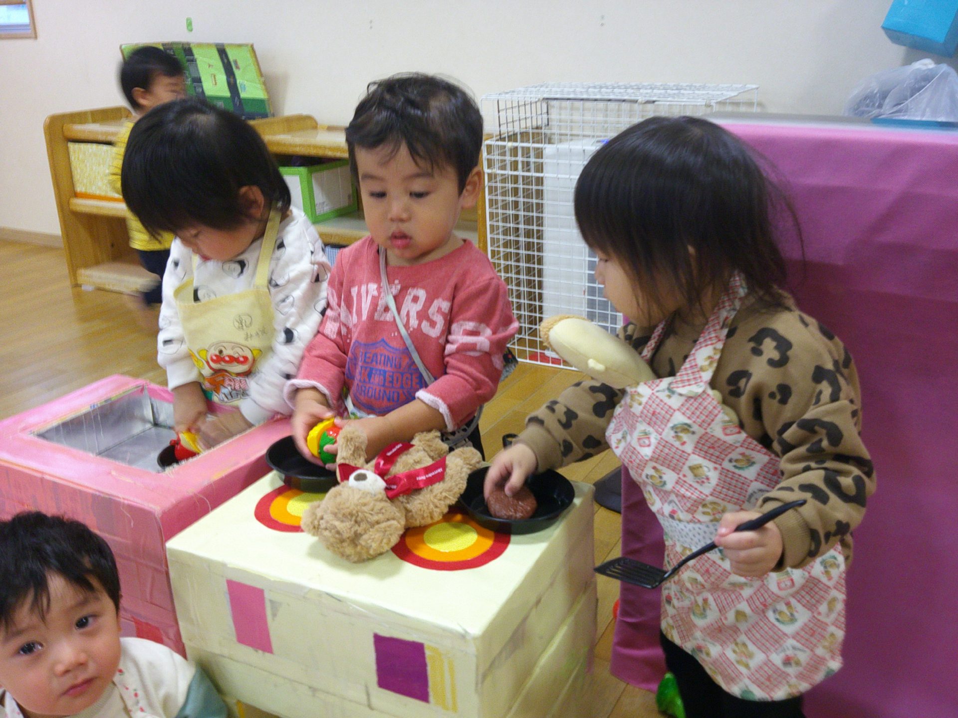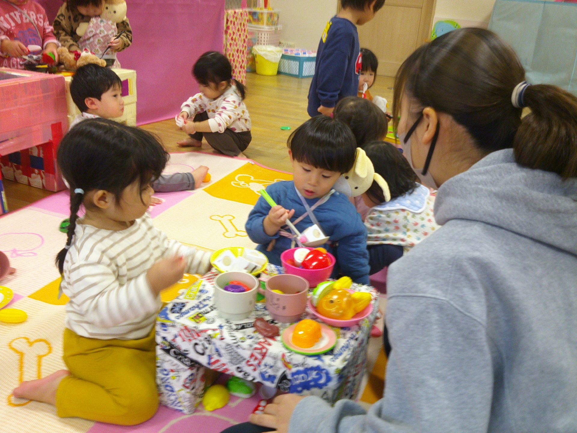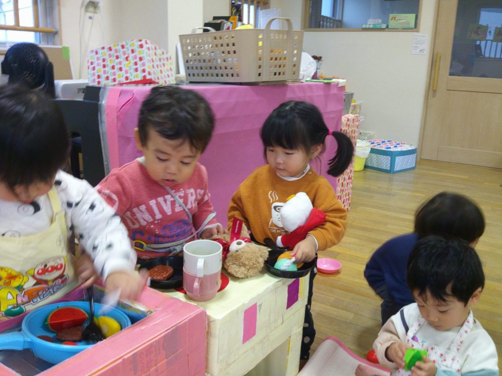 2025年11月19日 おままごとあそびをしたよ! おままごとを楽しみました。お皿にごちそうを盛ったり、テーブルを囲んで友達と一緒に楽しむ姿が見られました。お人形さんを優しく抱っこやおんぶをしたり、お布団に寝転がらしてトントンする姿が見られましたよ。