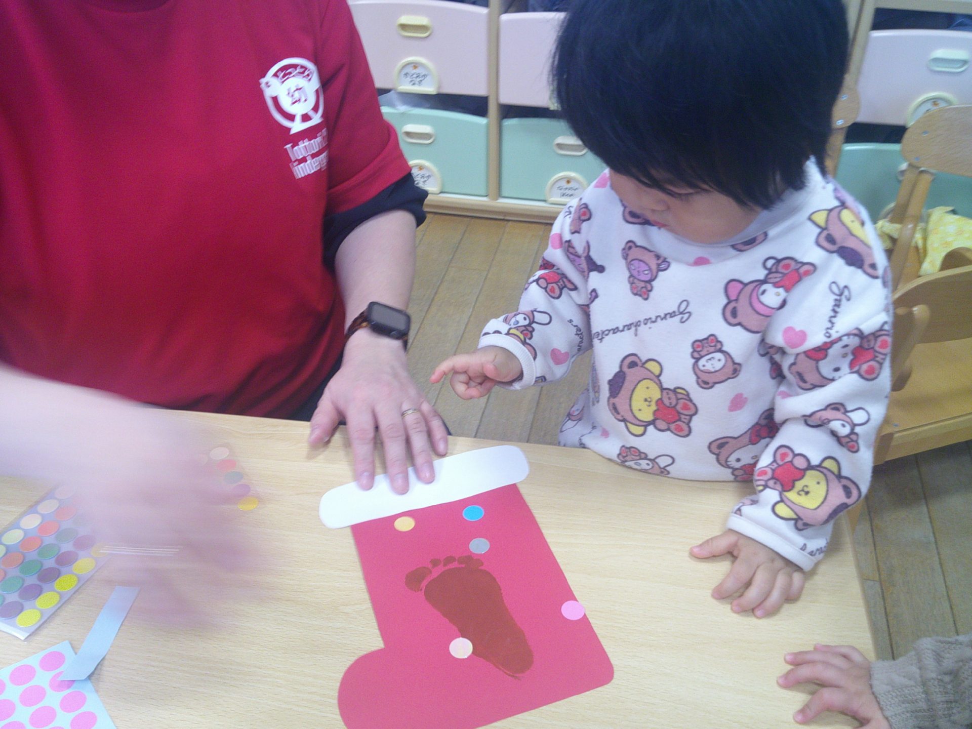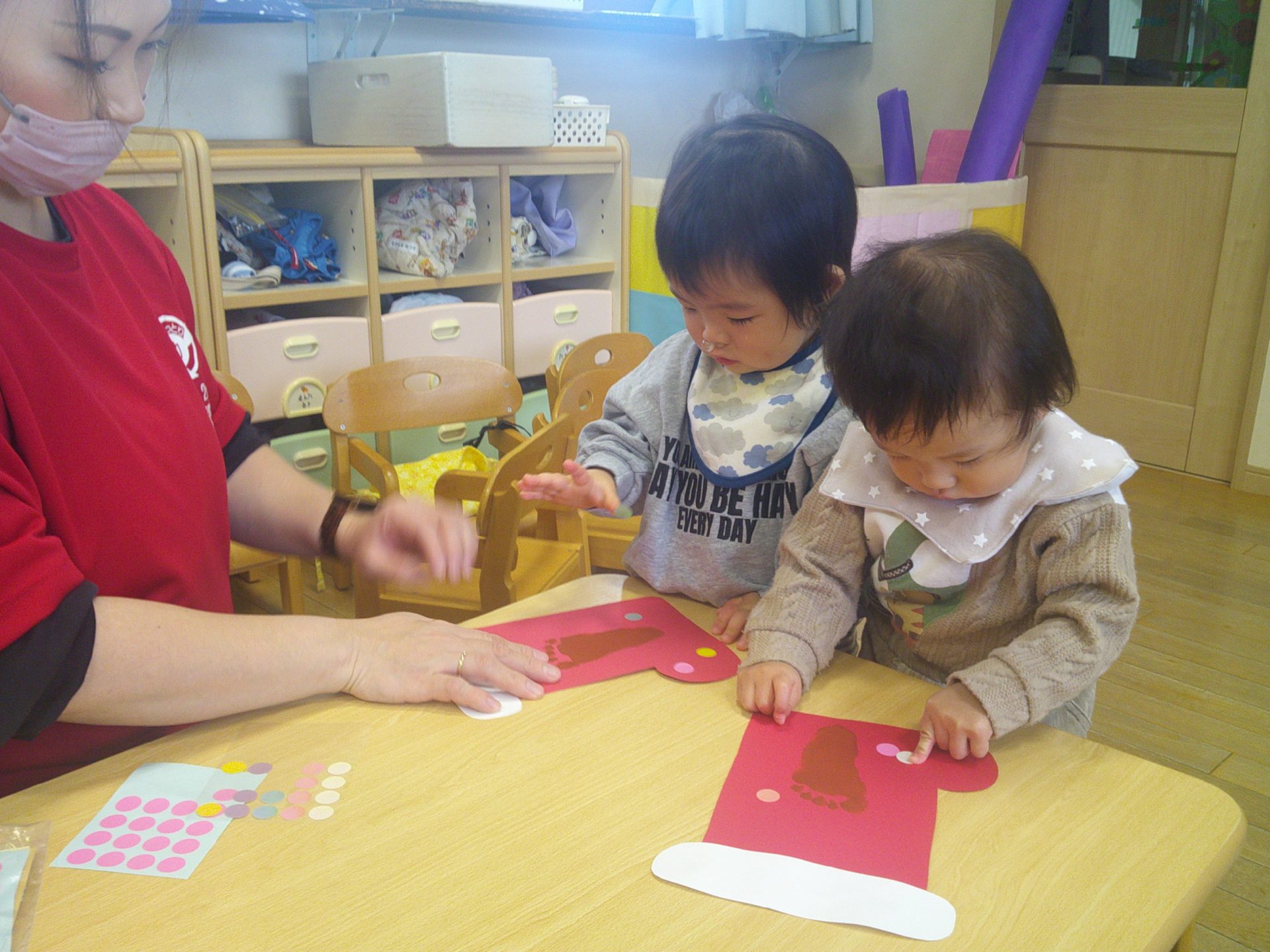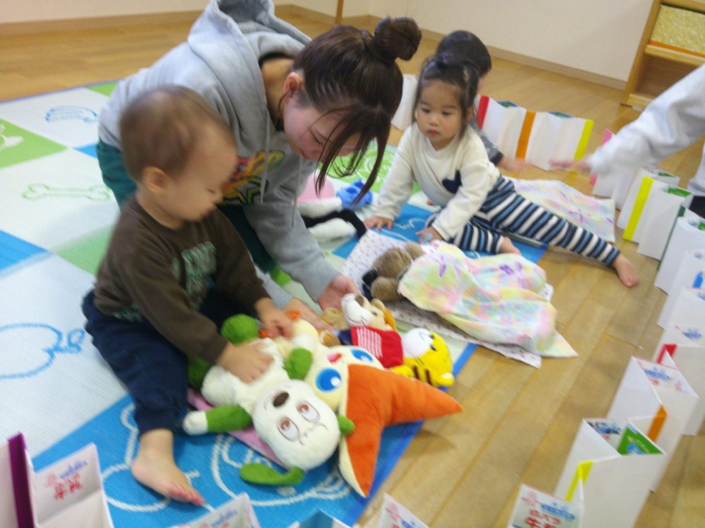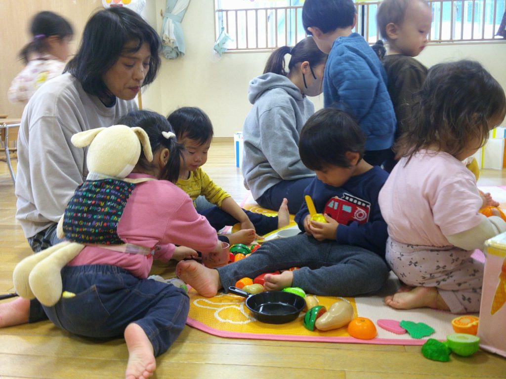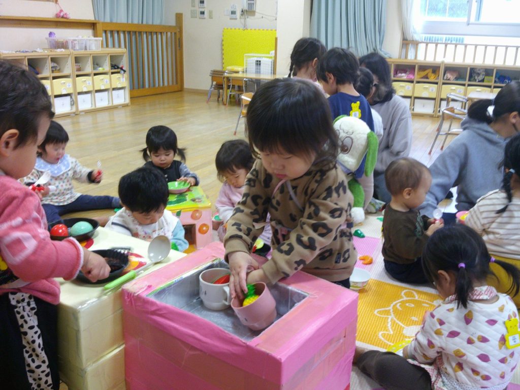 2025年11月19日 おままごとあそびをしたよ! おままごとを楽しみました。お皿にごちそうを盛ったり、テーブルを囲んで友達と一緒に楽しむ姿が見られました。お人形さんを優しく抱っこやおんぶをしたり、お布団に寝転がらしてトントンする姿が見られましたよ。