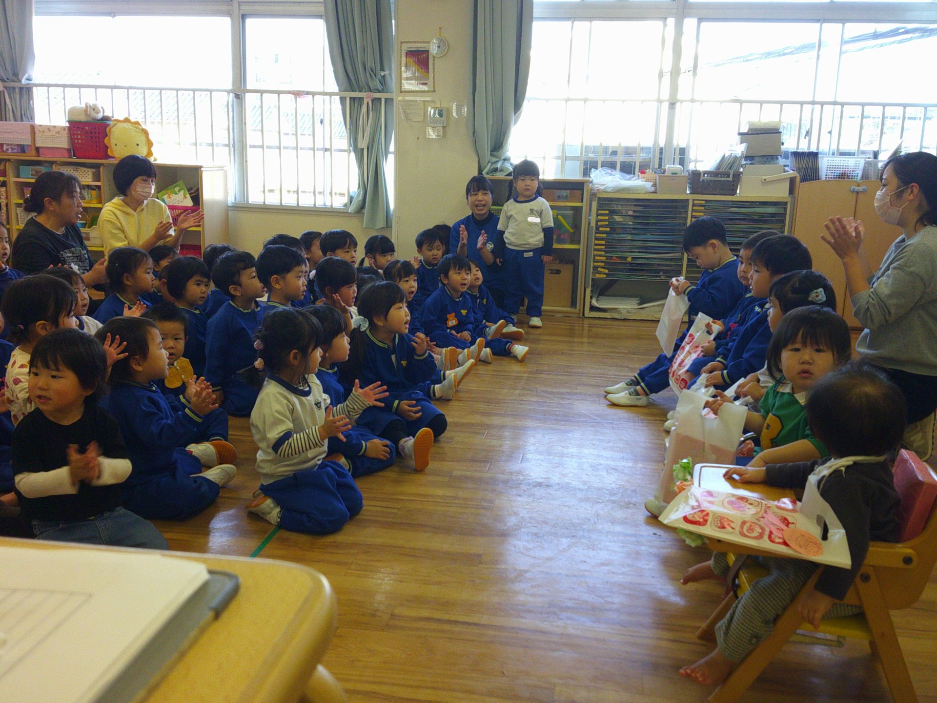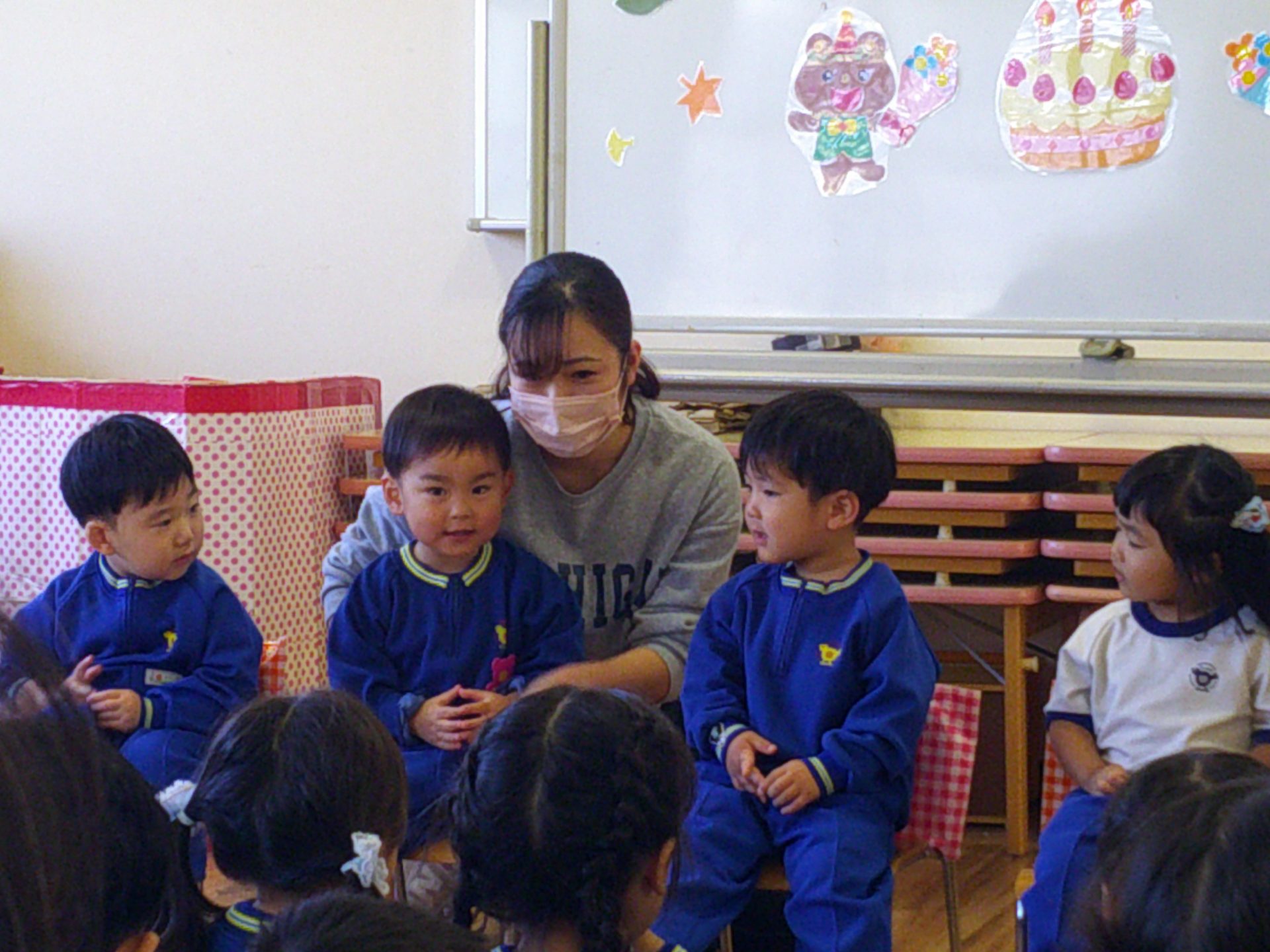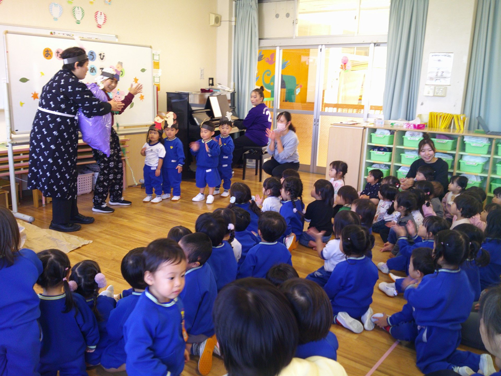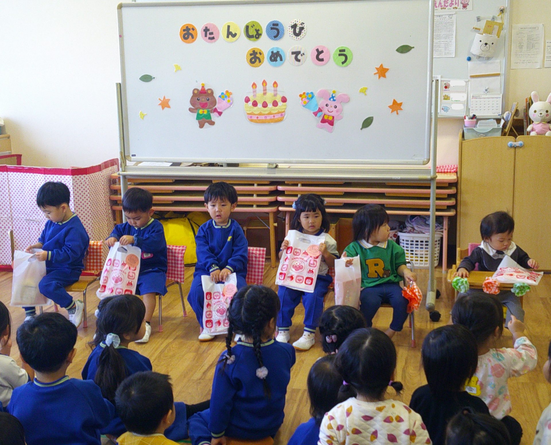 2025年11月17日 ⭐11月 誕生会⭐ 11月の誕生会がありました。 最初は「どんぐりころころ」の歌をみんなで歌いました♪ その後、お友達の紹介を聞いたり、「たんじょうび」の歌を歌ったりして、お友達をお祝いしました✨ お楽しみコーナーでは、「おおきなおいも」の出し物を見ました。11月生まれの2歳児さんは、おいもを引っ張るお手伝いもしました。「うんとこしょ どっこいしょ」と、みんなでおいもを引っ張ると・・大きな大きなさつまいもが抜けました!!「やったー!」と、みんなで大喜びをして、楽しい時間を過ごしました(*^^*) 11月生まれのお友達、お誕生日おめでとうございます✨