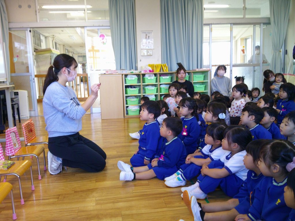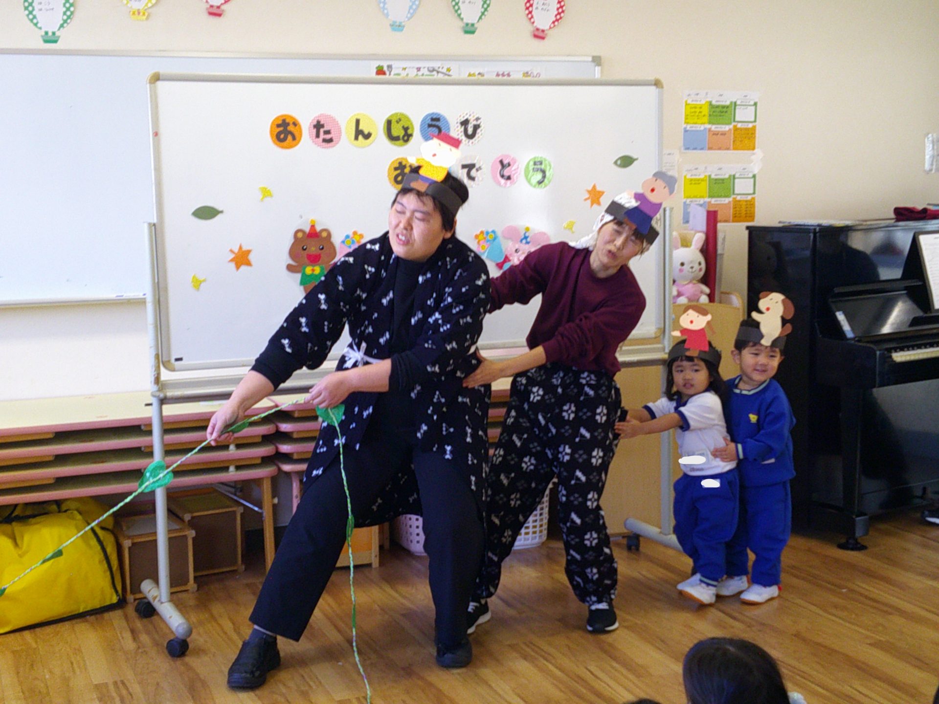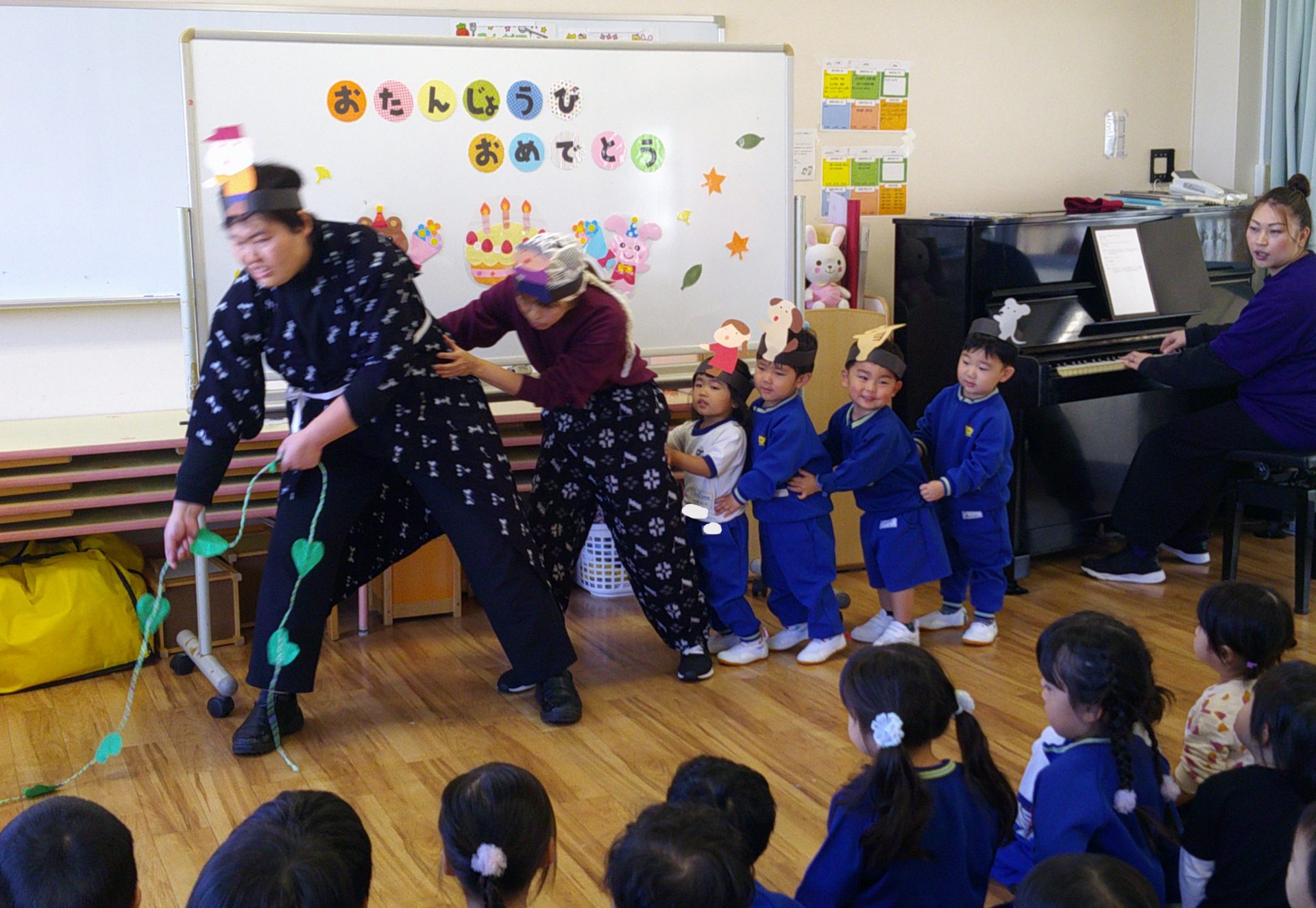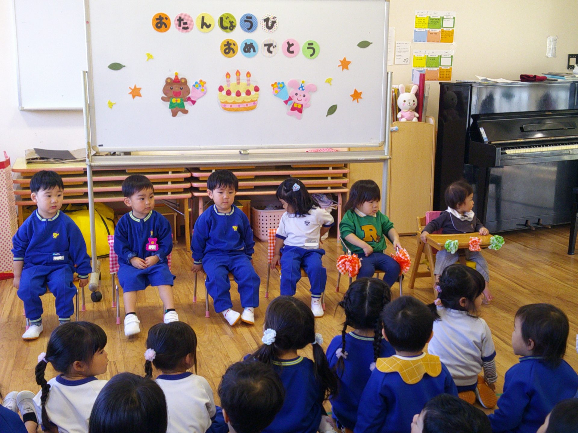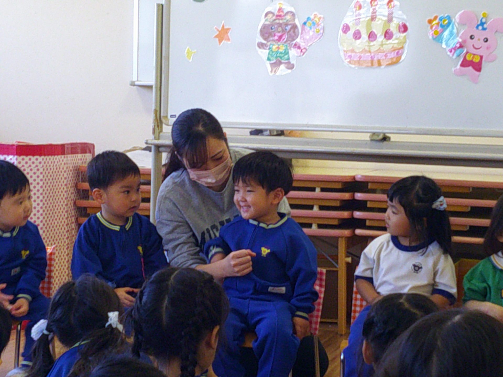 2025年11月17日 ⭐11月 誕生会⭐ 11月の誕生会がありました。 最初は「どんぐりころころ」の歌をみんなで歌いました♪ その後、お友達の紹介を聞いたり、「たんじょうび」の歌を歌ったりして、お友達をお祝いしました✨ お楽しみコーナーでは、「おおきなおいも」の出し物を見ました。11月生まれの2歳児さんは、おいもを引っ張るお手伝いもしました。「うんとこしょ どっこいしょ」と、みんなでおいもを引っ張ると・・大きな大きなさつまいもが抜けました!!「やったー!」と、みんなで大喜びをして、楽しい時間を過ごしました(*^^*) 11月生まれのお友達、お誕生日おめでとうございます✨