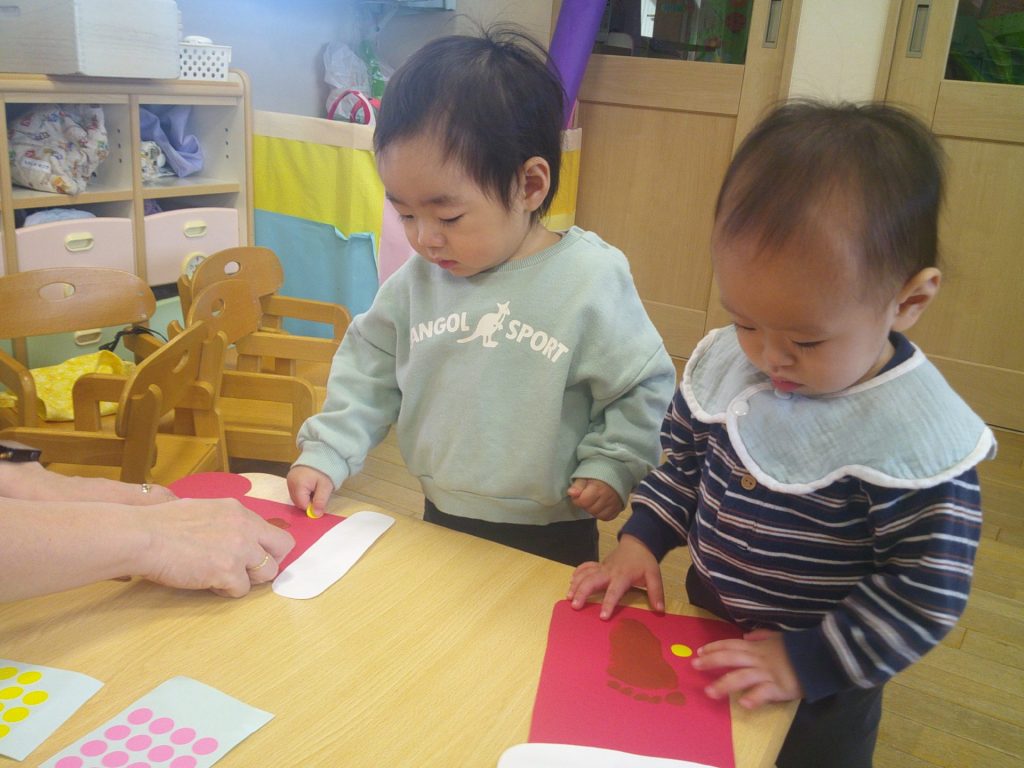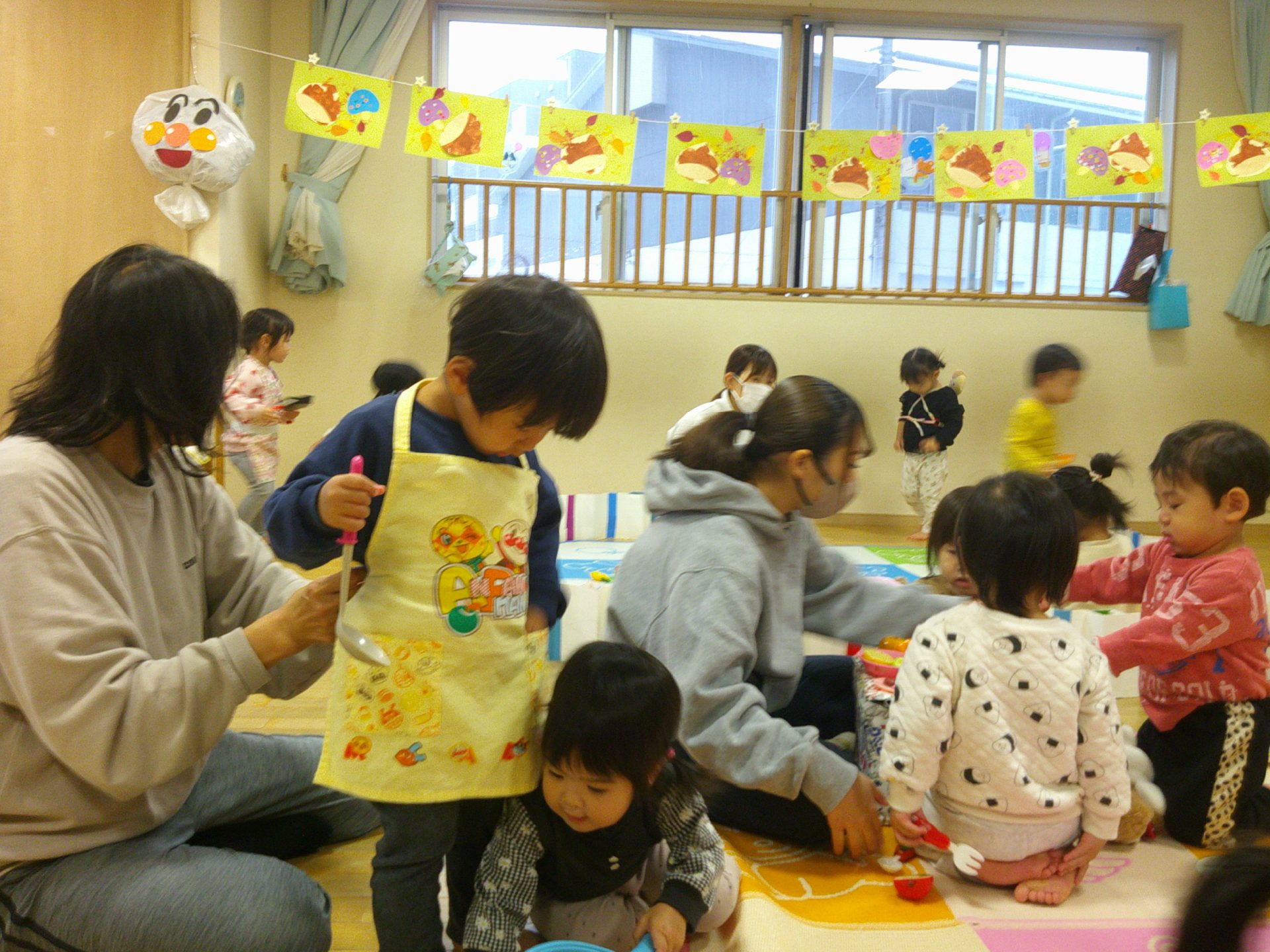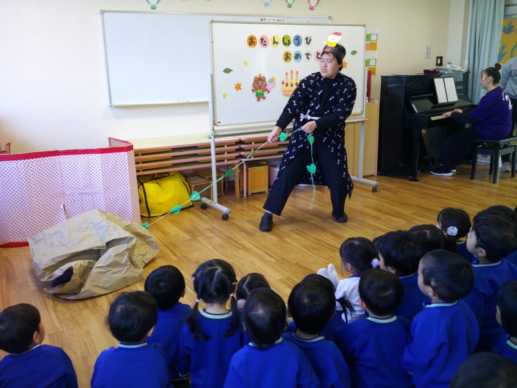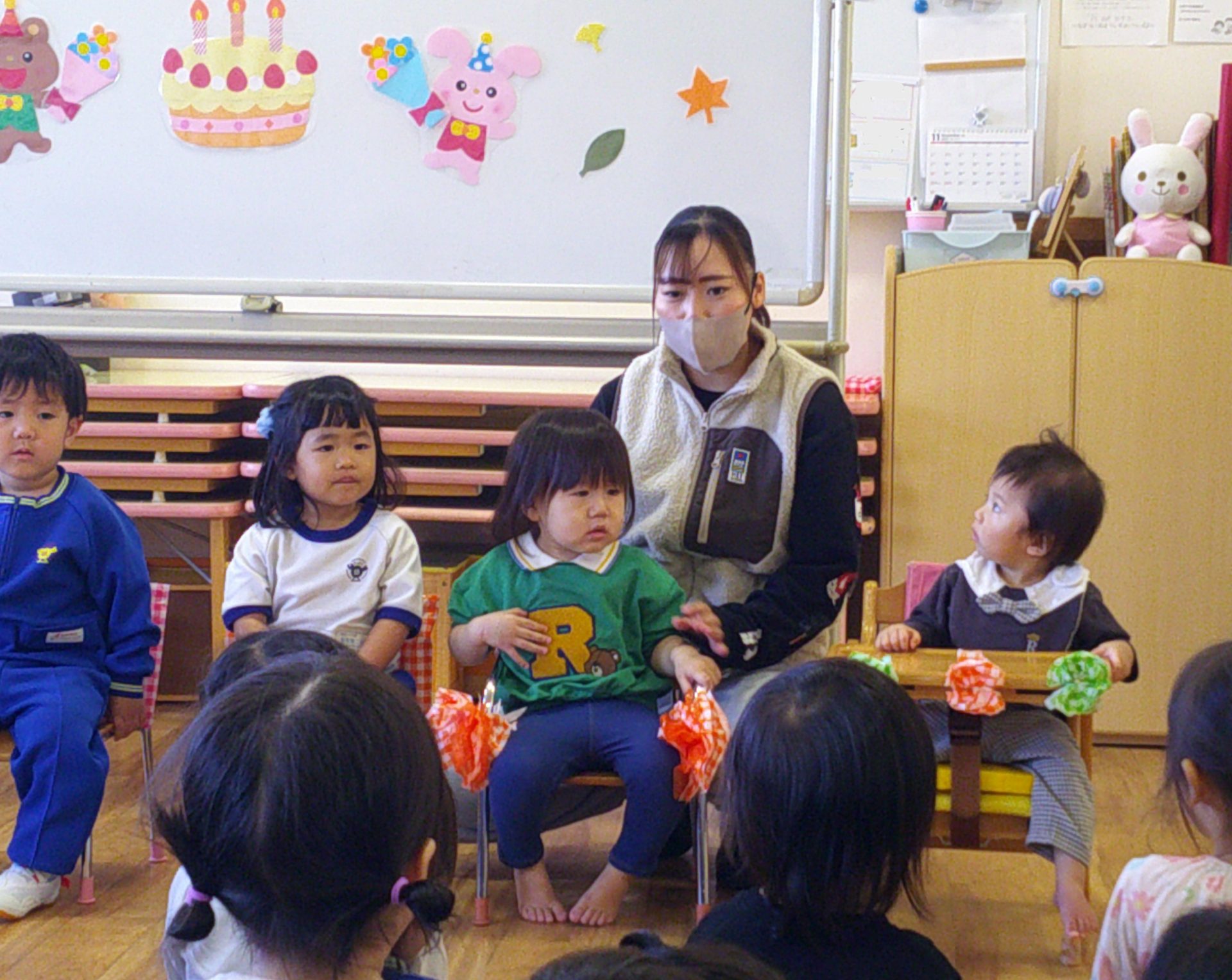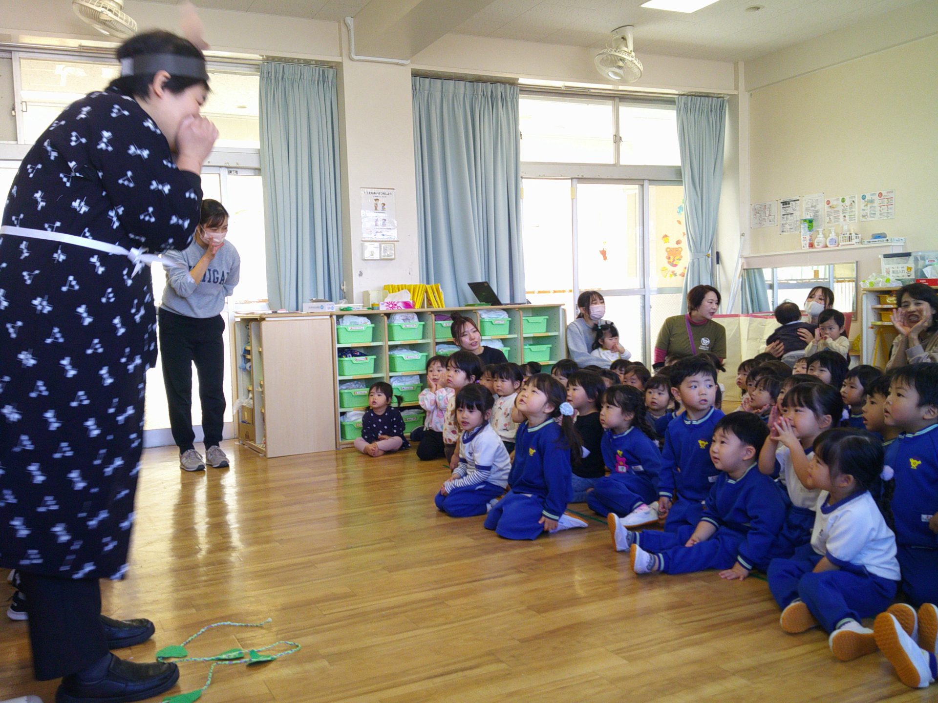 2025年11月17日 ⭐11月 誕生会⭐ 11月の誕生会がありました。 最初は「どんぐりころころ」の歌をみんなで歌いました♪ その後、お友達の紹介を聞いたり、「たんじょうび」の歌を歌ったりして、お友達をお祝いしました✨ お楽しみコーナーでは、「おおきなおいも」の出し物を見ました。11月生まれの2歳児さんは、おいもを引っ張るお手伝いもしました。「うんとこしょ どっこいしょ」と、みんなでおいもを引っ張ると・・大きな大きなさつまいもが抜けました!!「やったー!」と、みんなで大喜びをして、楽しい時間を過ごしました(*^^*) 11月生まれのお友達、お誕生日おめでとうございます✨