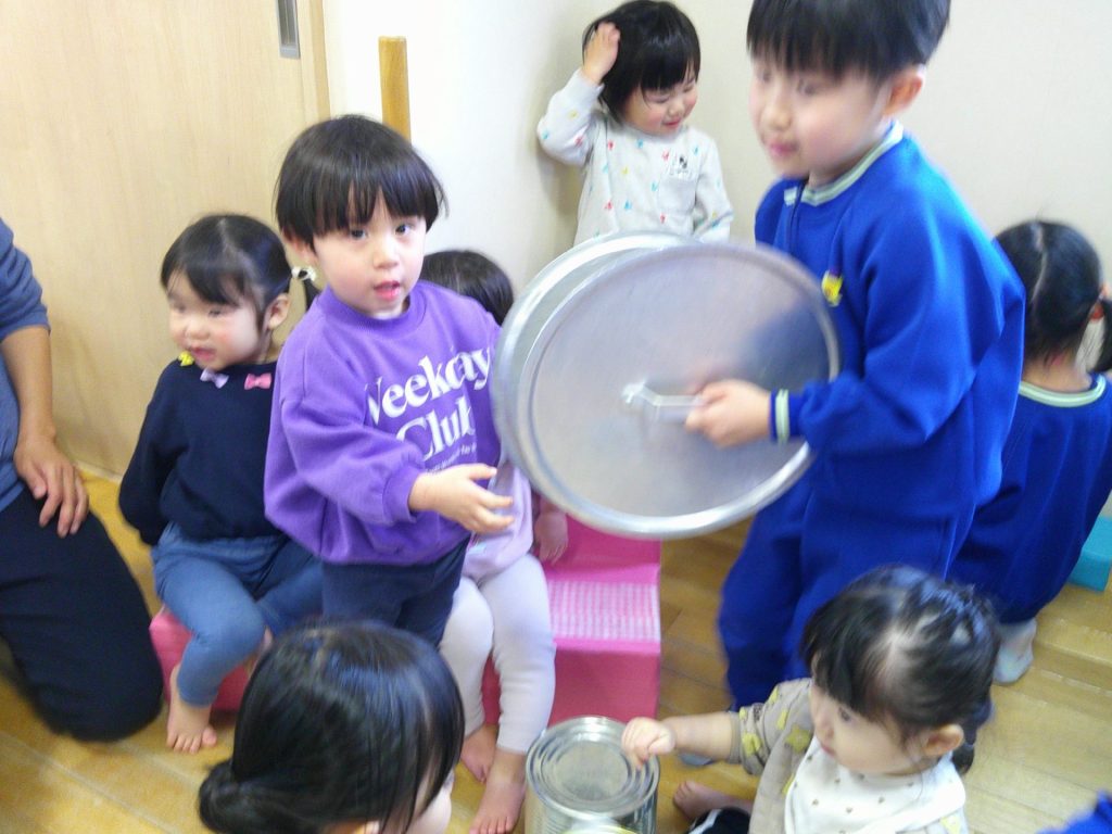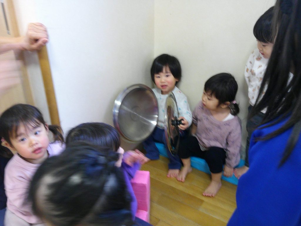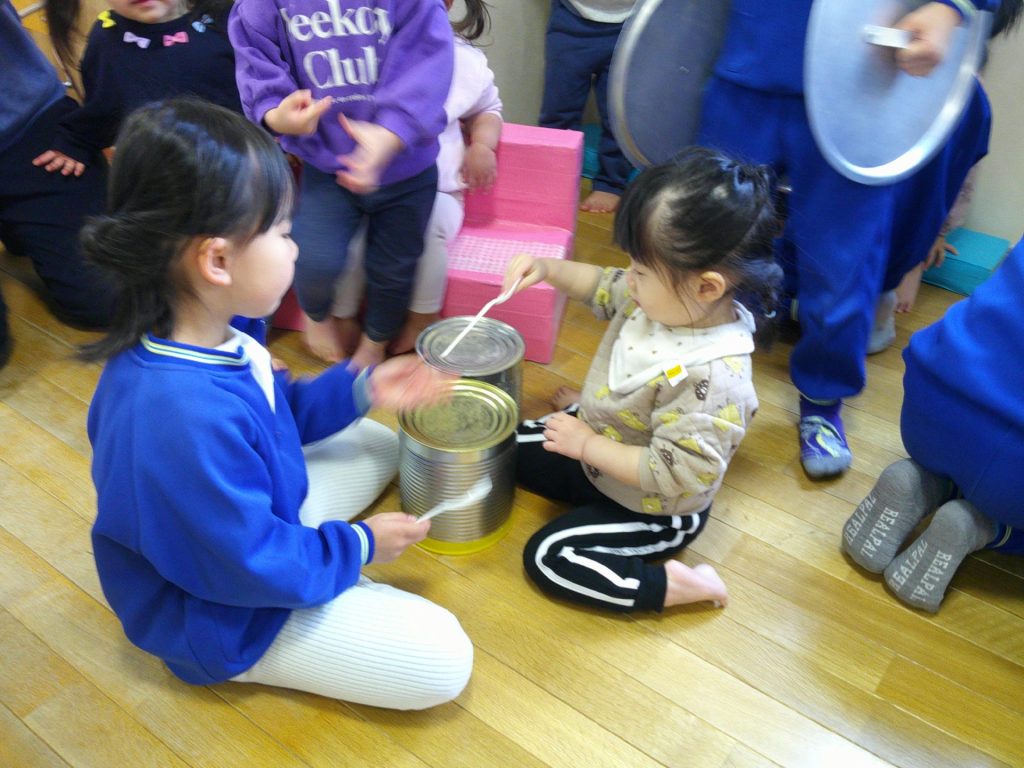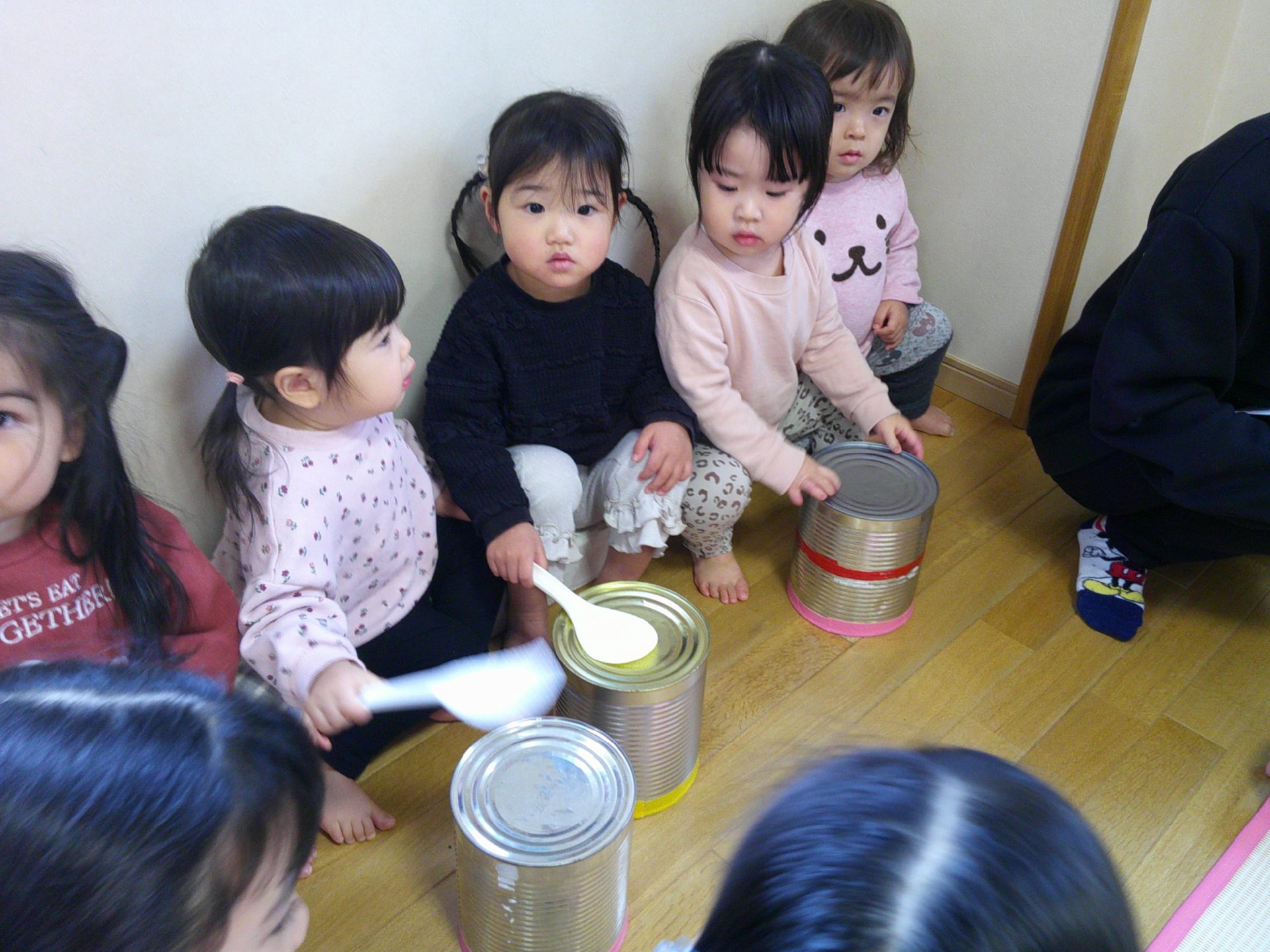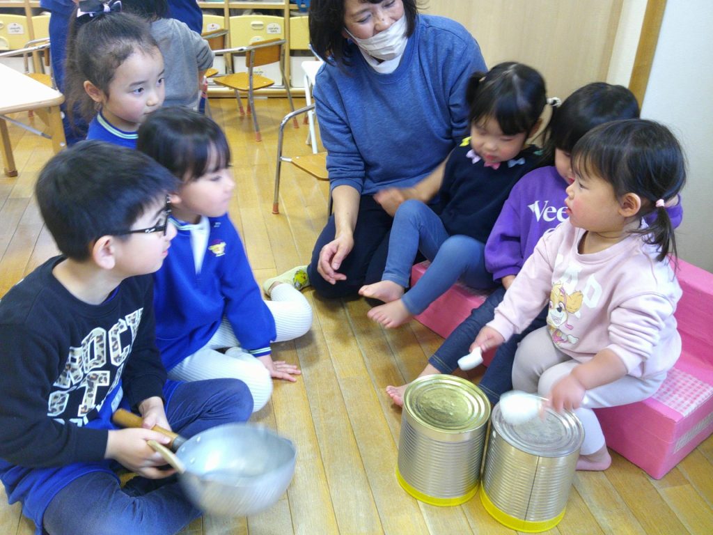 2026年03月10日 「キッチンバンド」がきてくれたよ♪ うぐいす組のお兄さん、お姉さんが「キッチンバンド」を披露しに来てくれました。 演奏を聴くだけでなく、楽器を触らせてもらい、大喜びの子ども達でした。