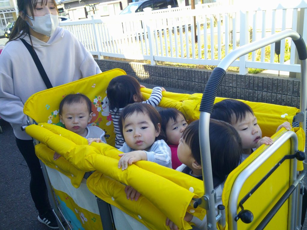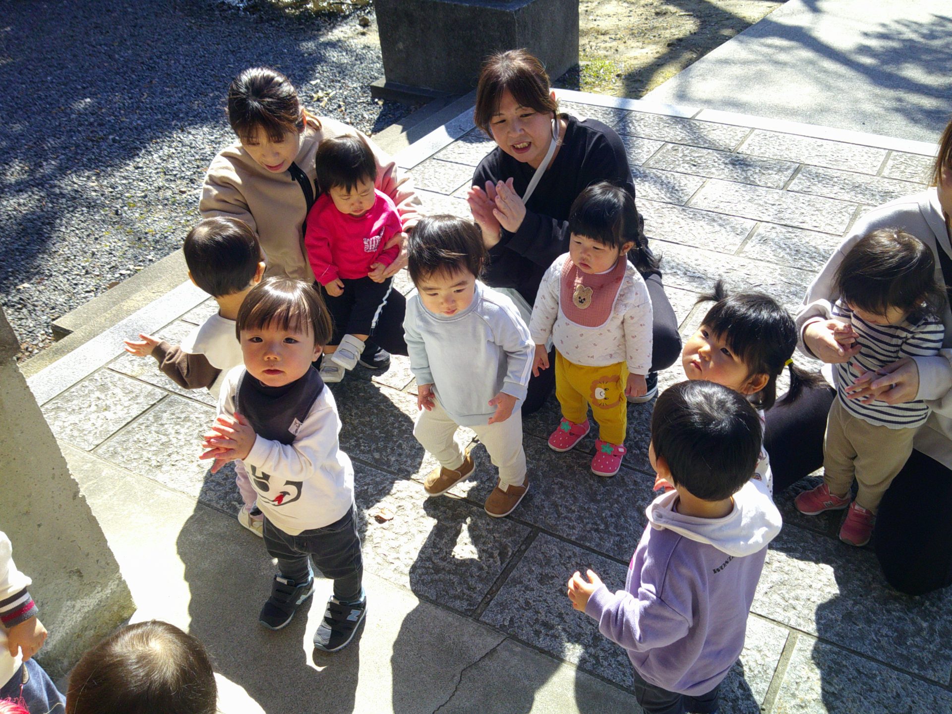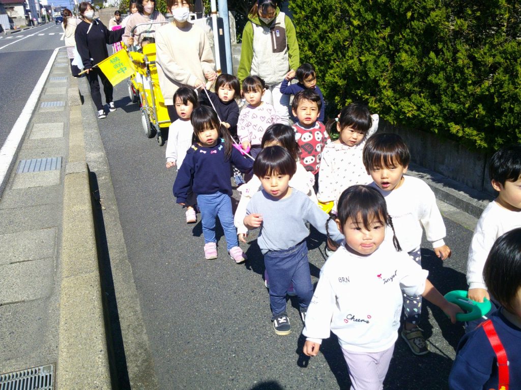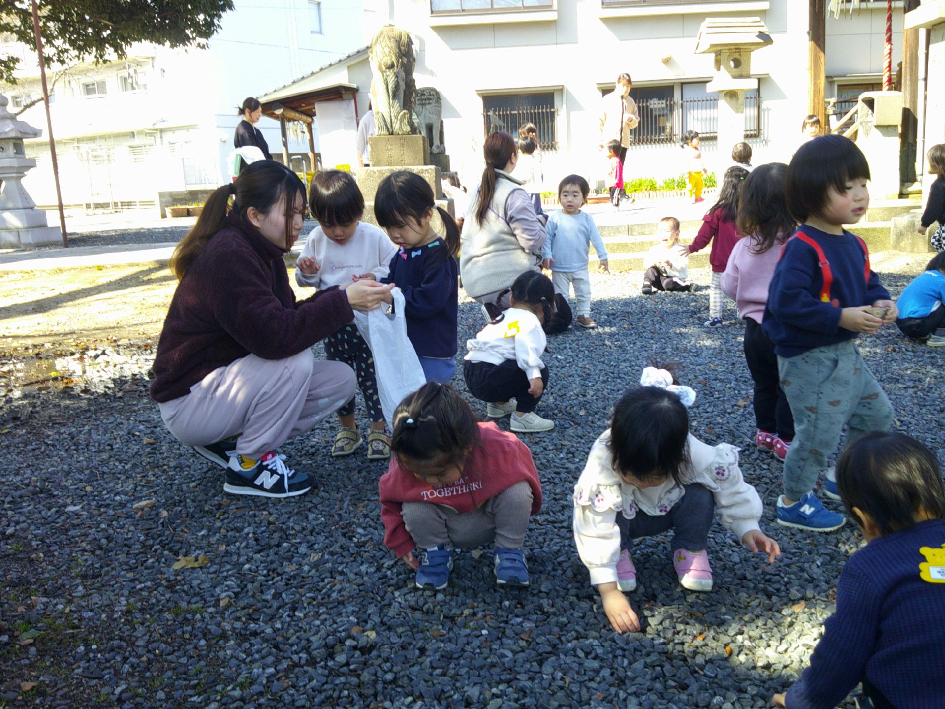 2026年03月17日 わくわく散歩✌ みかん組、いちご組で近隣の大森神社に誘導ロープを持って上手に歩いたり、避難車に乗ったりしながら行ってきました。どんぐりや葉っぱを探しながら楽しむ子ども達でしたよ☺