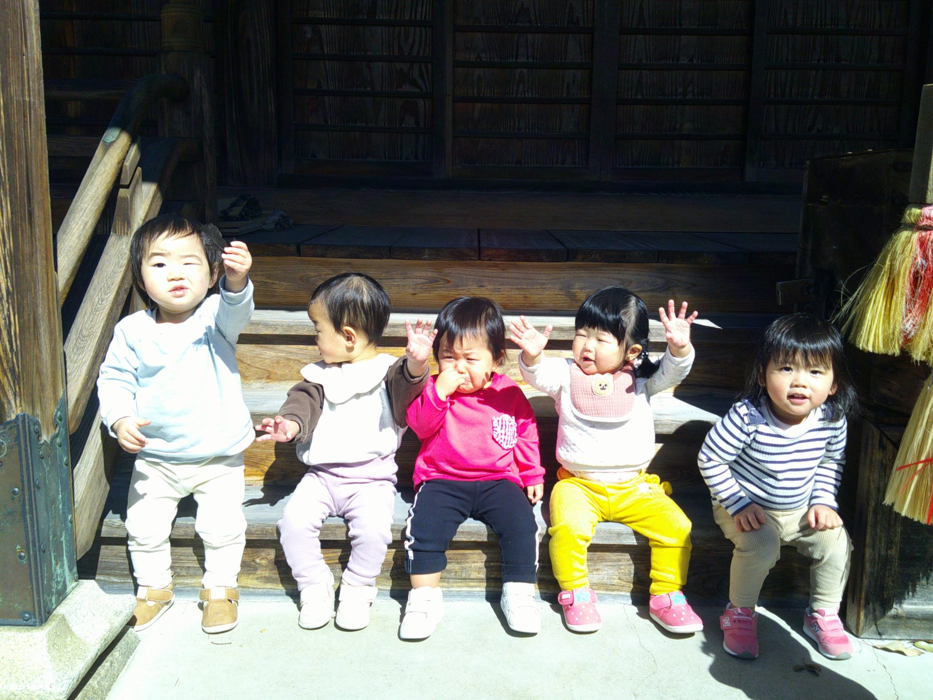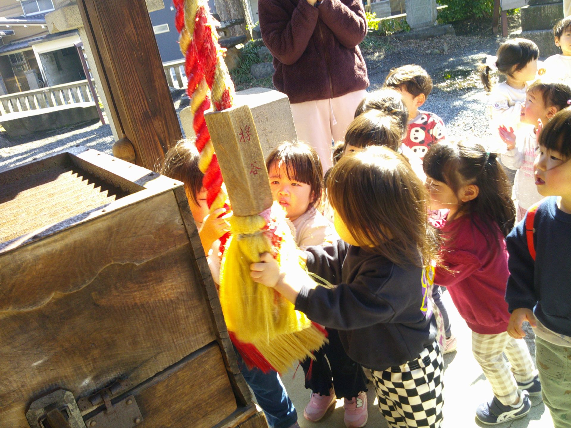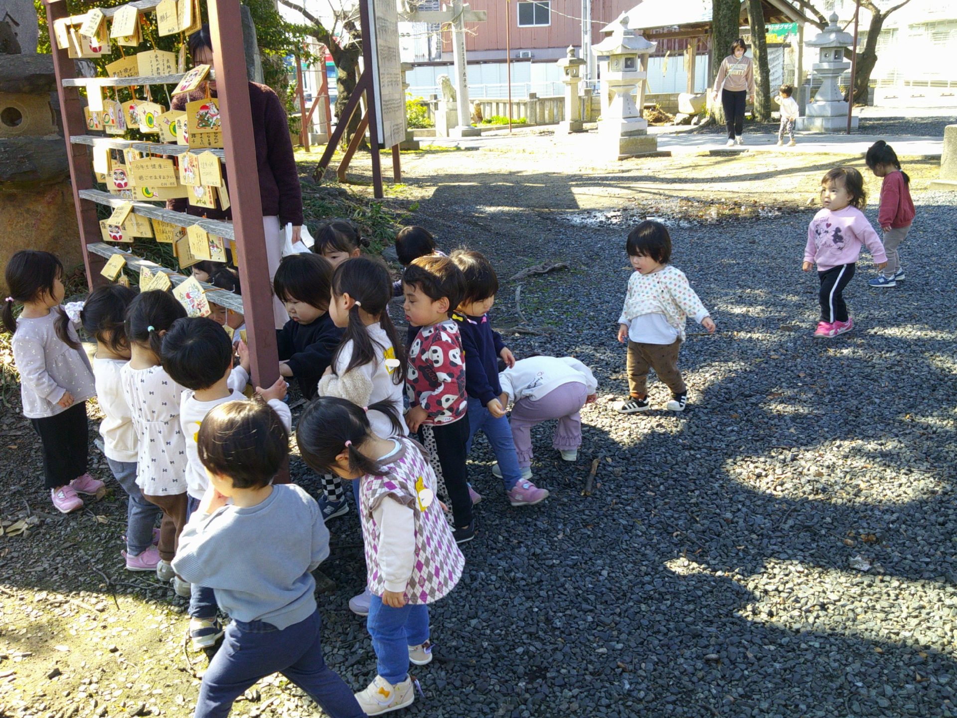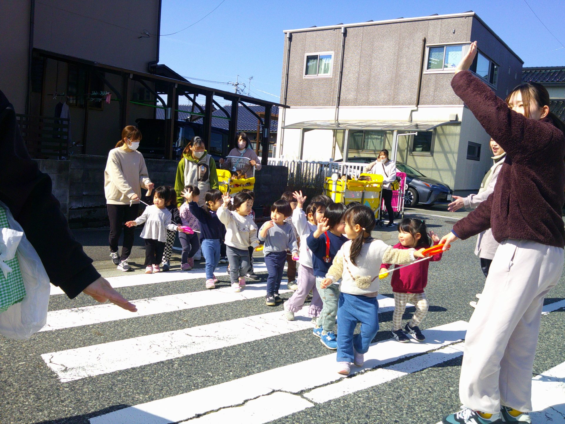 2026年03月17日 わくわく散歩✌ みかん組、いちご組で近隣の大森神社に誘導ロープを持って上手に歩いたり、避難車に乗ったりしながら行ってきました。どんぐりや葉っぱを探しながら楽しむ子ども達でしたよ☺