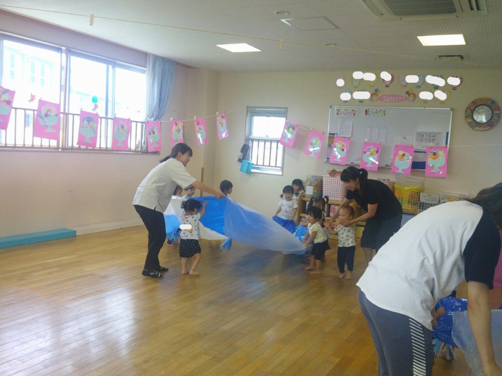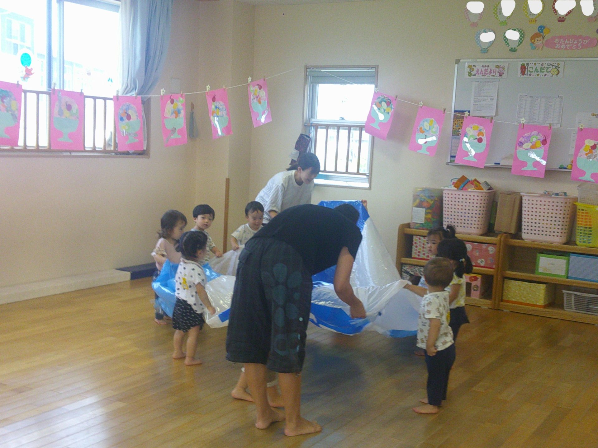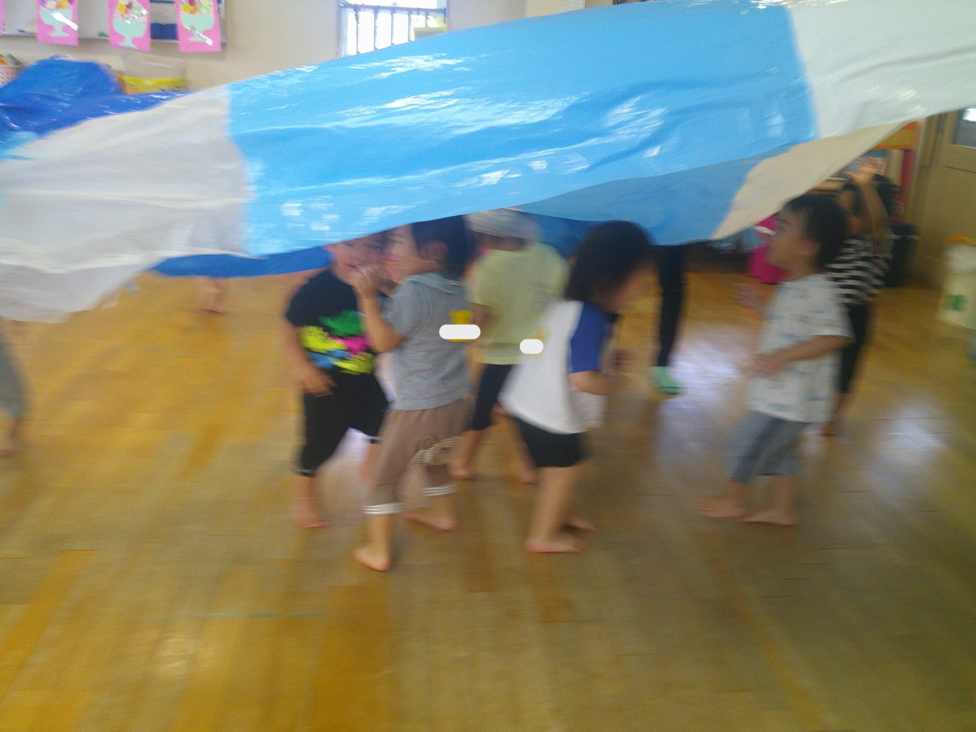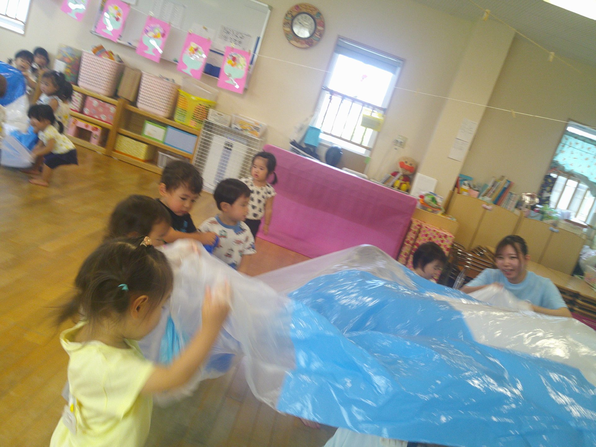 2025年08月06日 バルーンで遊んだよ! 今日はバルーンを海に見立てて遊びました。大きなバルーンをみんなで持ってバサバサ振ったり、優しく振ったりして楽しみました。「大きい!」「冷たい!」「うみ!」など声に出して喜ぶみかん組さんでした。また、バルーンを使って楽しんでいけたらなと思います!