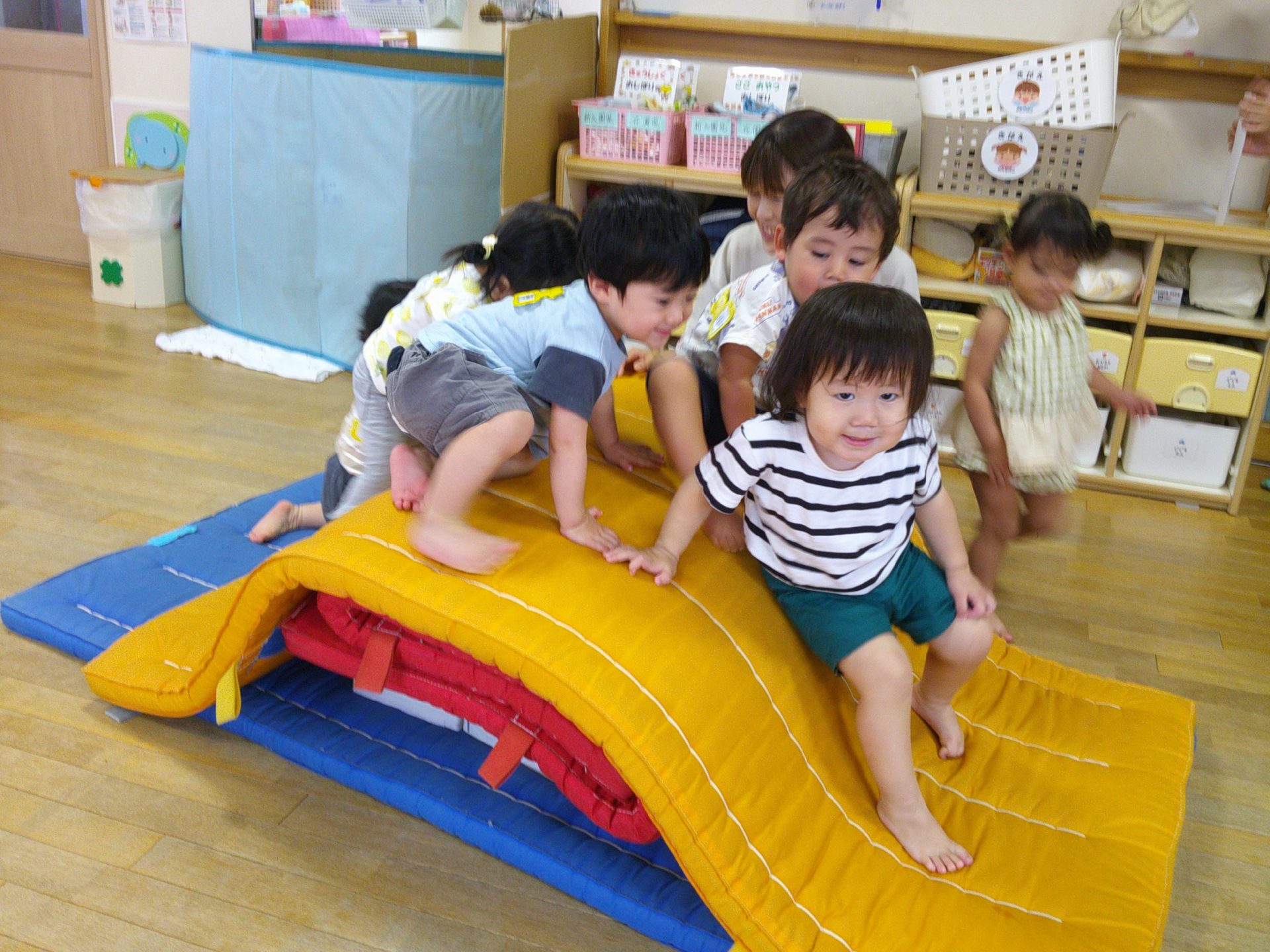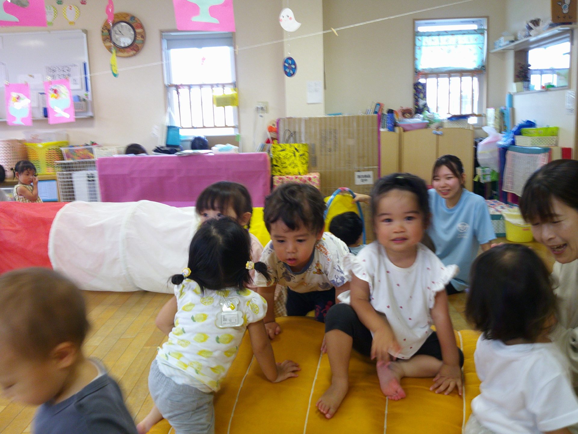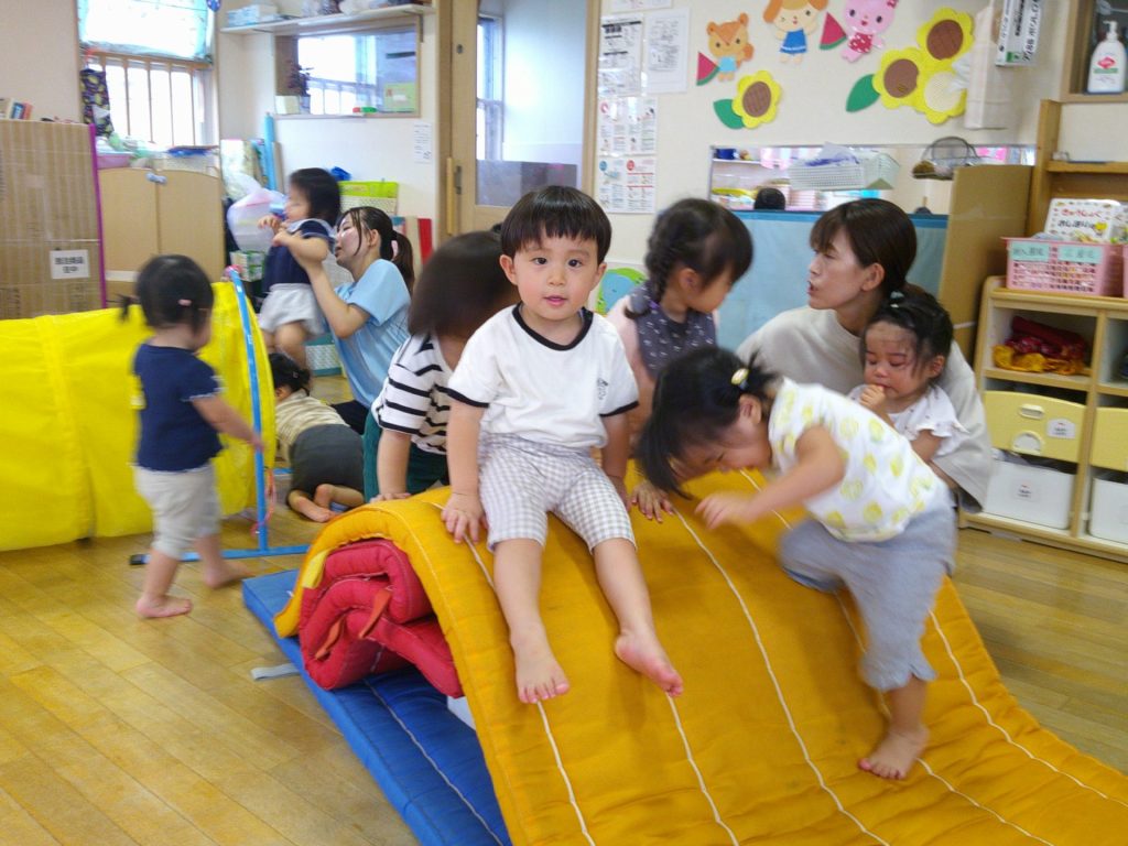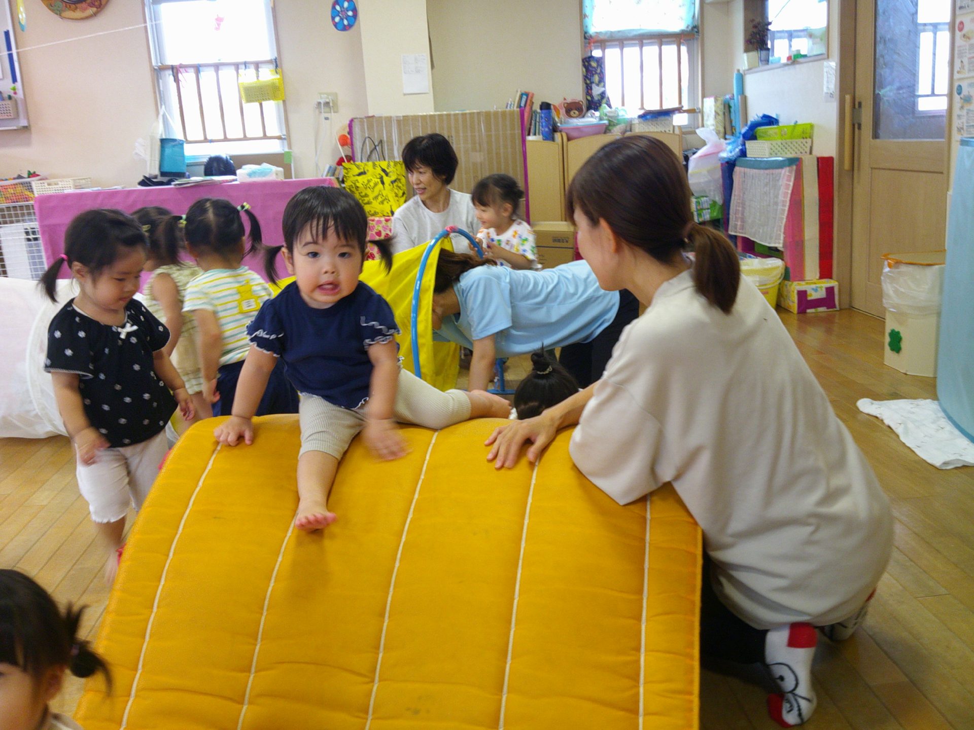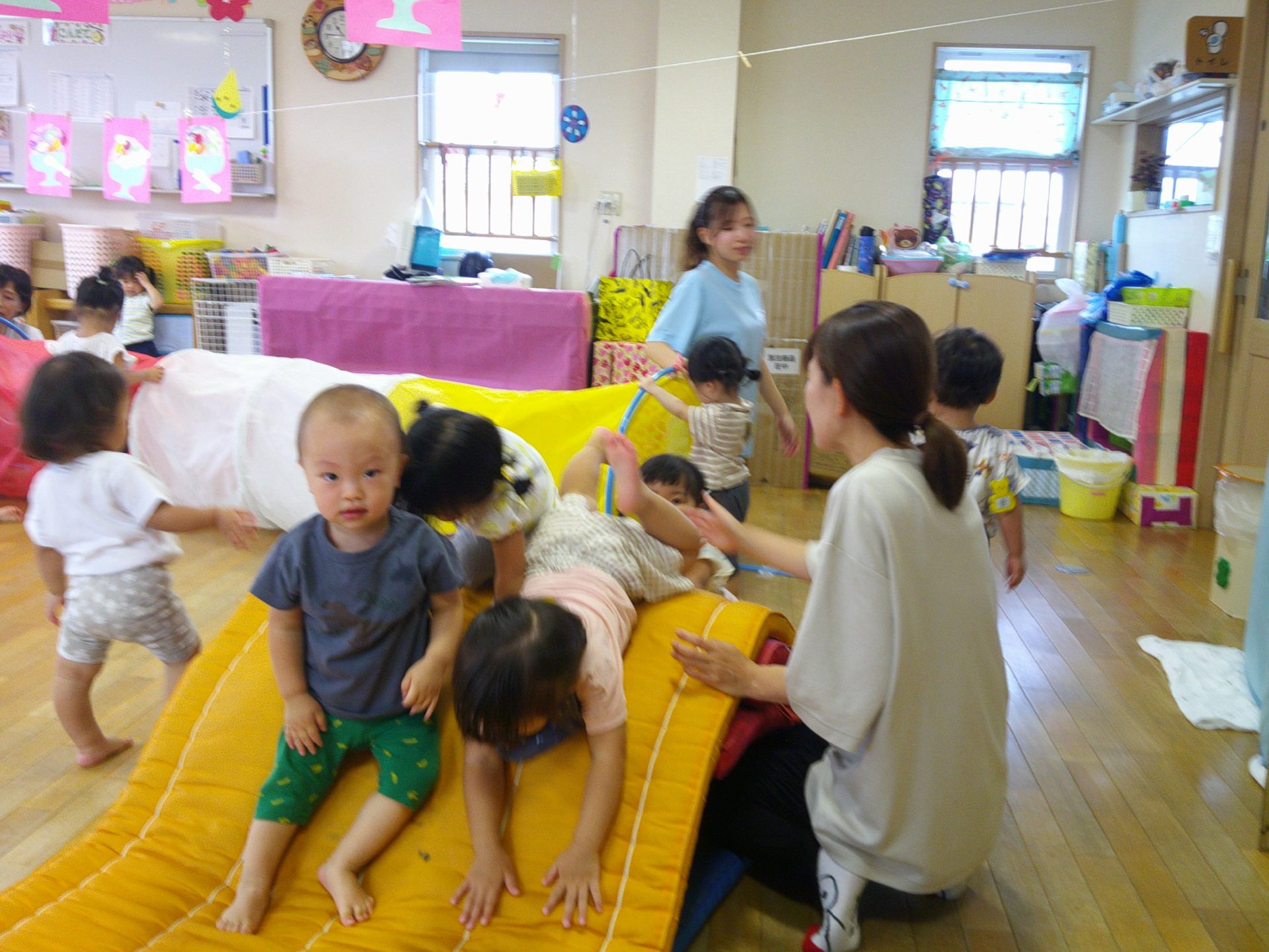 2025年08月06日 バルーンで遊んだよ! 今日はバルーンを海に見立てて遊びました。大きなバルーンをみんなで持ってバサバサ振ったり、優しく振ったりして楽しみました。「大きい!」「冷たい!」「うみ!」など声に出して喜ぶみかん組さんでした。また、バルーンを使って楽しんでいけたらなと思います!