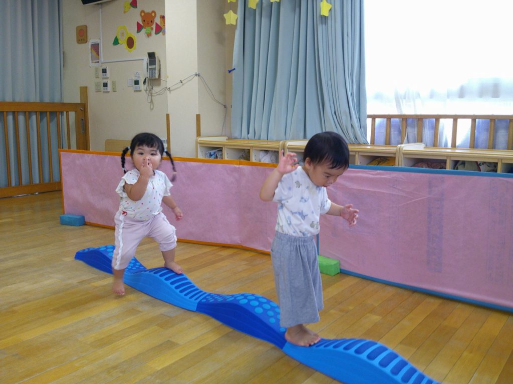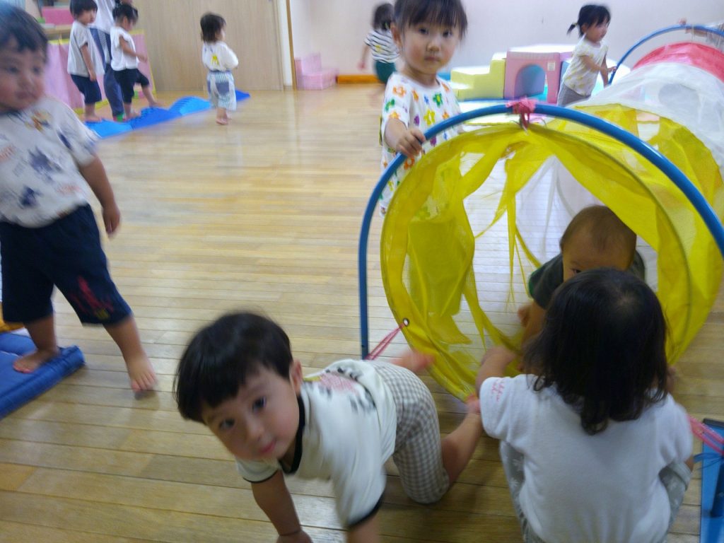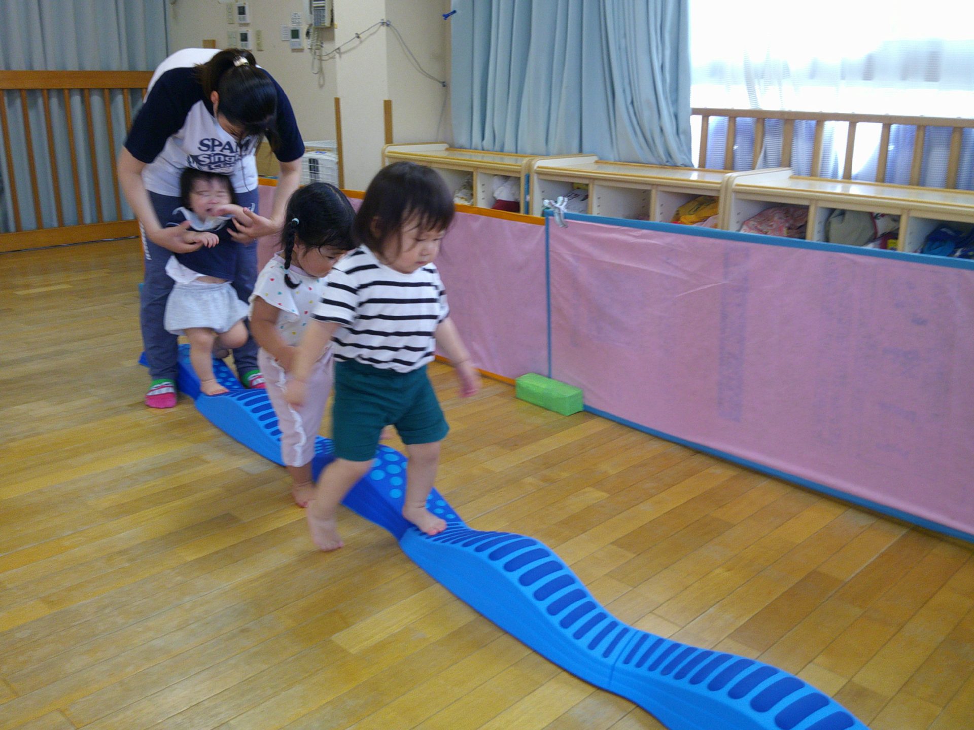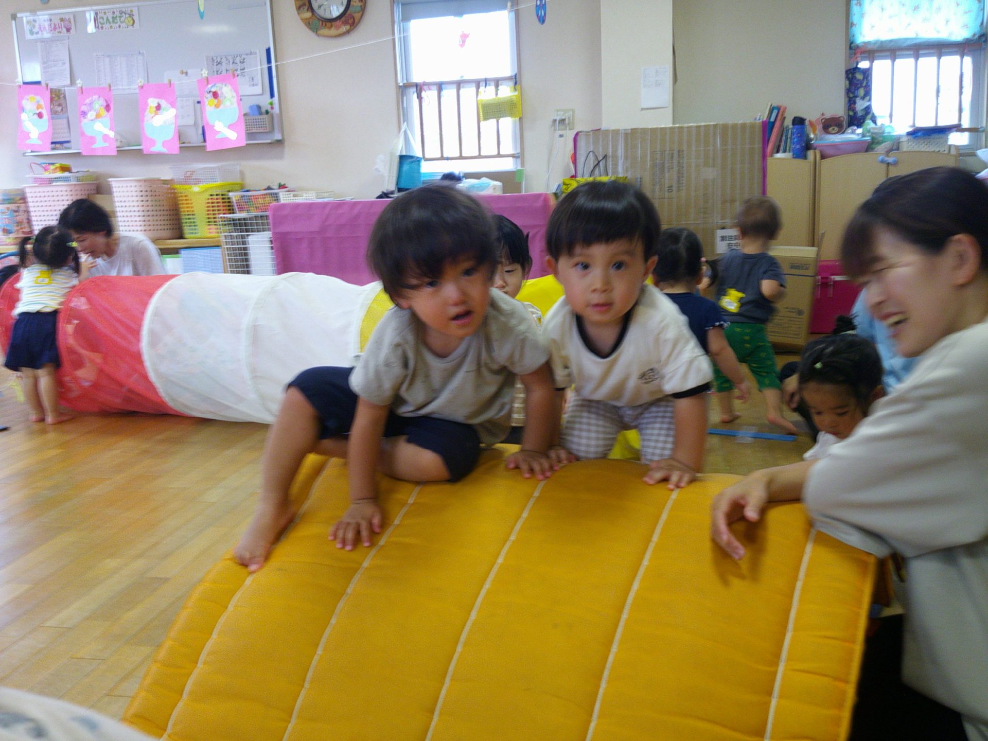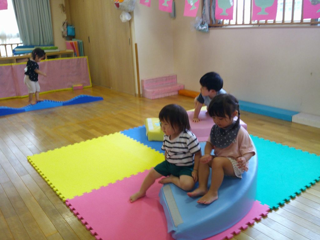 2025年08月06日 バルーンで遊んだよ! 今日はバルーンを海に見立てて遊びました。大きなバルーンをみんなで持ってバサバサ振ったり、優しく振ったりして楽しみました。「大きい!」「冷たい!」「うみ!」など声に出して喜ぶみかん組さんでした。また、バルーンを使って楽しんでいけたらなと思います!