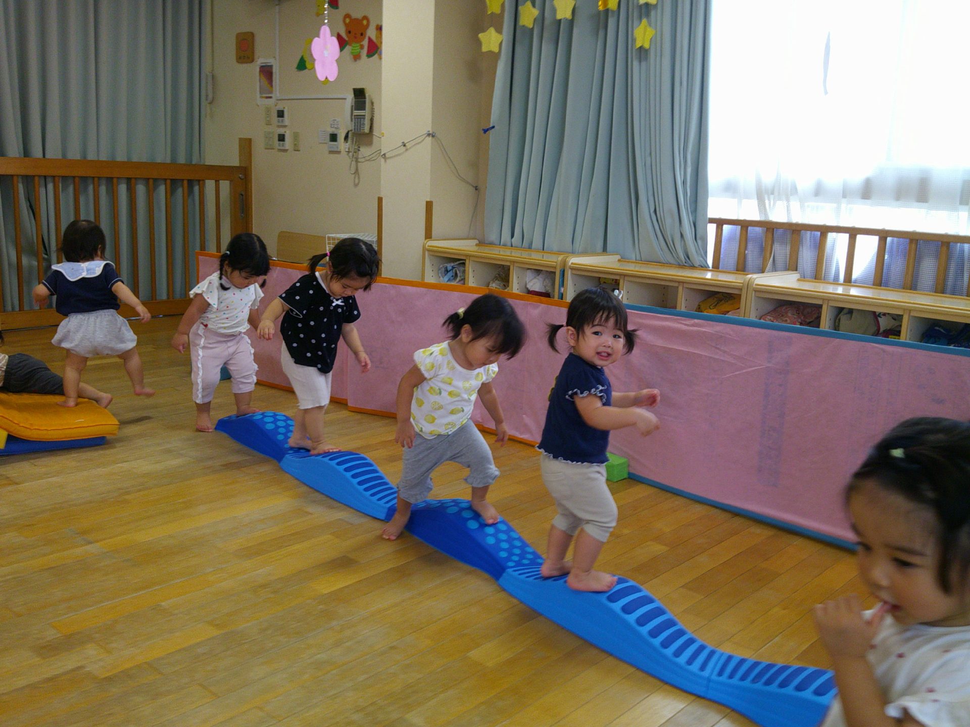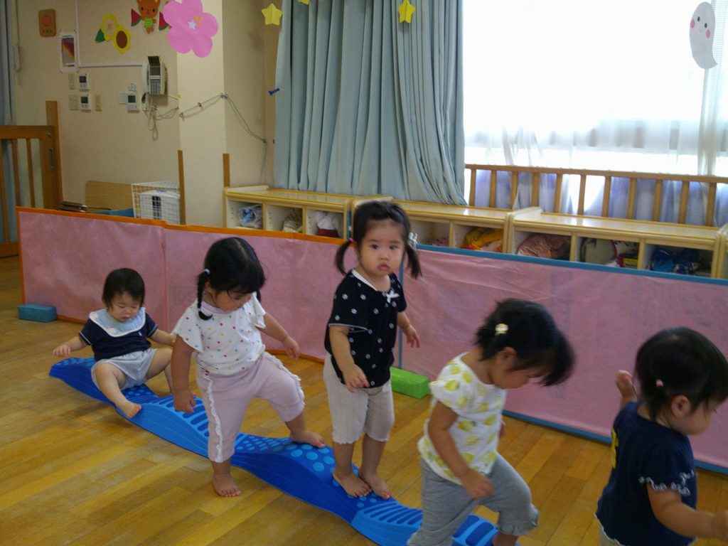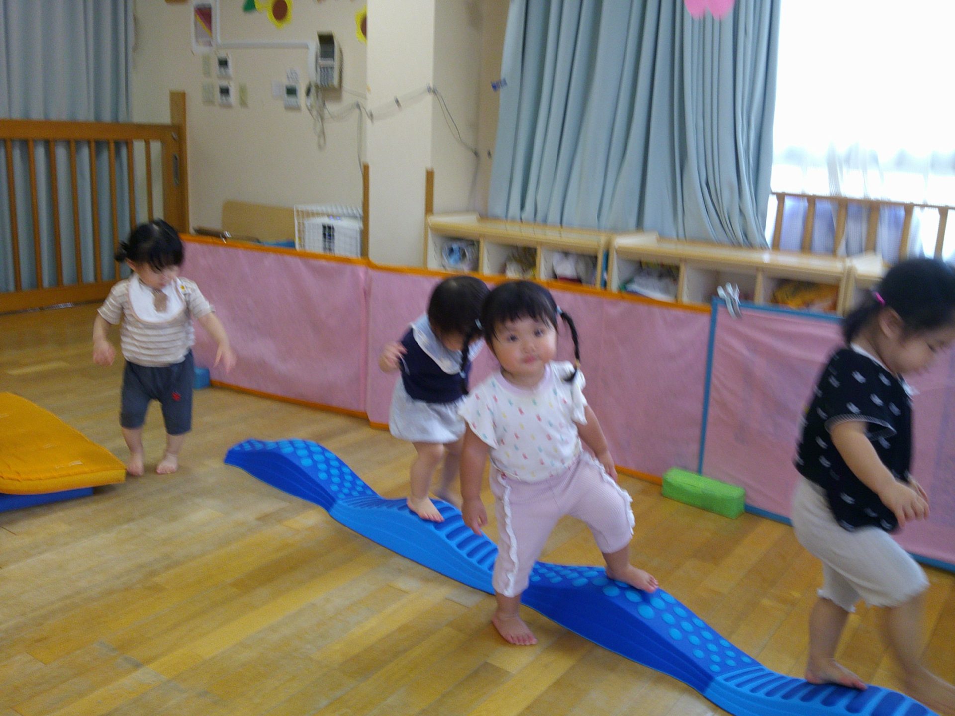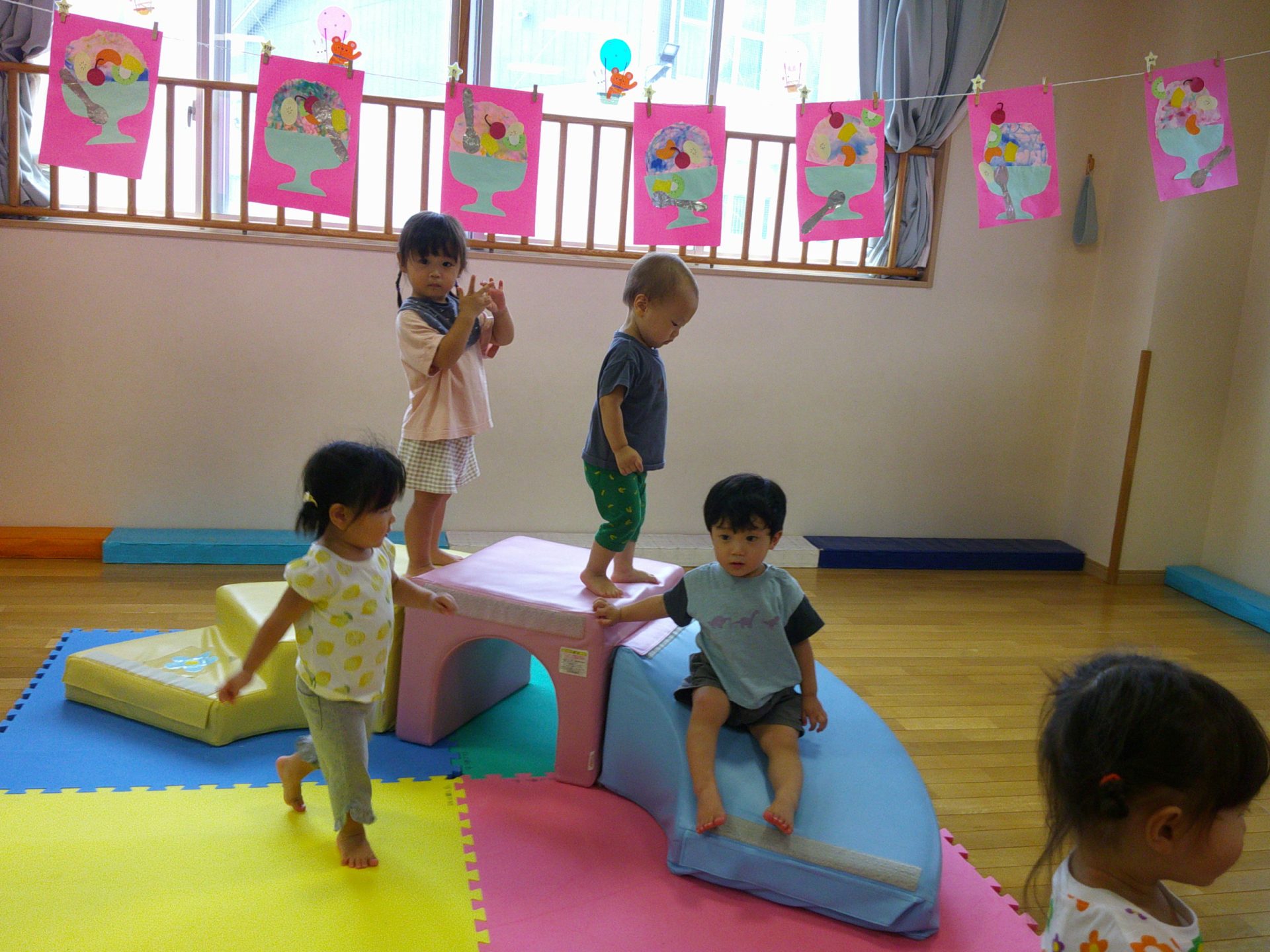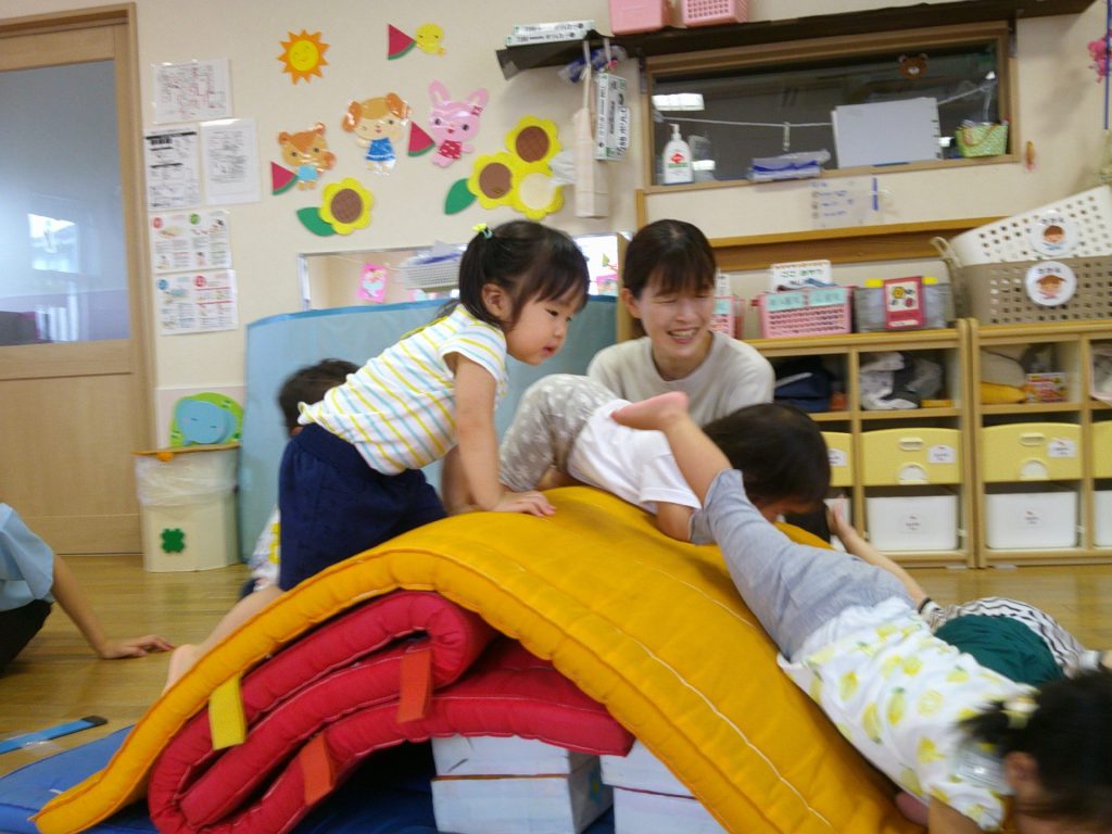 2025年08月06日 バルーンで遊んだよ! 今日はバルーンを海に見立てて遊びました。大きなバルーンをみんなで持ってバサバサ振ったり、優しく振ったりして楽しみました。「大きい!」「冷たい!」「うみ!」など声に出して喜ぶみかん組さんでした。また、バルーンを使って楽しんでいけたらなと思います!