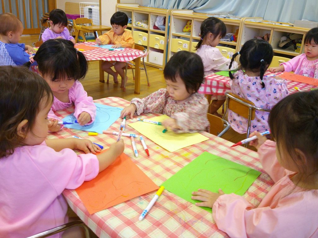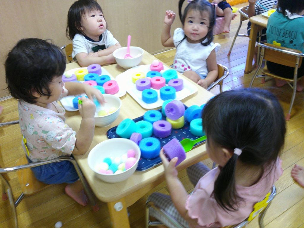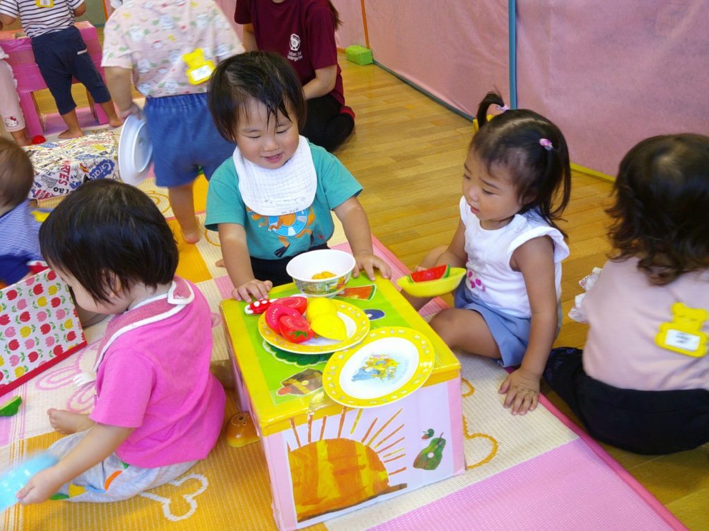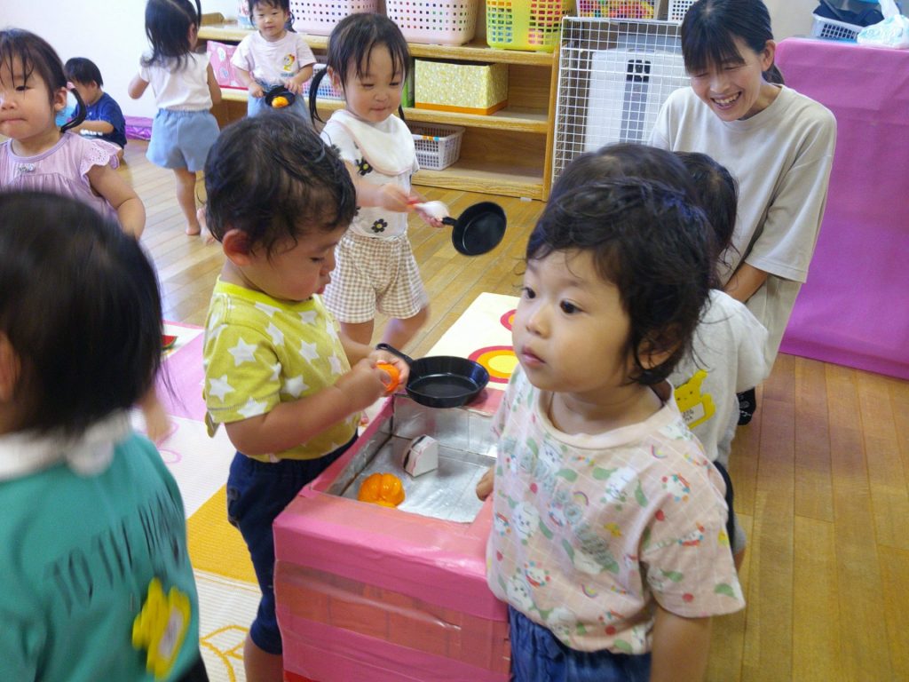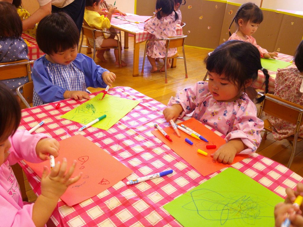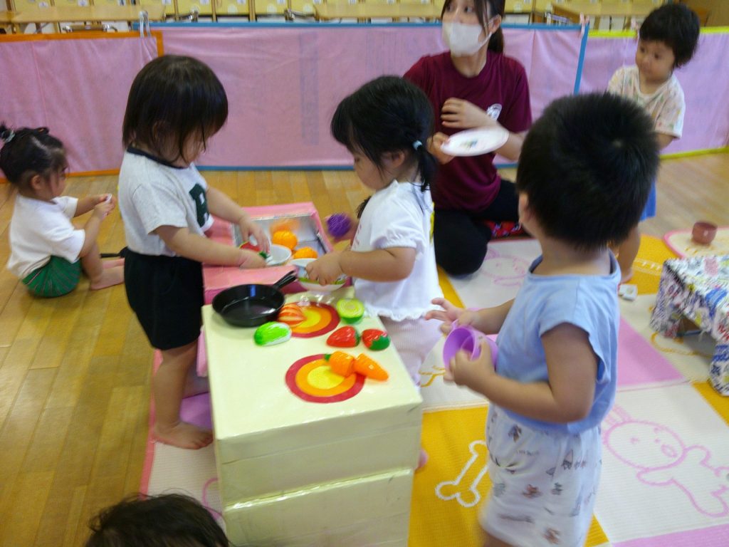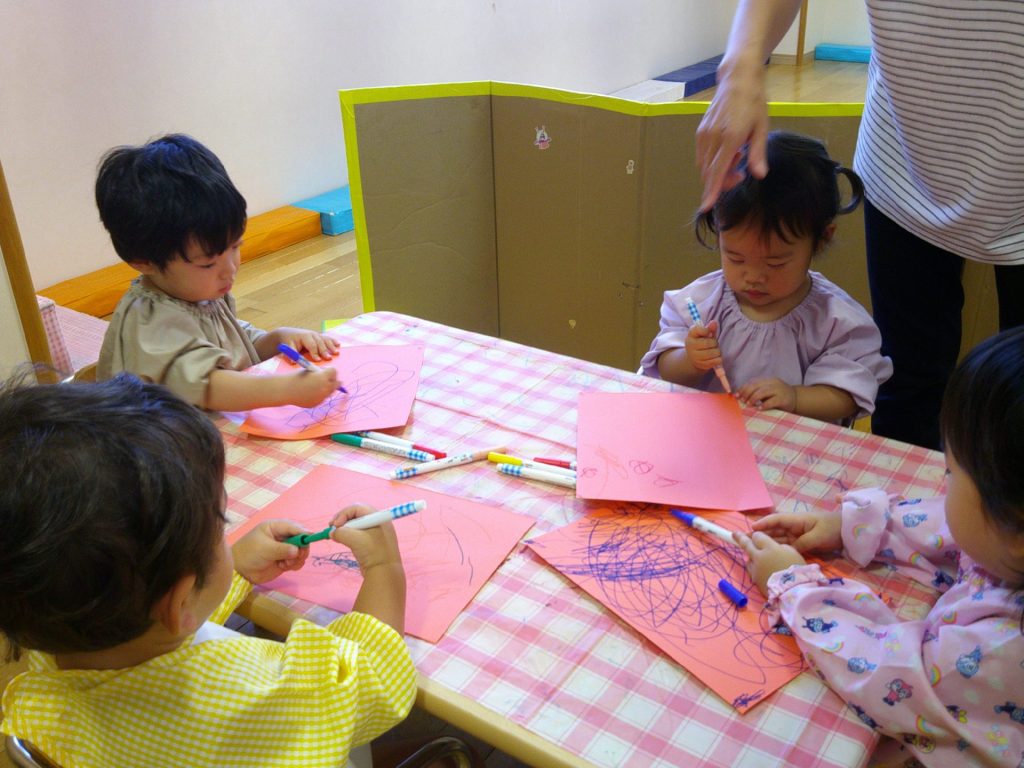 2025年08月20日 お絵描き・おままごと 子ども達の今週の様子です。お絵描きでは紙いっぱいにかけるようになっていたり、丸がかける子供も数人いました。色の名前を言って楽しんでいました。ままごと遊びではお皿に上手にごちそうをのせたり、テーブルを囲んで楽しく食べる姿が見られました。