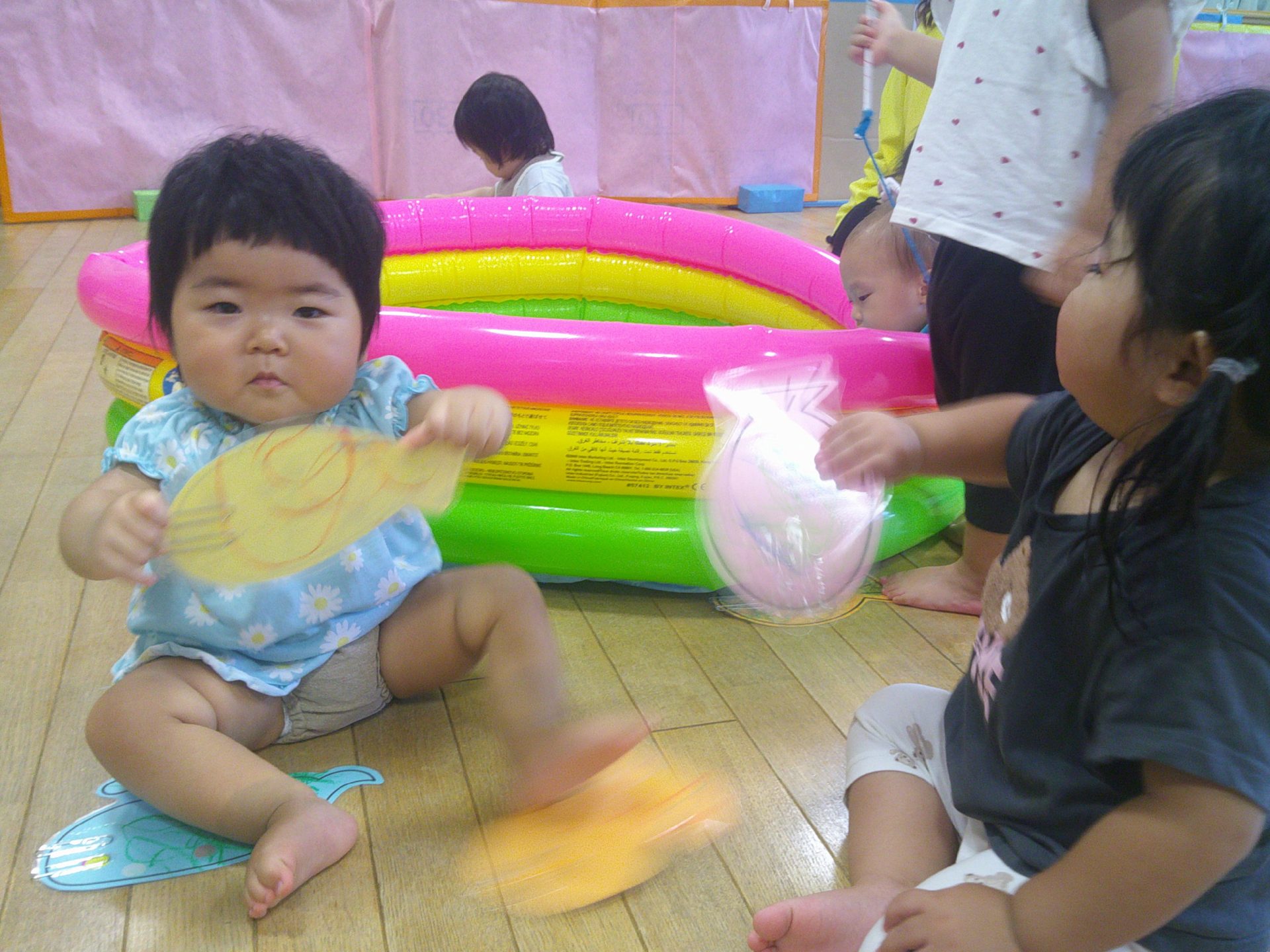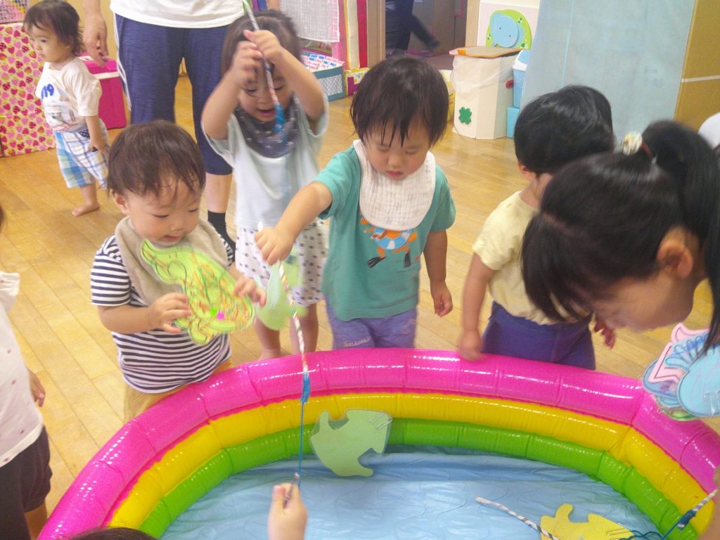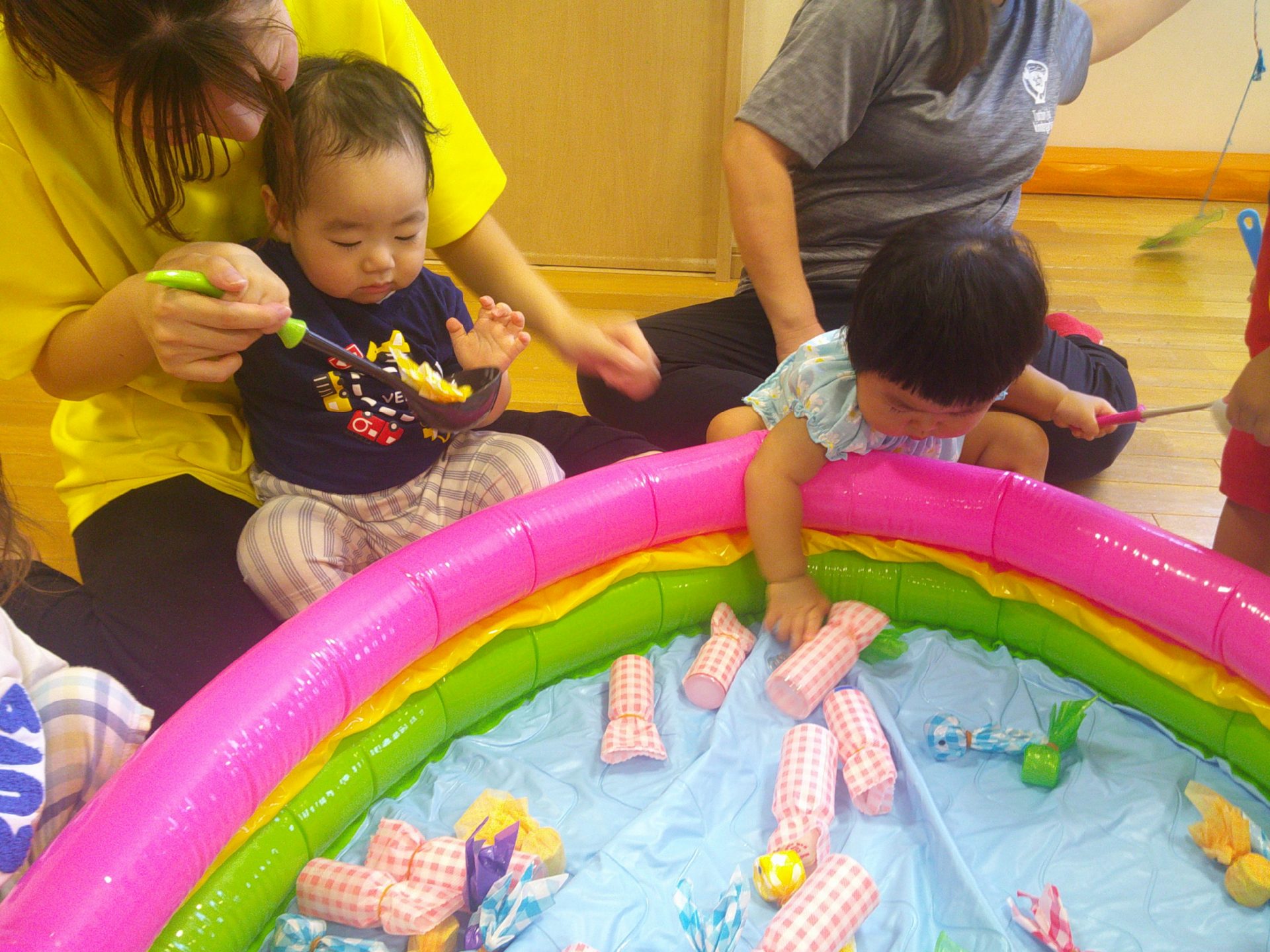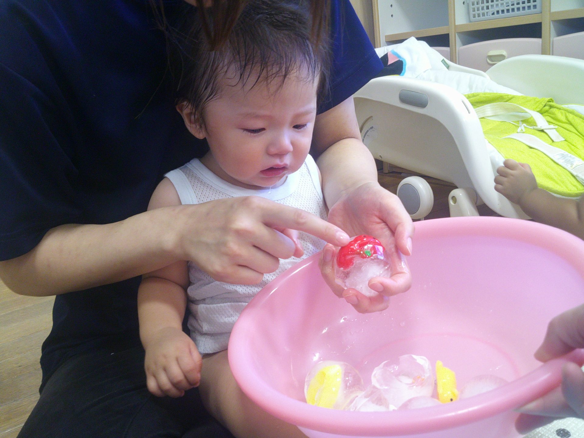 2025年07月31日 最近のいちご組の様子 今週から新しいお友達が増えて、いちご組は6名になりました。 暑い日が続いていて、プール遊びはできていませんが、お部屋で先生やお友達と色々な遊びを楽しんでいます。今週は、氷で作ったバスボールの中から出てくるおもちゃを触って遊んだり、みかん組のお友達と一緒に魚釣りと魚すくいをしたりして楽しみました♪
