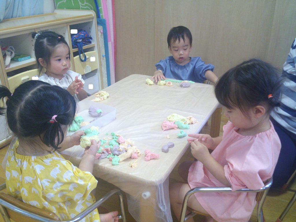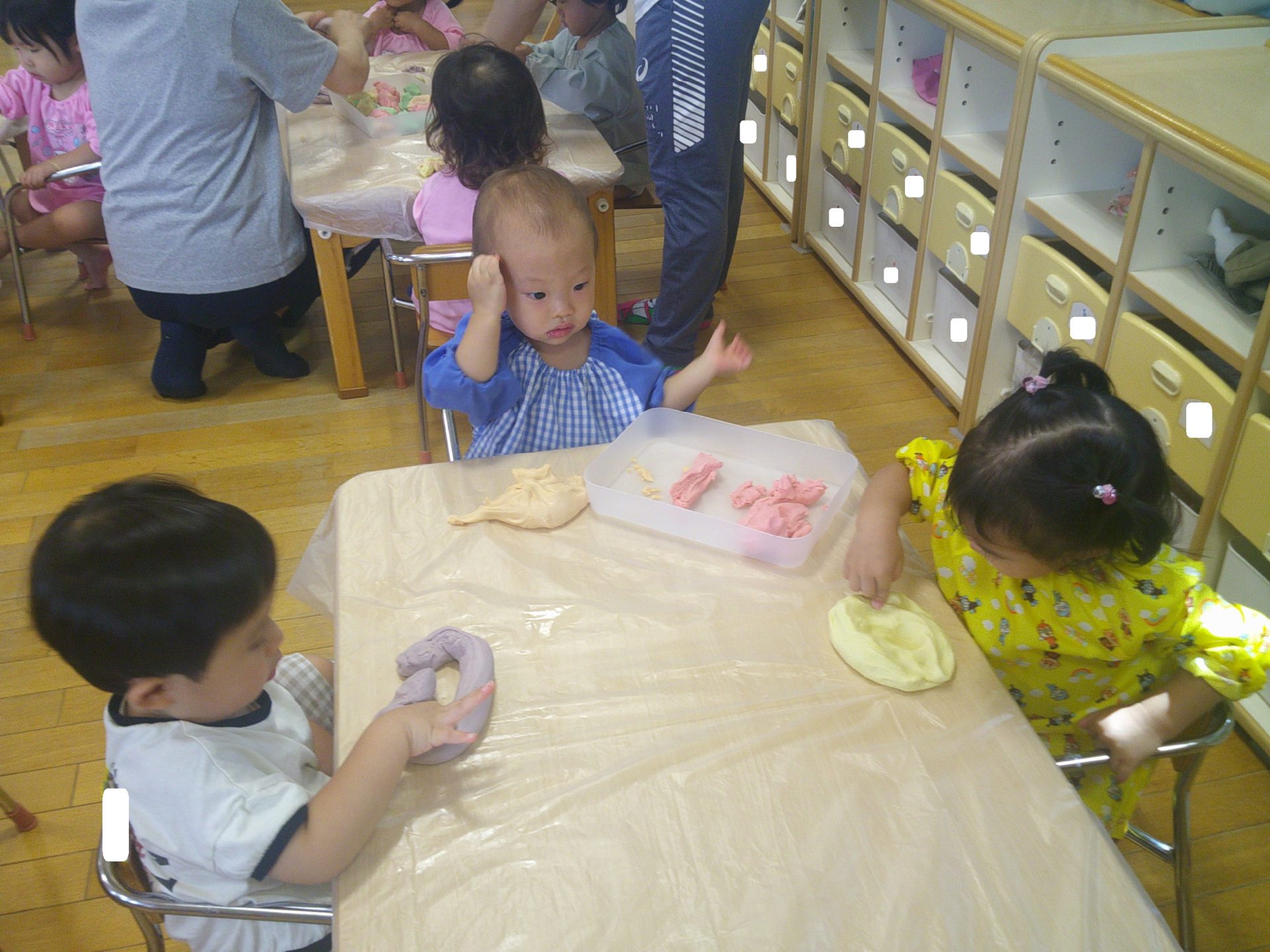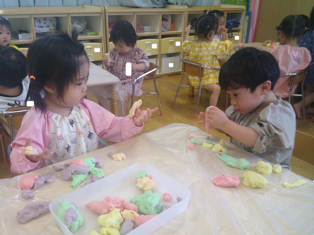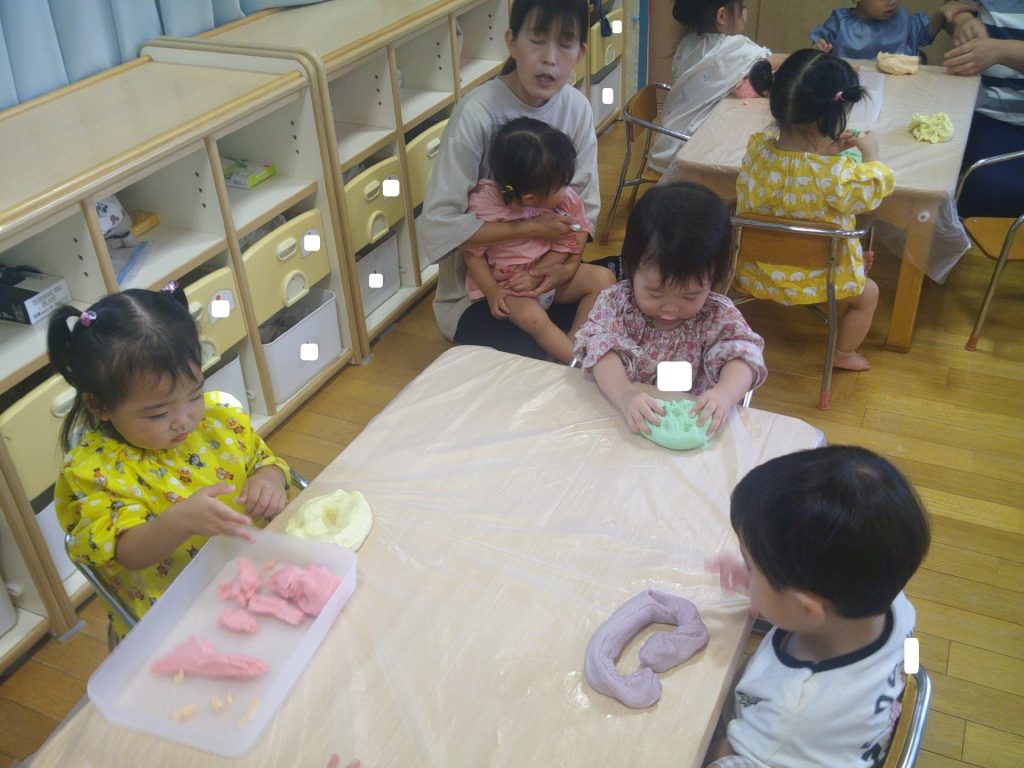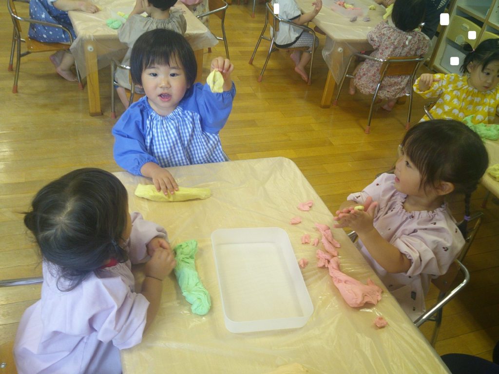 2025年08月04日 小麦粉粘土で遊んだよ! ピンク、オレンジ、黄色、黄緑、紫色の小麦粉粘土を使って遊びました。初めての感触に少し戸惑う様子もありましたが、指でちょんちょんとつついてみたり、びよ~んと伸ばしてみたり、プチっとちぎってみたりしながら思い思いに楽しむみかん組の子ども達でした。「冷たーい!」やムニムニなど、いろいろな感触を感じる声もたくさん聞かれましたよ😄⭐