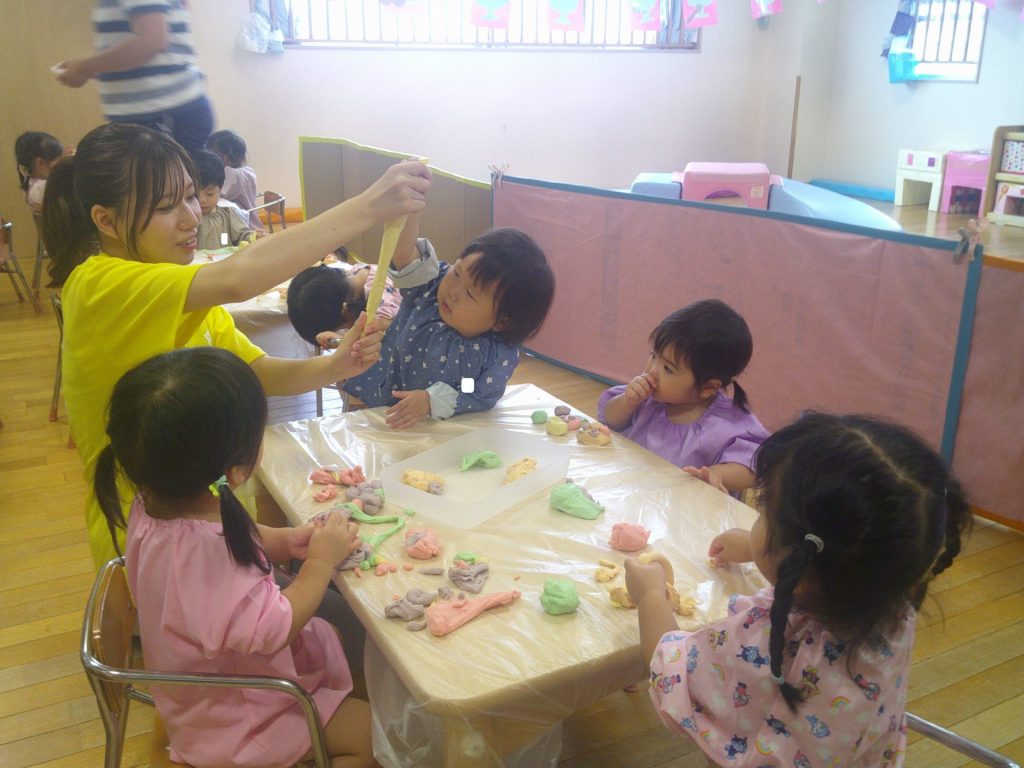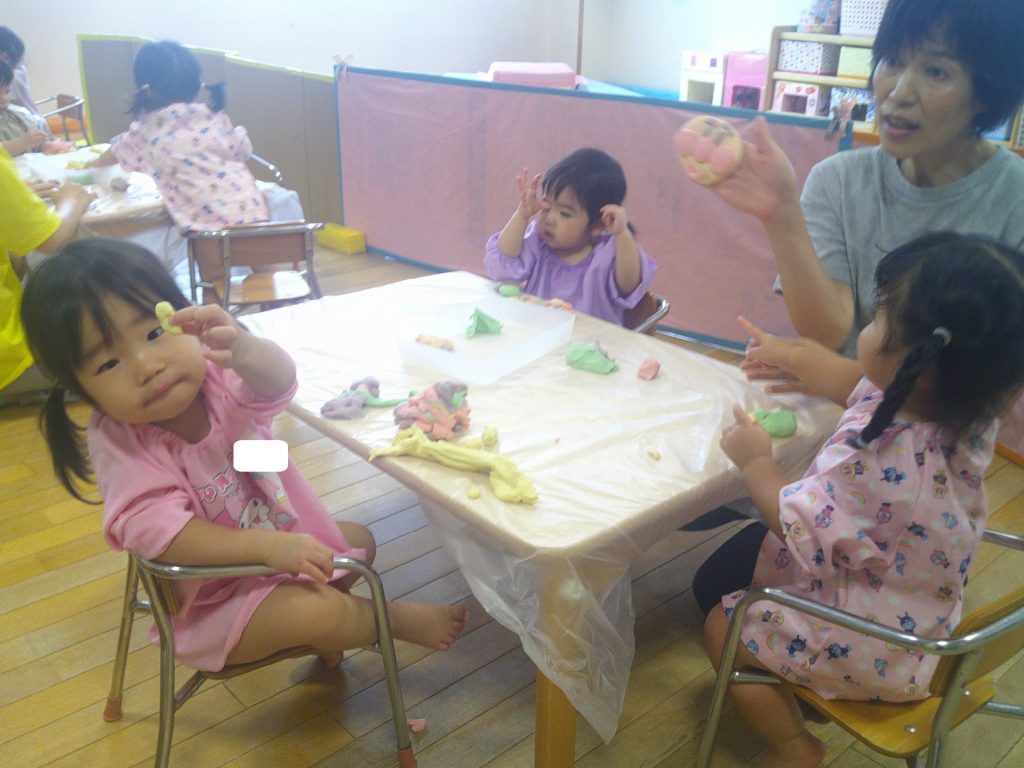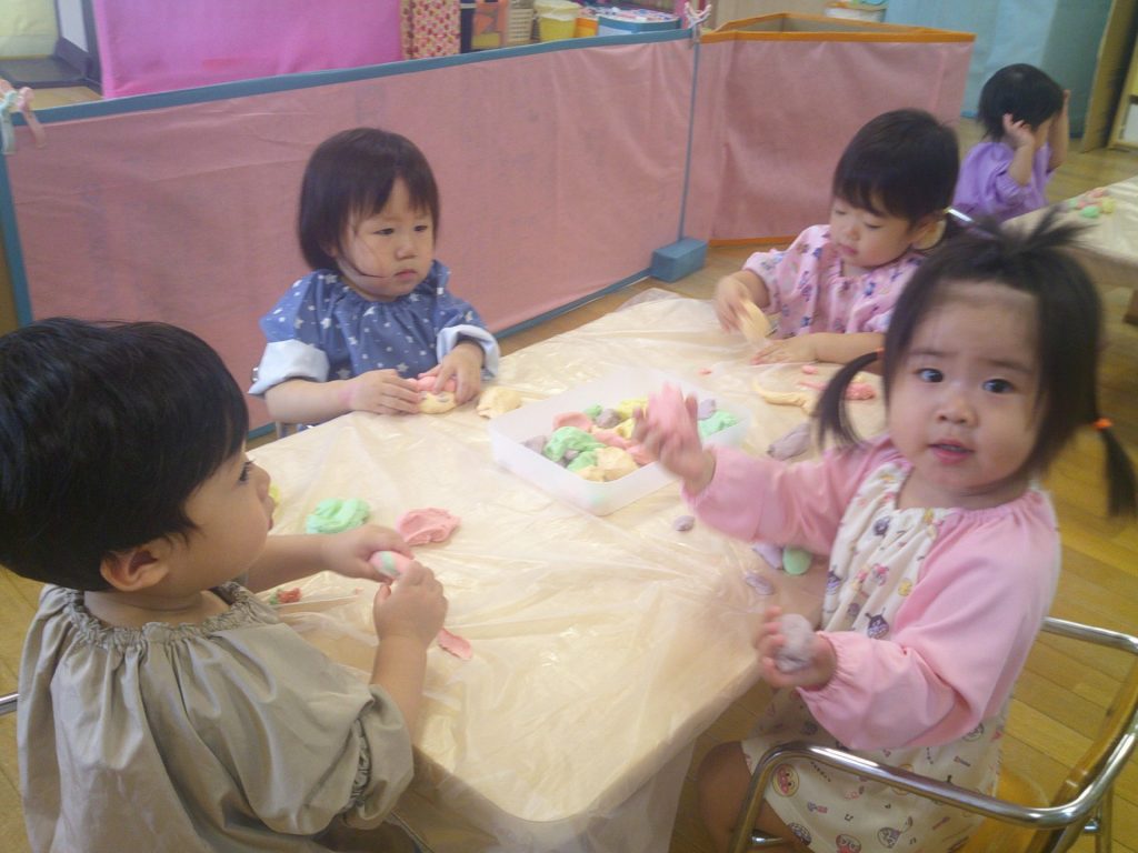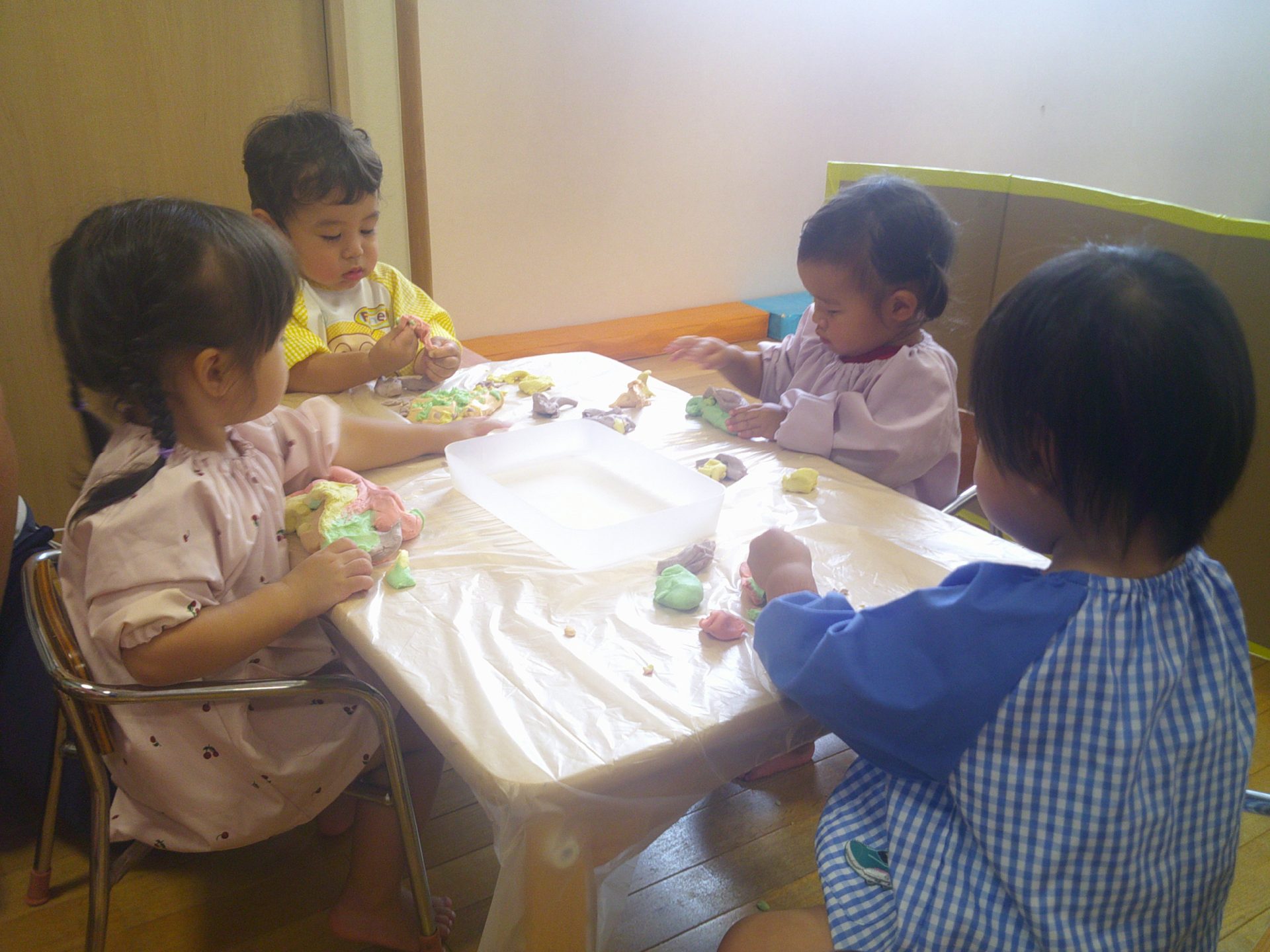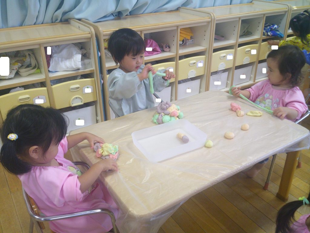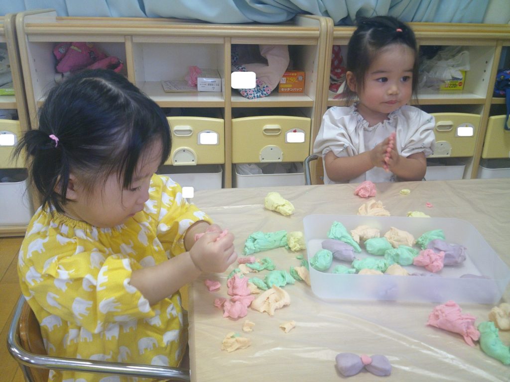 2025年08月04日 小麦粉粘土で遊んだよ! ピンク、オレンジ、黄色、黄緑、紫色の小麦粉粘土を使って遊びました。初めての感触に少し戸惑う様子もありましたが、指でちょんちょんとつついてみたり、びよ~んと伸ばしてみたり、プチっとちぎってみたりしながら思い思いに楽しむみかん組の子ども達でした。「冷たーい!」やムニムニなど、いろいろな感触を感じる声もたくさん聞かれましたよ😄⭐
