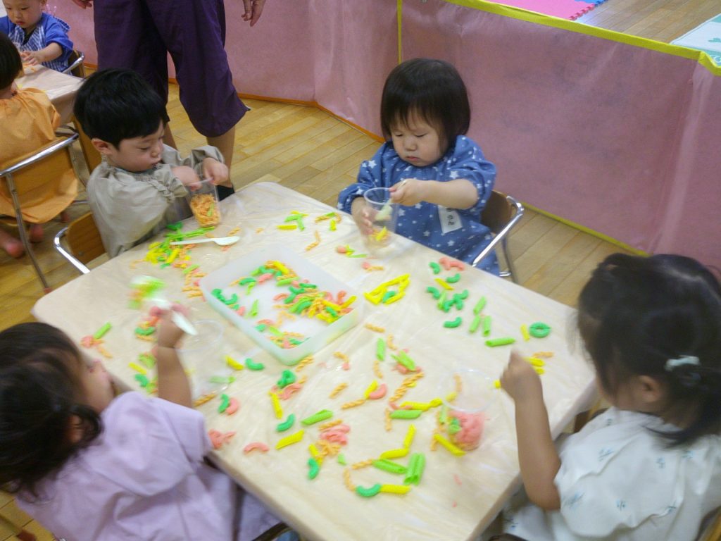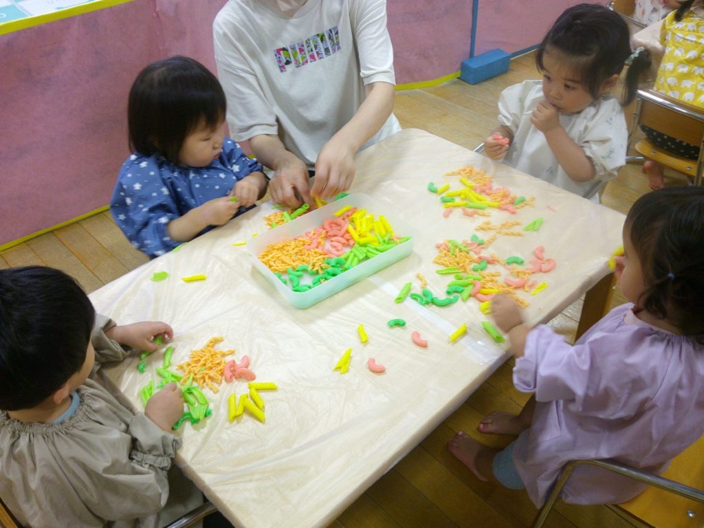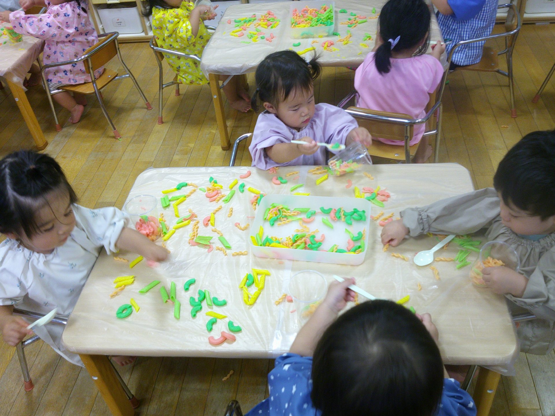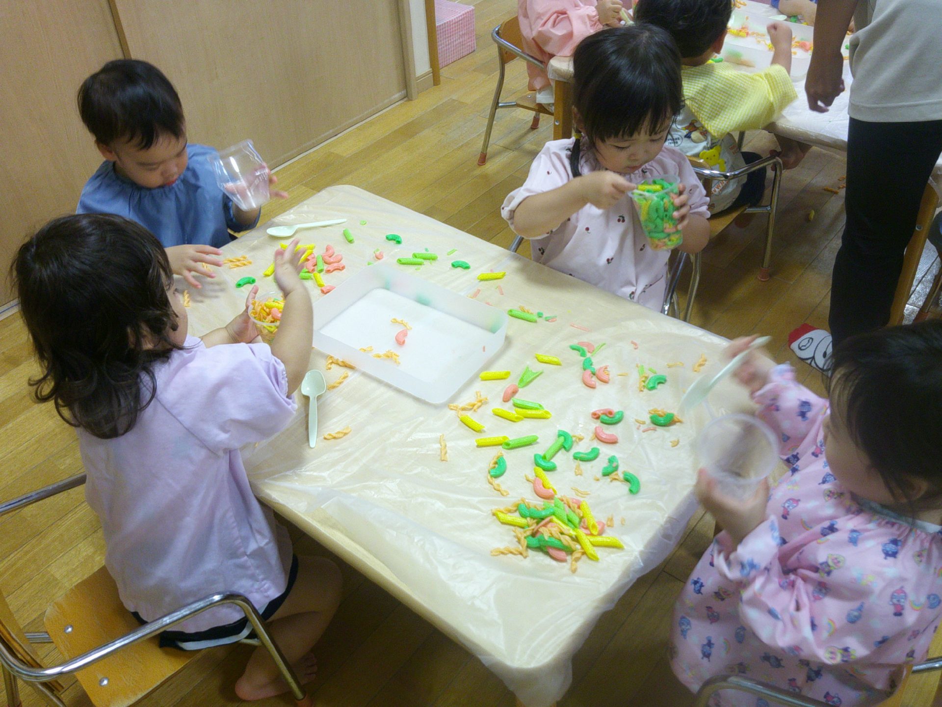 2025年07月16日 感触あそび「マカロニ」 今日は、マカロニを指でつついたり、手で触ったり、握ったり、ちぎったり・・感触を楽しんだ後に、手でつかんだり、スプーンですくったりしてカップに入れて楽しみました。