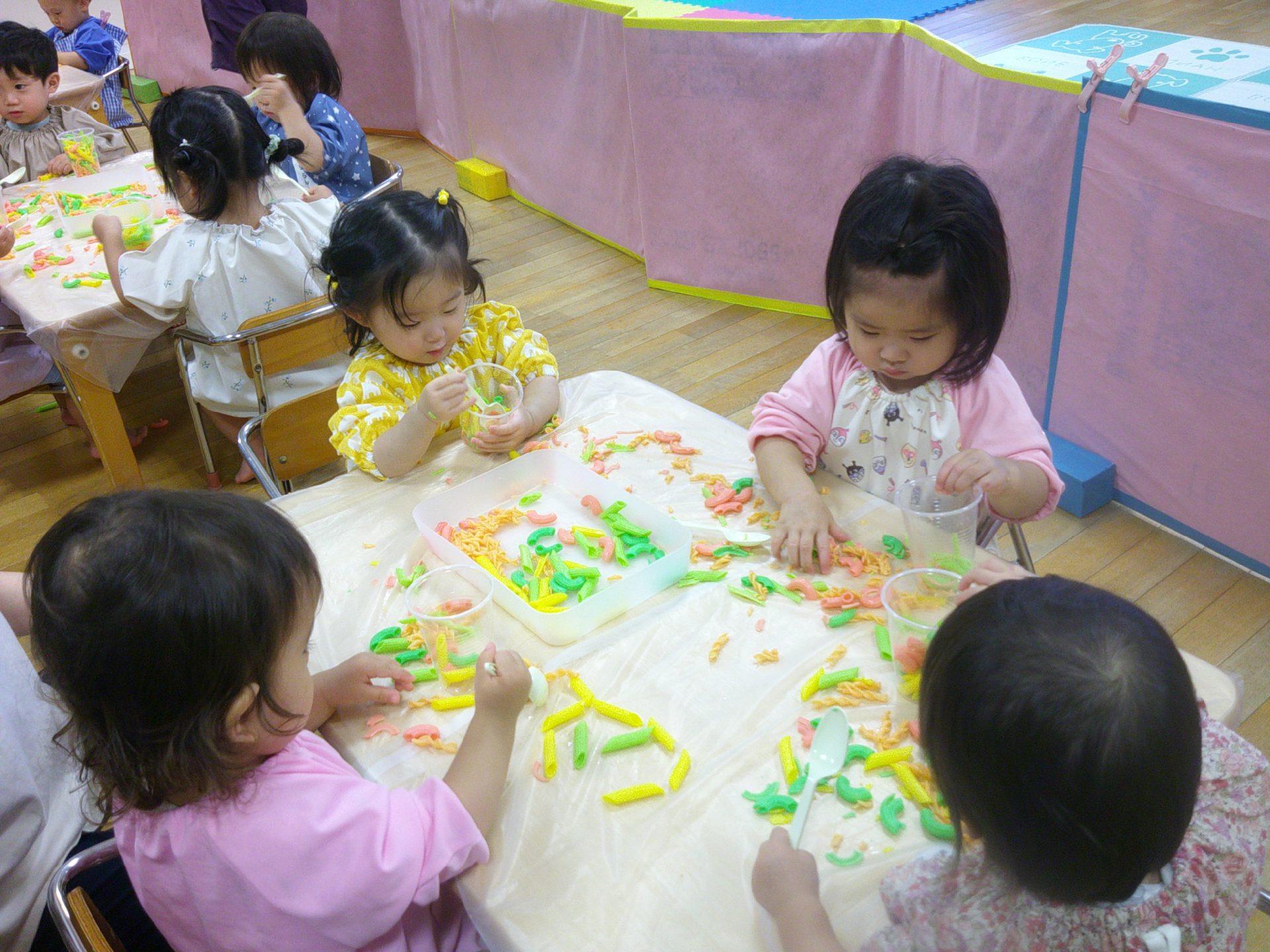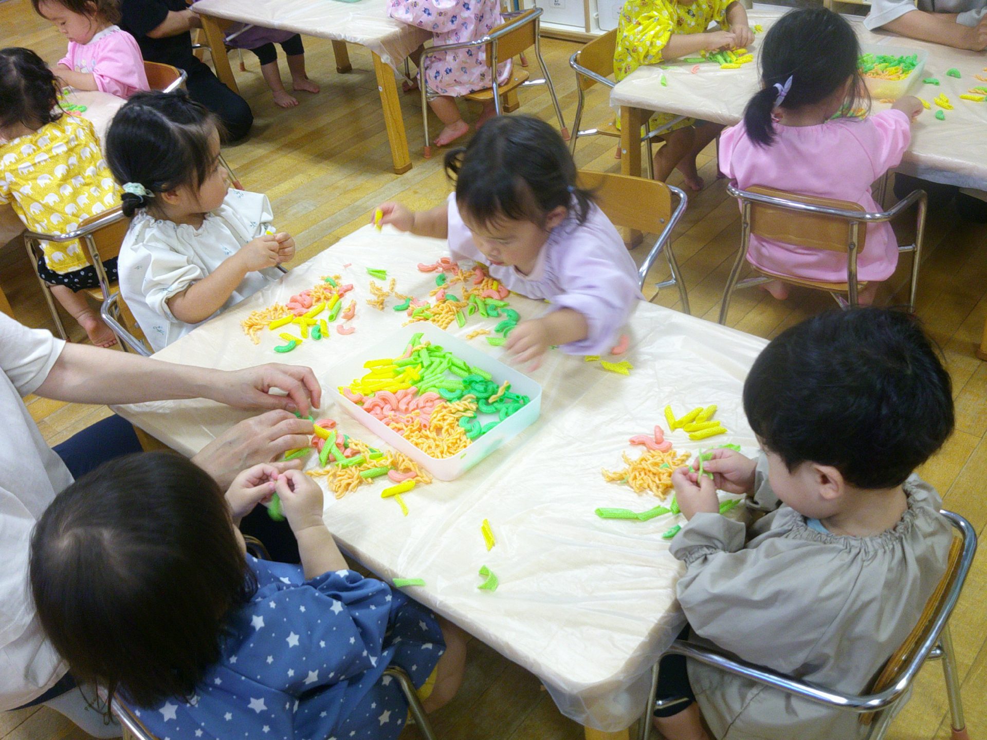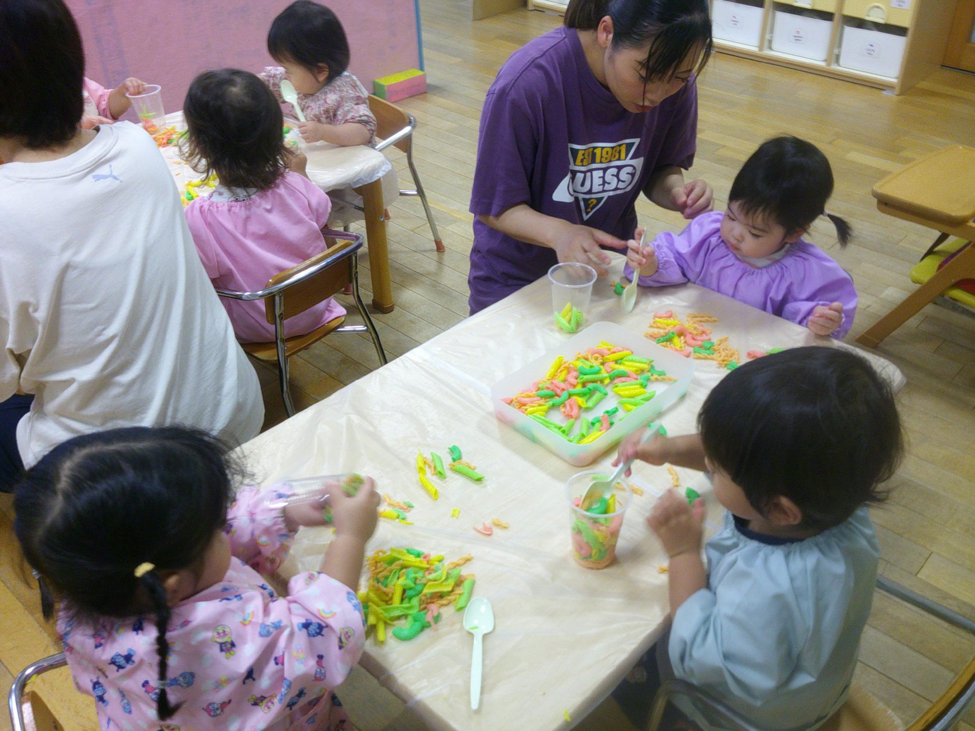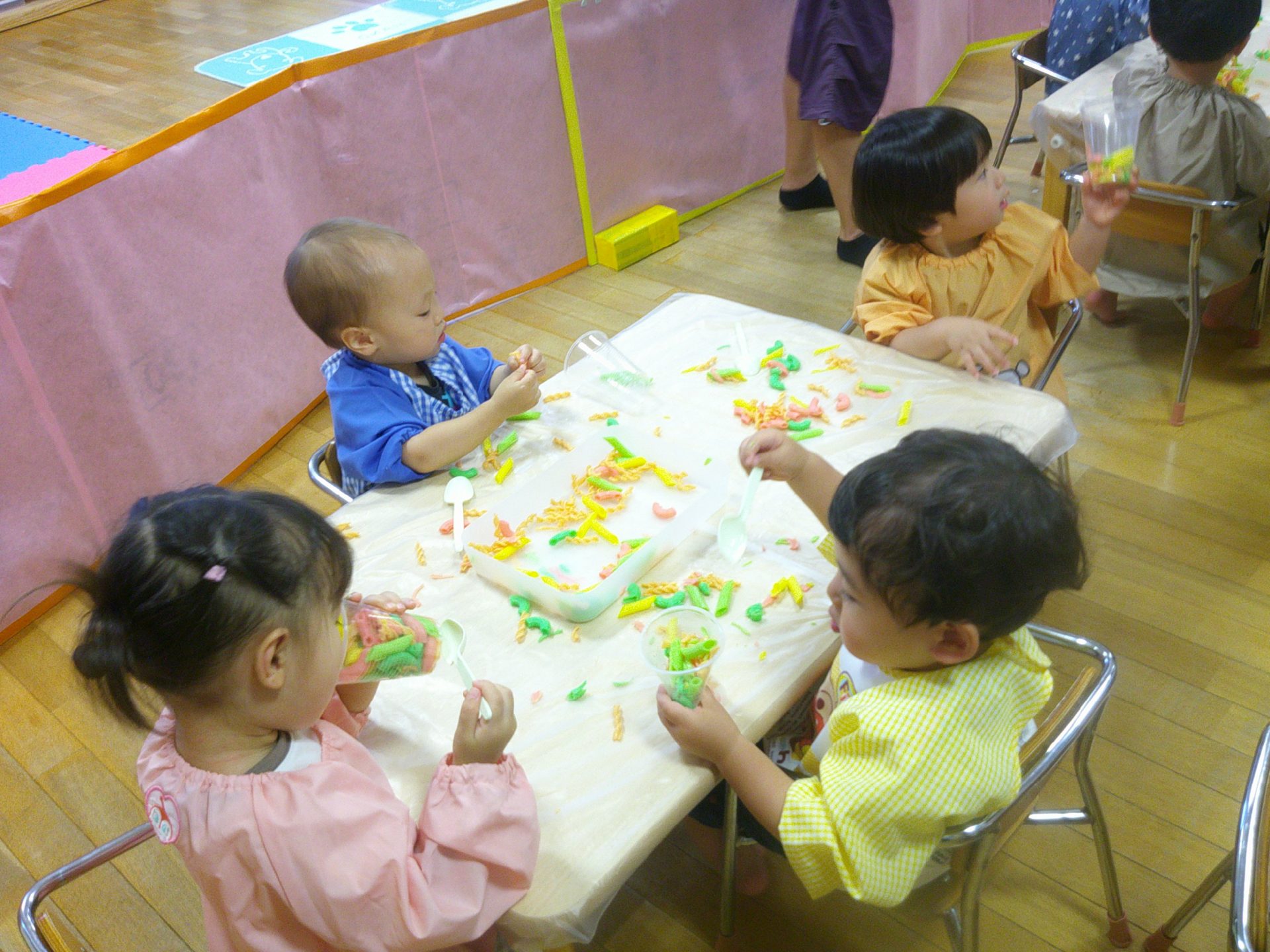 2025年07月16日 感触あそび「マカロニ」 今日は、マカロニを指でつついたり、手で触ったり、握ったり、ちぎったり・・感触を楽しんだ後に、手でつかんだり、スプーンですくったりしてカップに入れて楽しみました。
