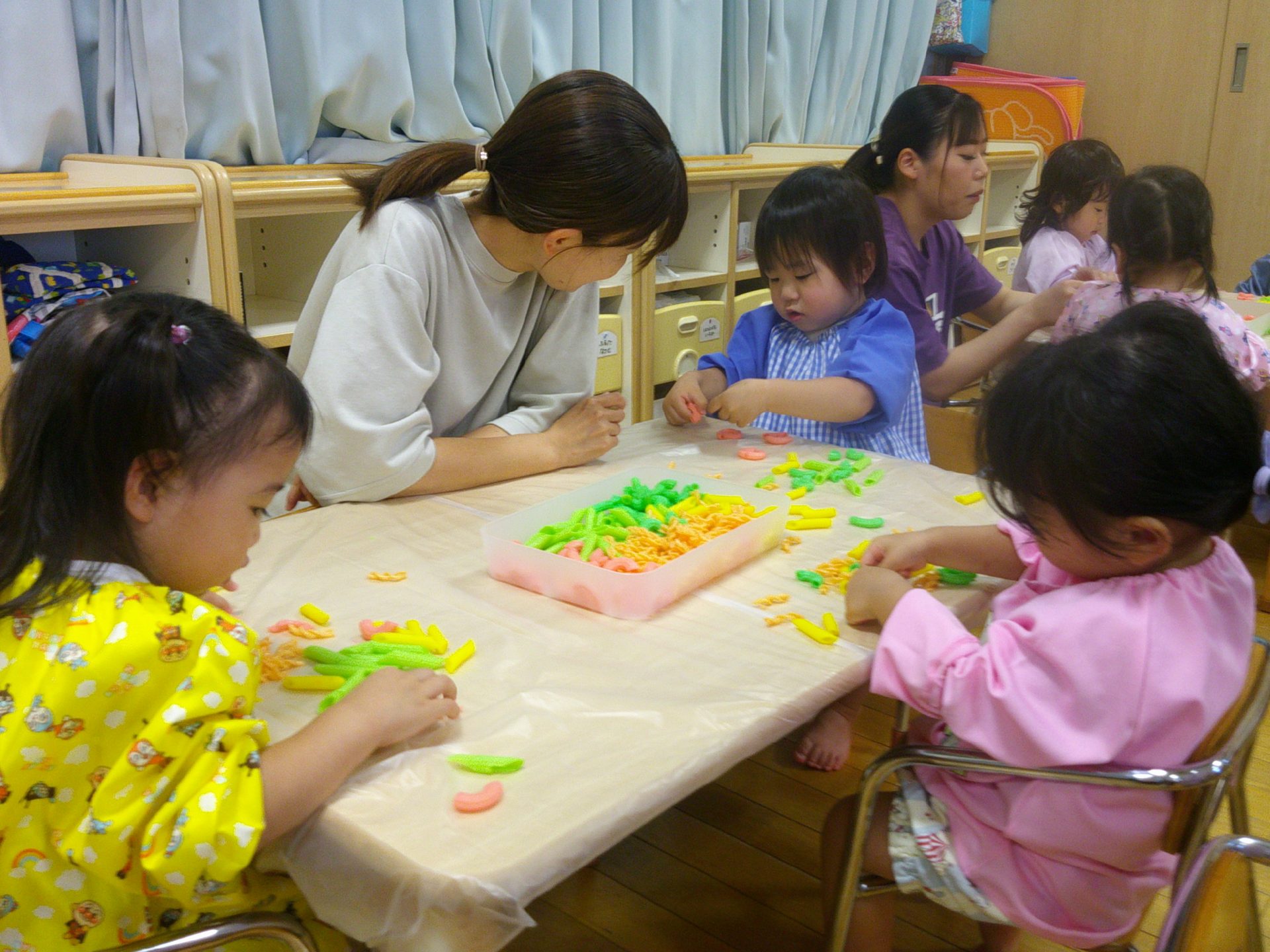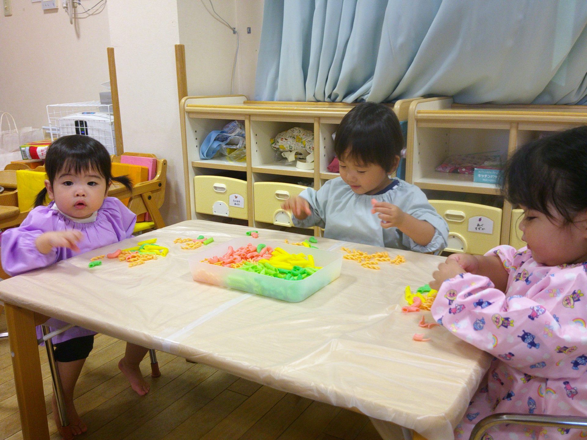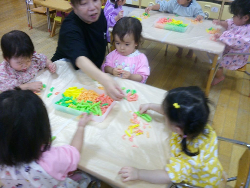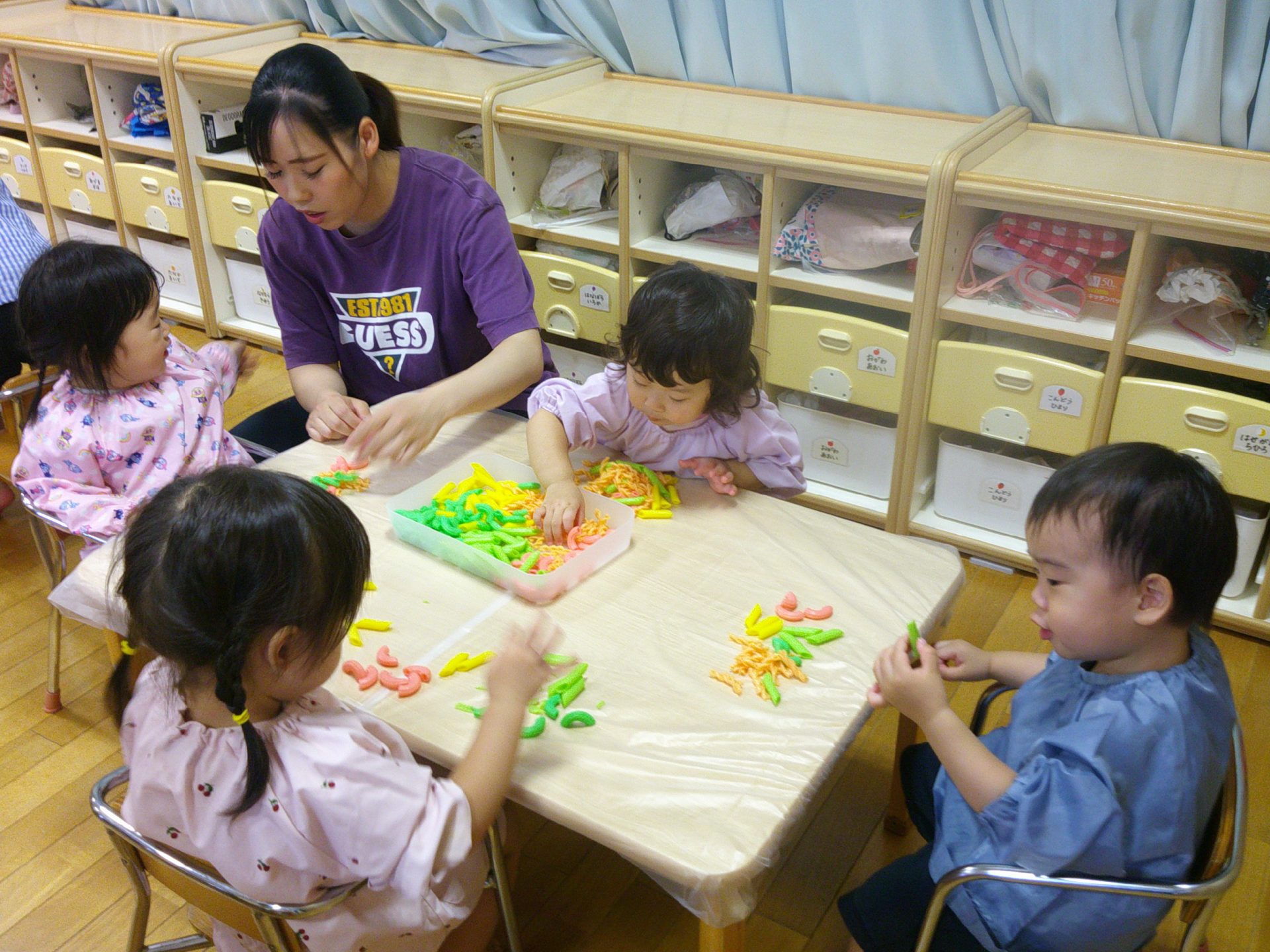 2025年07月16日 感触あそび「マカロニ」 今日は、マカロニを指でつついたり、手で触ったり、握ったり、ちぎったり・・感触を楽しんだ後に、手でつかんだり、スプーンですくったりしてカップに入れて楽しみました。
