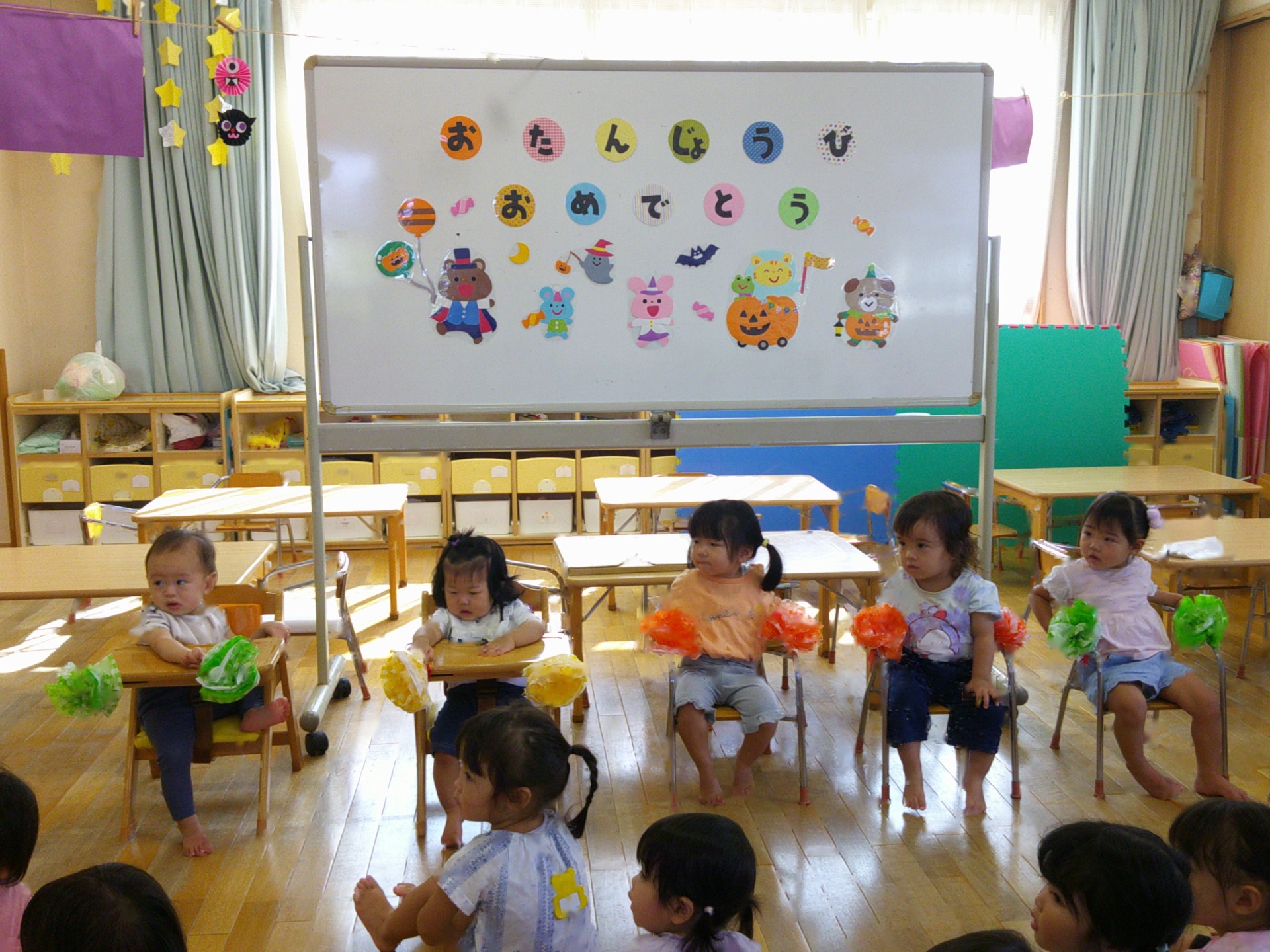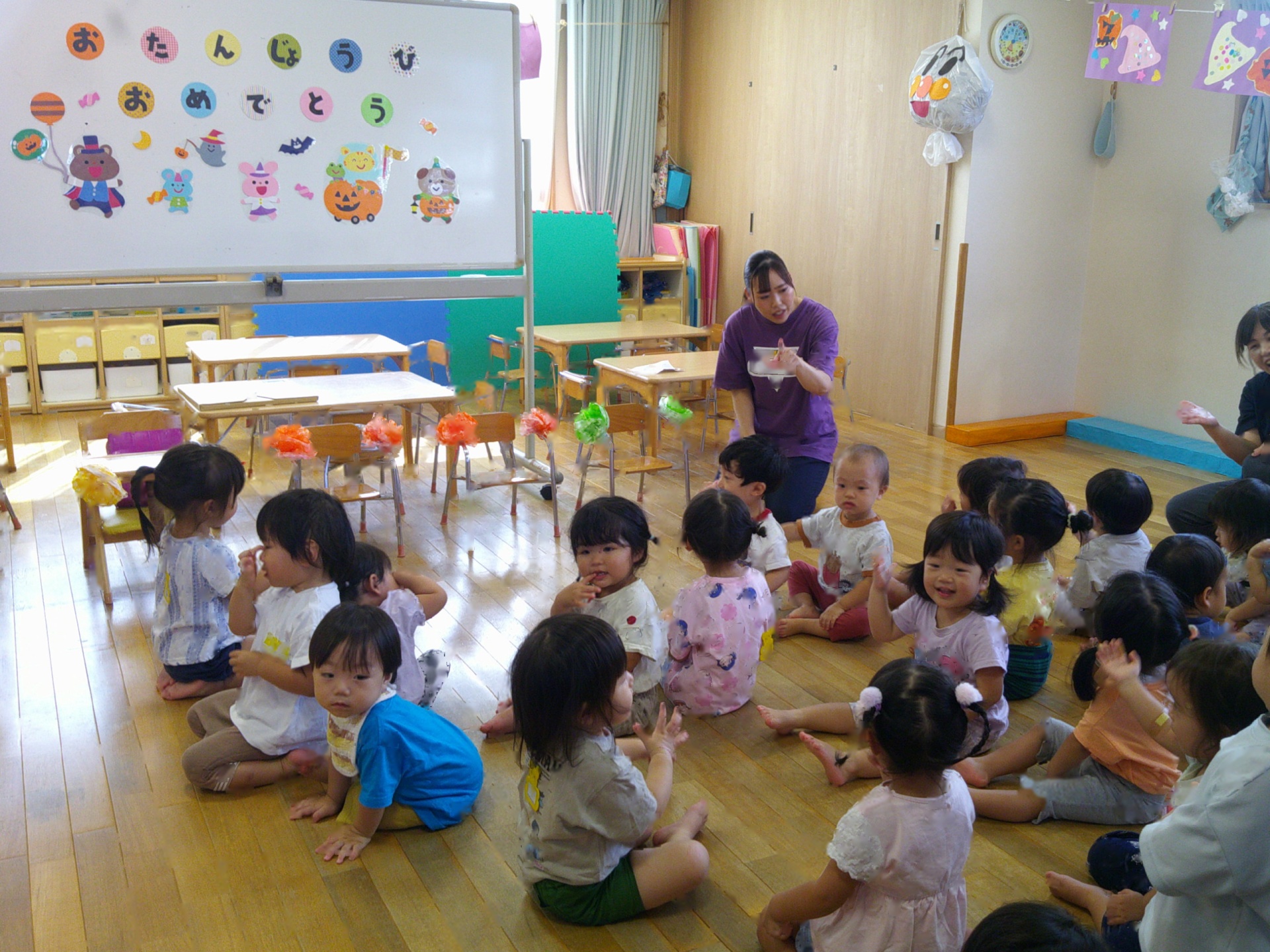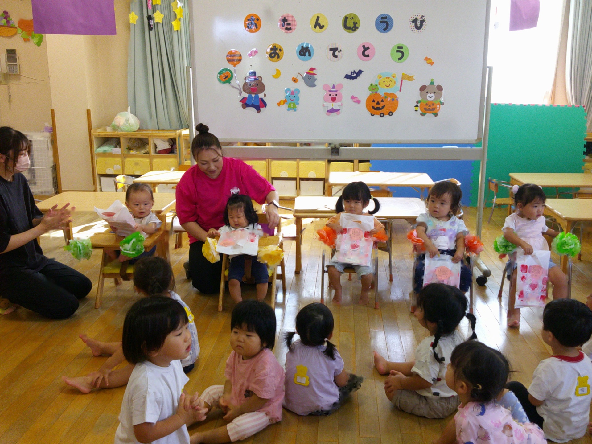 2025年10月15日 ☆10月誕生会☆ 10月の誕生会がありました。5名のお友達をお祝いしました! 「大きな栗の木の下で」の歌を歌ったり、絵本の読み聞かせのプレゼントをしてもらったりして、みんなでにぎやかく楽しいひと時を過ごしました。 先生によるお楽しみコーナーでは、「どうぶついろいろかくれんぼ」の大型絵本を見ました。「ライオン」や「かめ」「くじら」など、知っている動物が登場すると、その名前を言葉や鳴き声で教えてくれる子ども達の姿も多く、見ていてとても微笑ましかったです。 改めまして10月生まれのお友達、お誕生日おめでとうございます🎂🎉