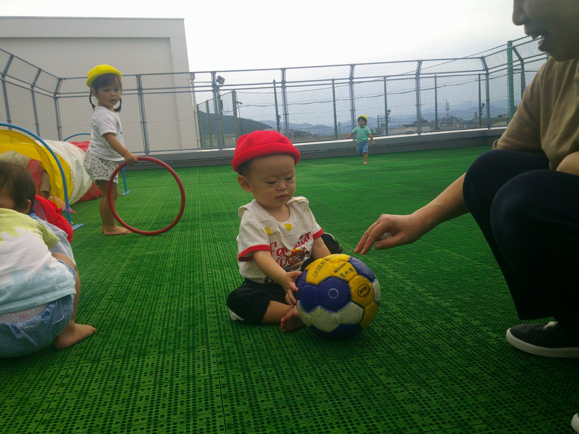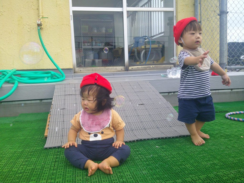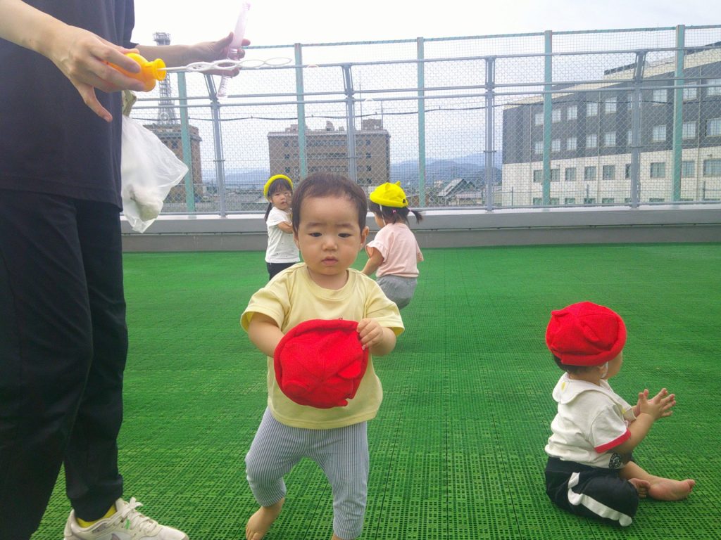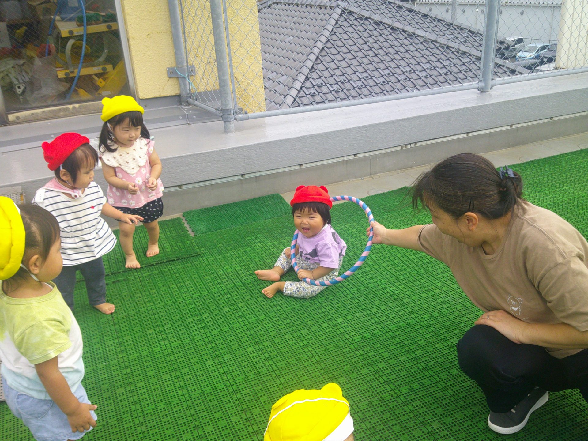 2025年10月08日 屋上で遊んだよ! 先週、屋上に遊びに行きました。 フラフープやボールを持って遊んだり、ハイハイしたりしてたくさん身体を動かして楽しみました♪ また、みかん組のお友達と一緒にシャボン玉を追いかけて楽しむ子ども達でした。