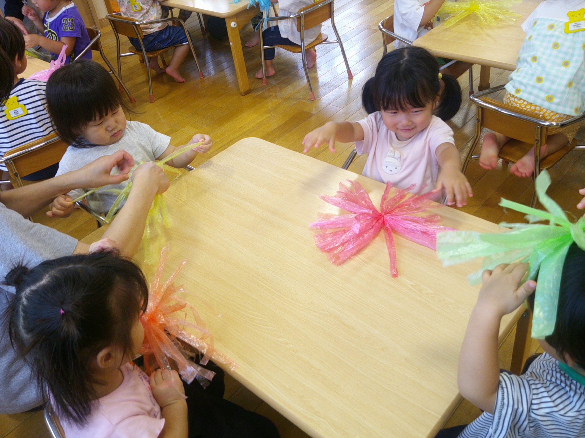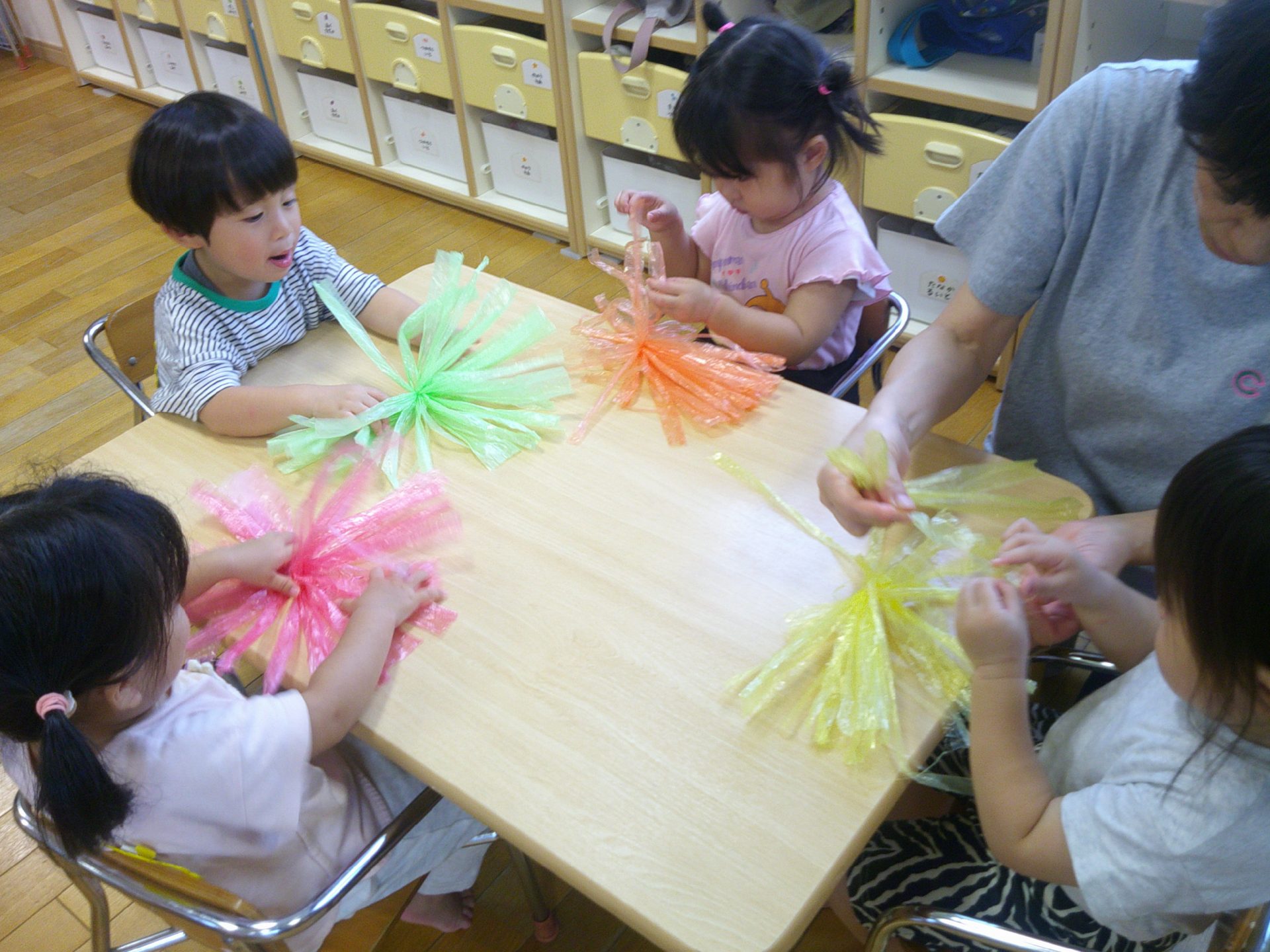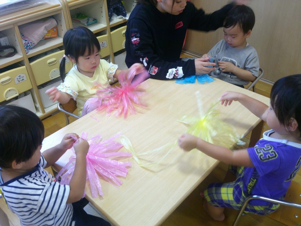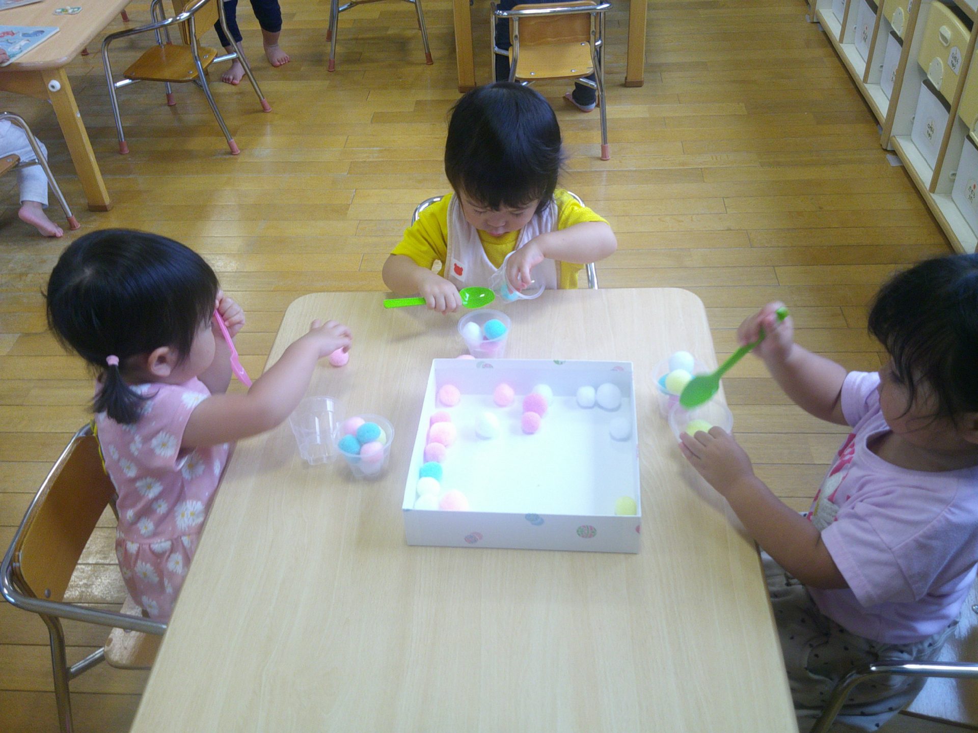 2025年10月16日 指先遊び「裂く」 今日の指先遊びは、「裂く」活動をしてみました。スズランテープを指で裂いて・・「モジャモジャおばけ」にしました。 コロコロ~・・楽しいね。遊びの一コマです。 コーナー遊び パズル、絵本、ままごと、アイス(スプーンでコットンボールをカップに入れる)の4つのコーナーから、自分の好きなコーナーを選んで遊びました。