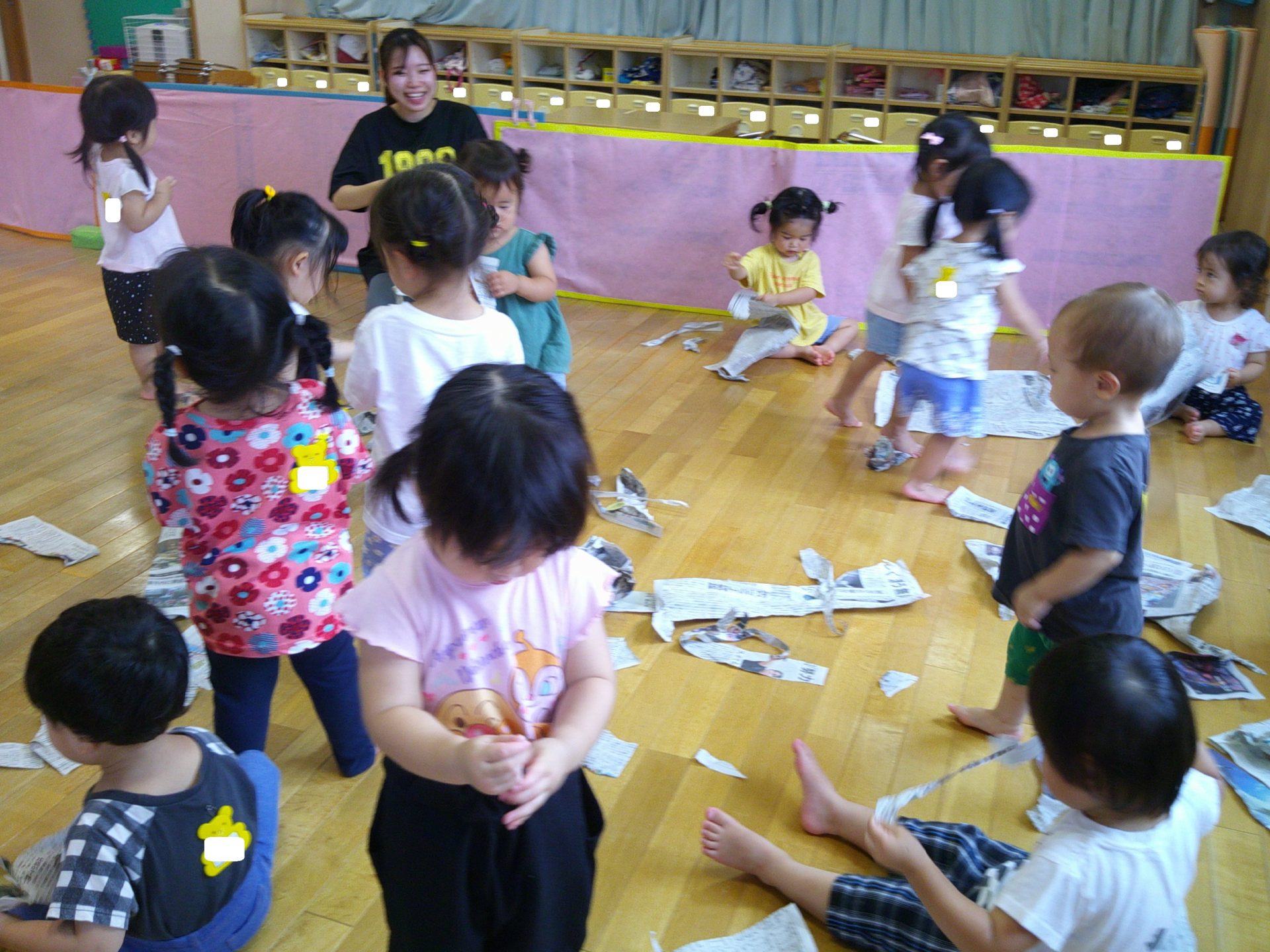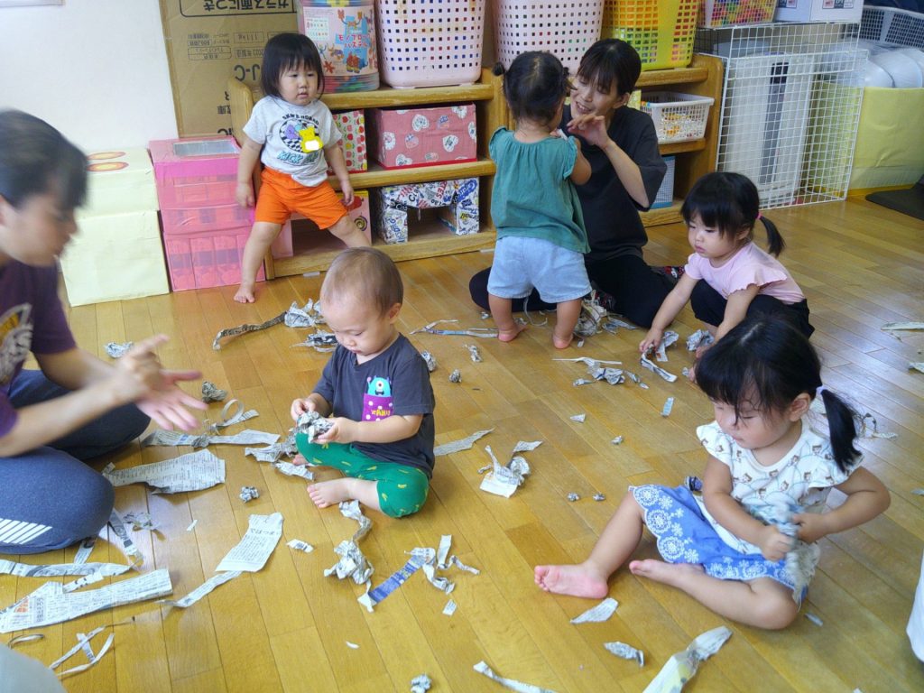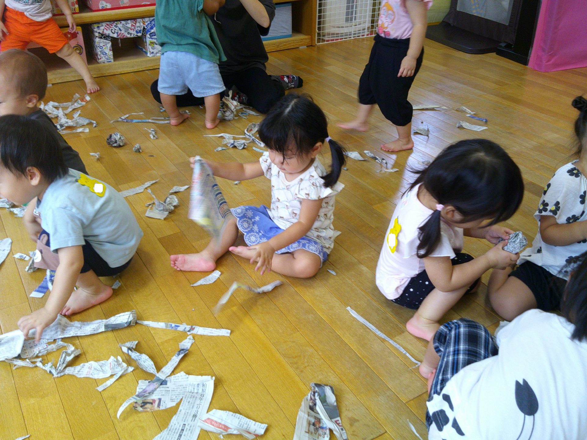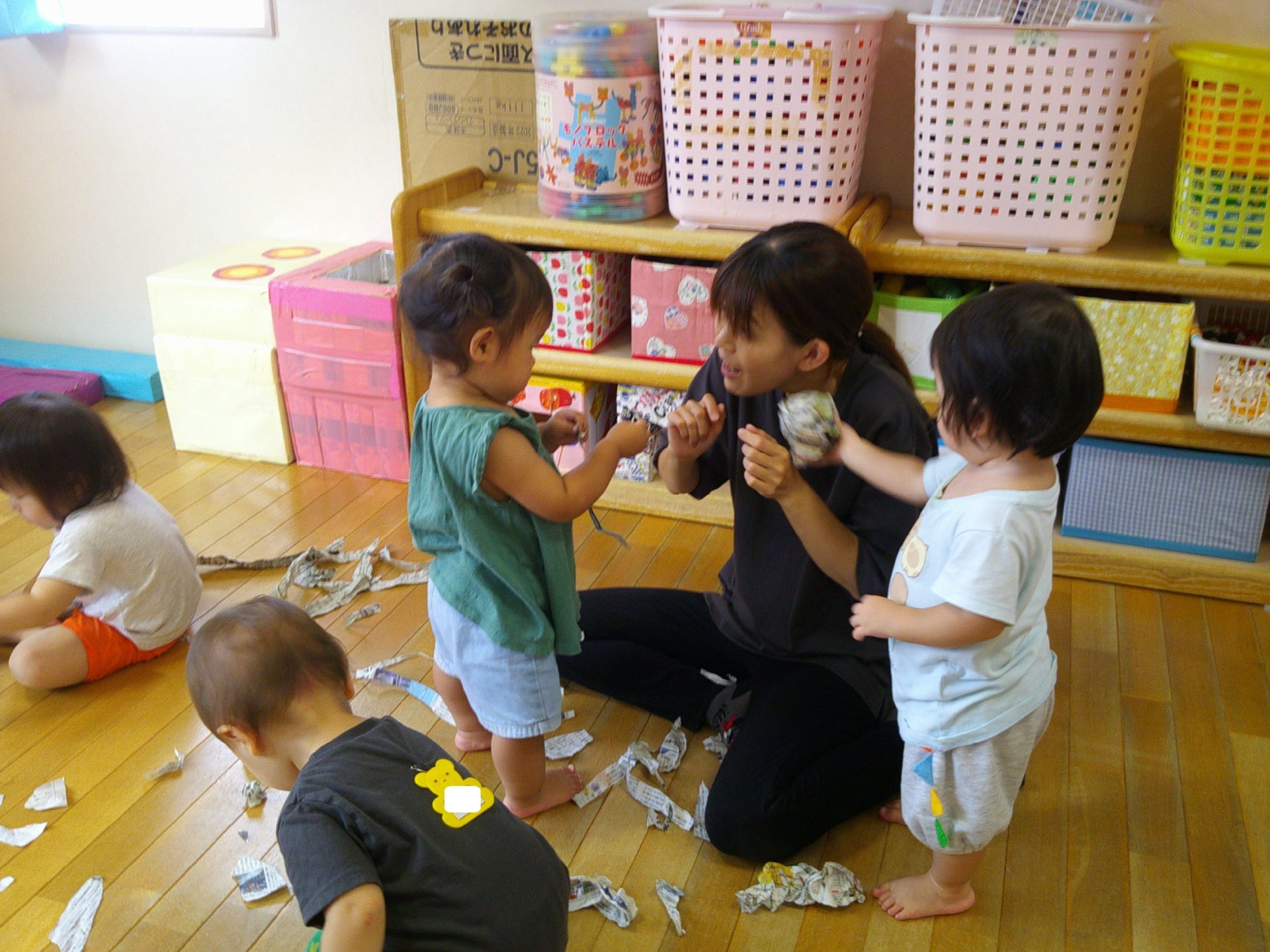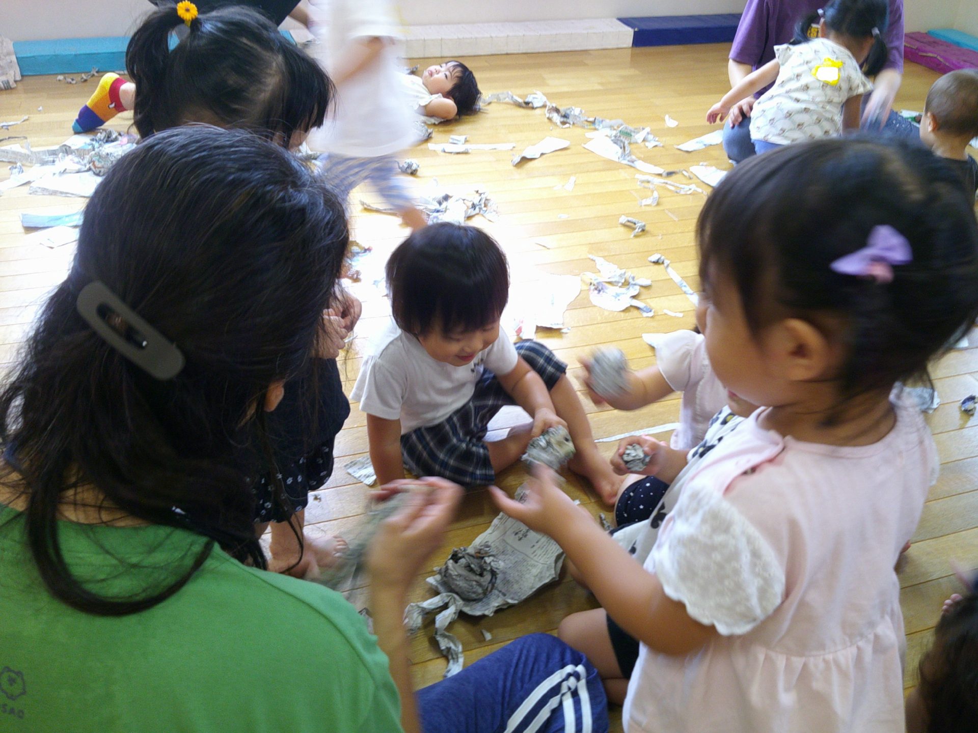 2025年08月25日 新聞紙で遊んだよ! 今日は、久しぶりに新聞紙遊びをしました。以前、遊んだ時には、新聞紙をちぎったり、やぶったり、雨に見立てたり、上に上げて落ちてくる様子を見て楽しむ姿が多く見られましたが、今日はそれに加えて、おにぎりのように握り、友達や職員に食べさせてみたり、丸めてボールのようにして「ぽん」と投げたりして楽しむ姿が見られました!遊びの内容に変化も見られ、改めて成長を感じました✨