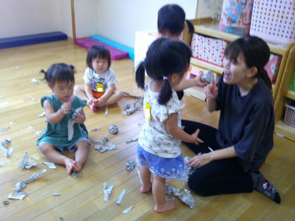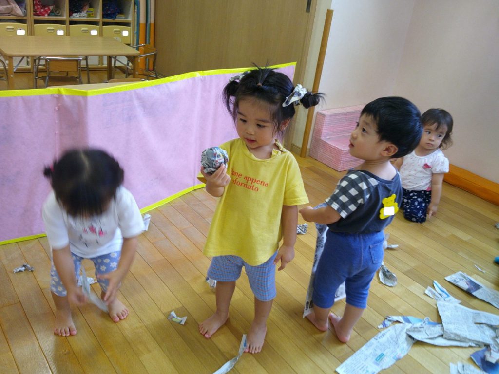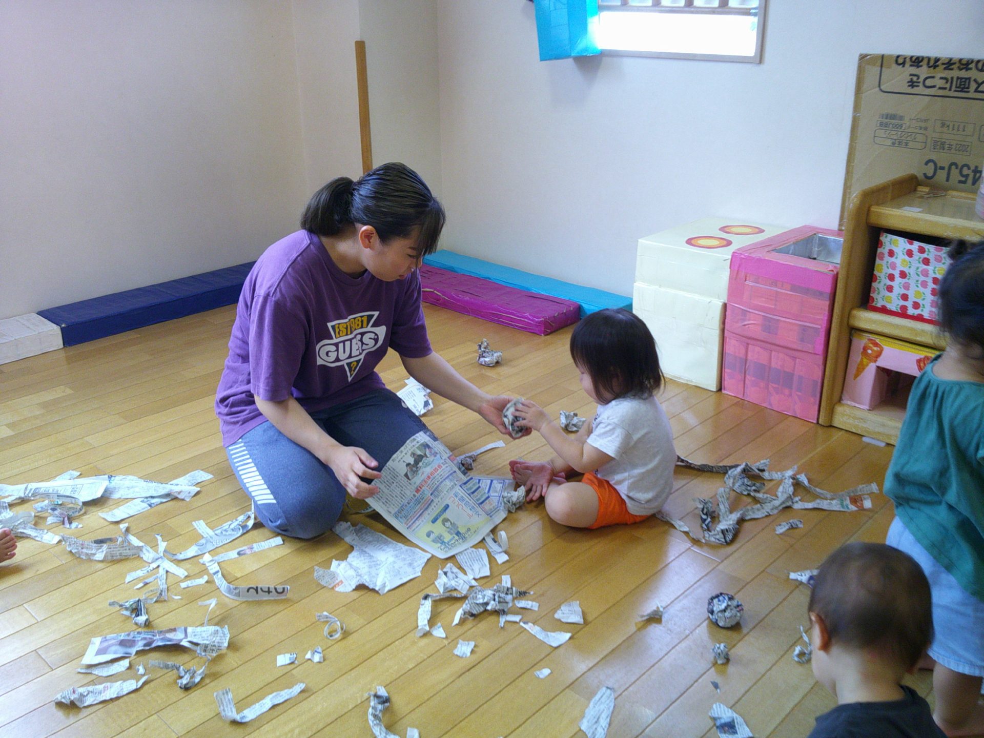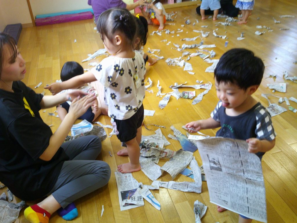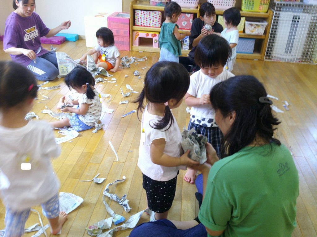 2025年08月25日 新聞紙で遊んだよ! 今日は、久しぶりに新聞紙遊びをしました。以前、遊んだ時には、新聞紙をちぎったり、やぶったり、雨に見立てたり、上に上げて落ちてくる様子を見て楽しむ姿が多く見られましたが、今日はそれに加えて、おにぎりのように握り、友達や職員に食べさせてみたり、丸めてボールのようにして「ぽん」と投げたりして楽しむ姿が見られました!遊びの内容に変化も見られ、改めて成長を感じました✨
