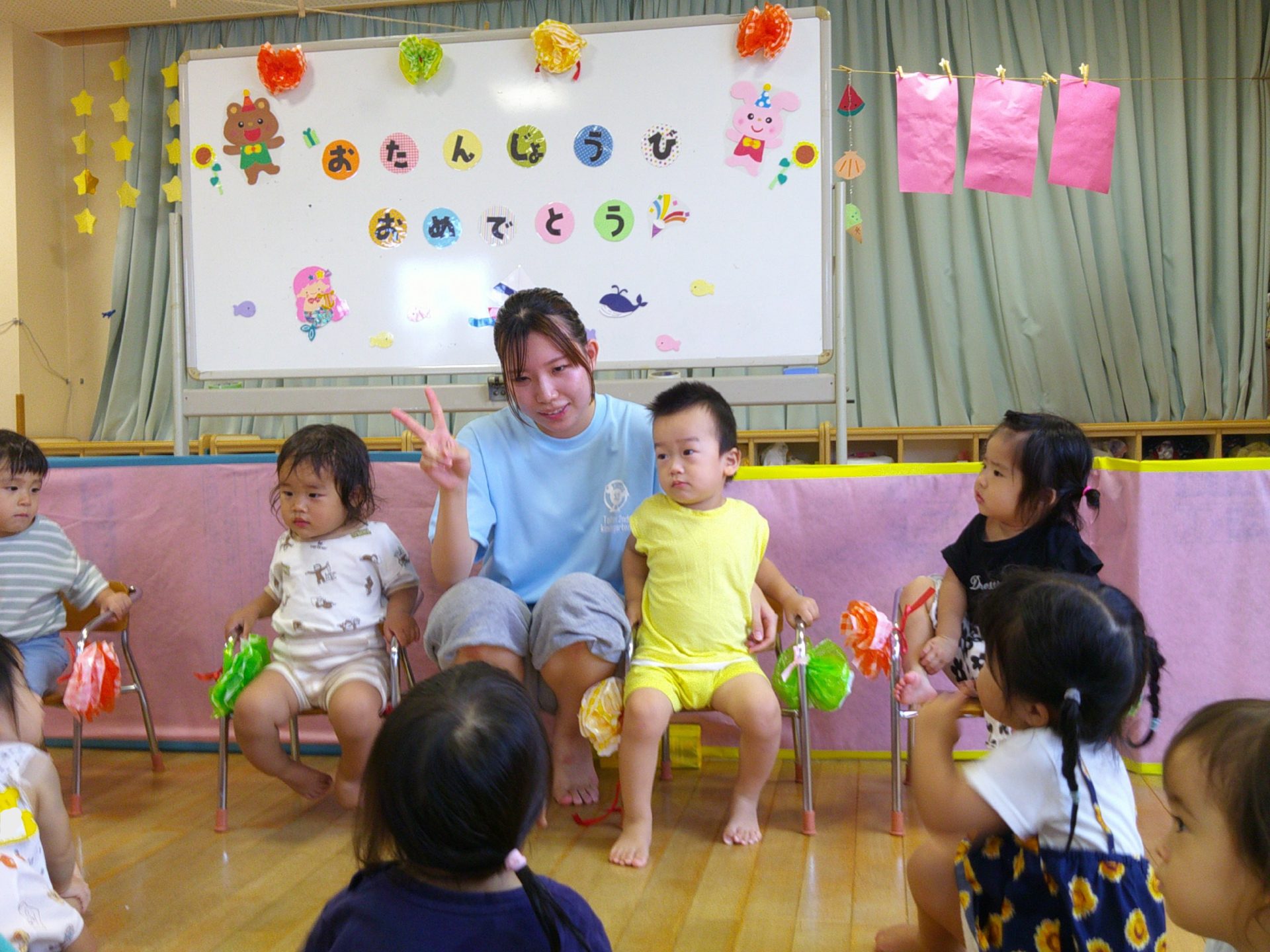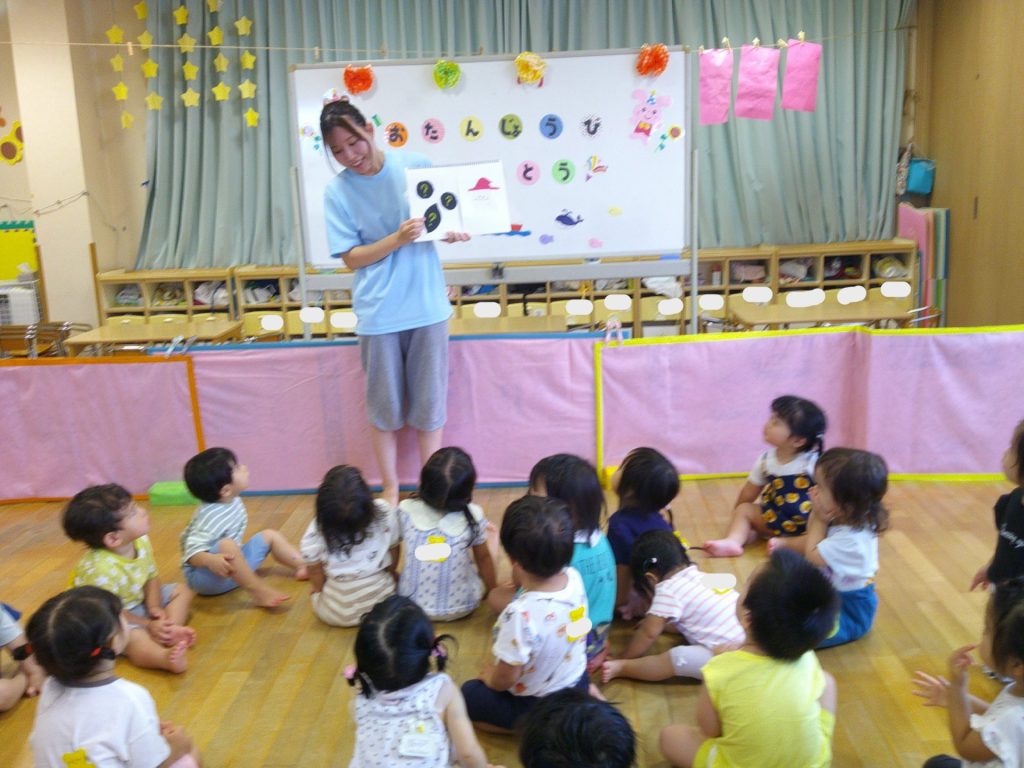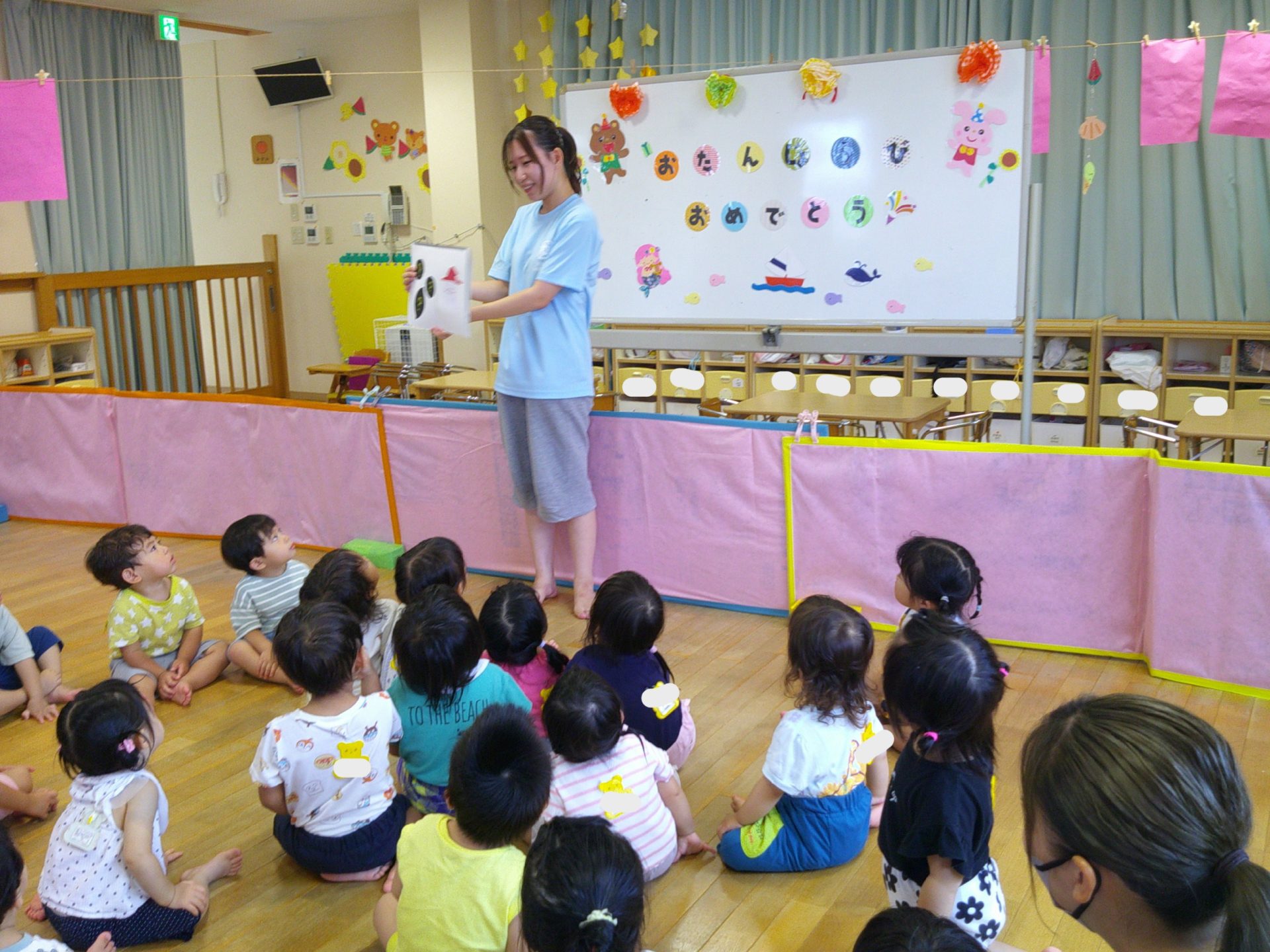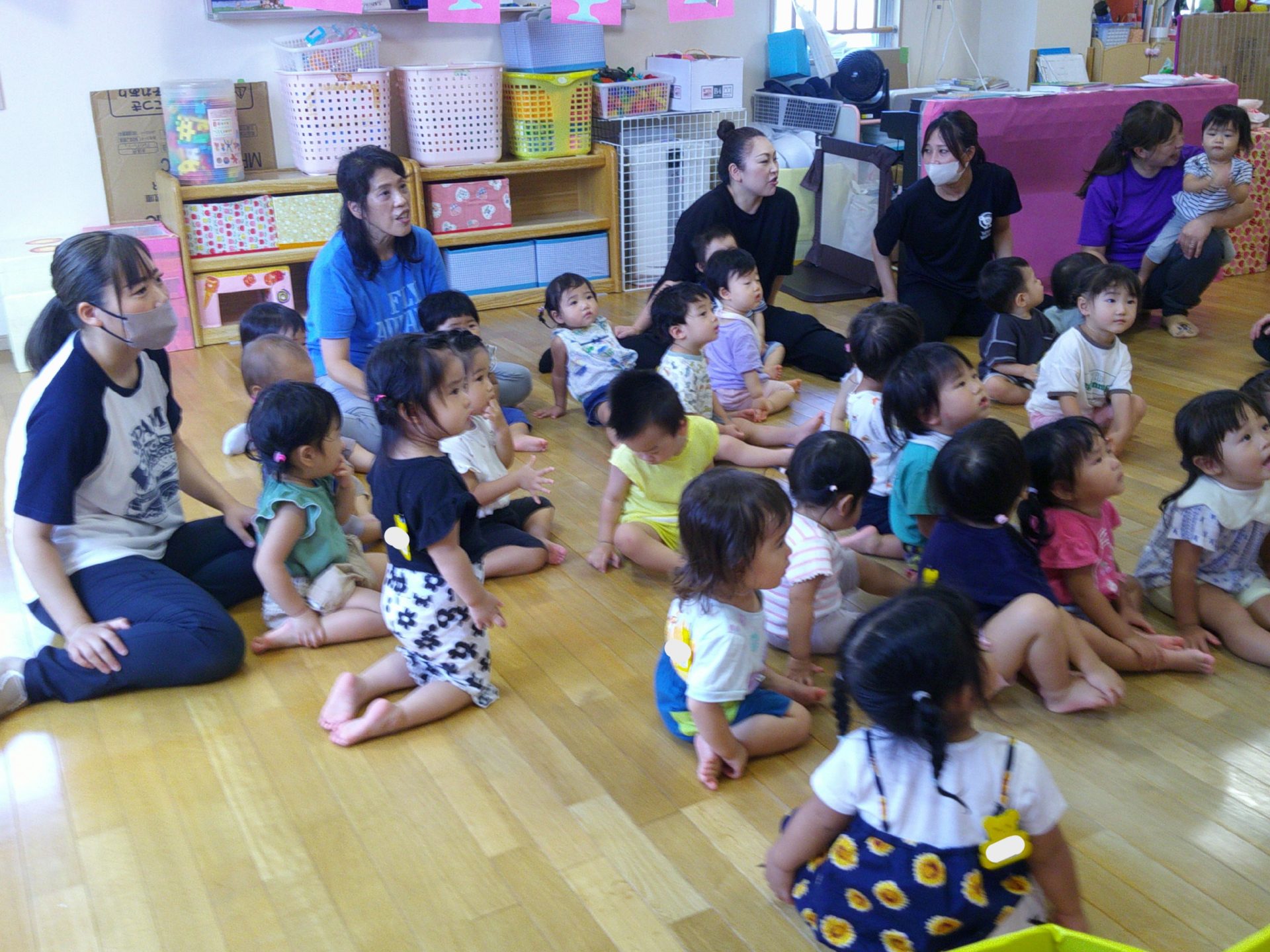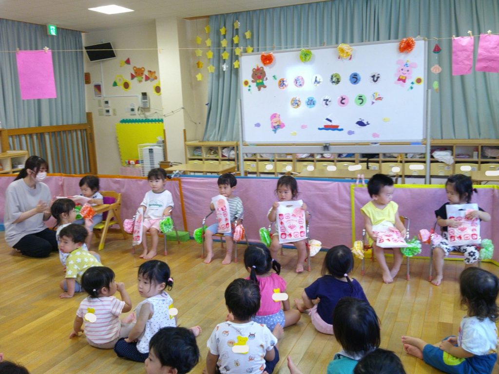 2025年08月26日 8月の誕生会(^▽^) 今日は8月生まれの子ども達の誕生会をしました。歌を歌ったり、園長先生からの絵本の読み聞かせをしてもらったりして楽しみました!担当の先生からの「くいしんぼうのおばけ」のスケッチブックシアターに興味津々な子ども達でした。これからも沢山食べて大きくなってね♡お誕生日おめでとうございます🎂