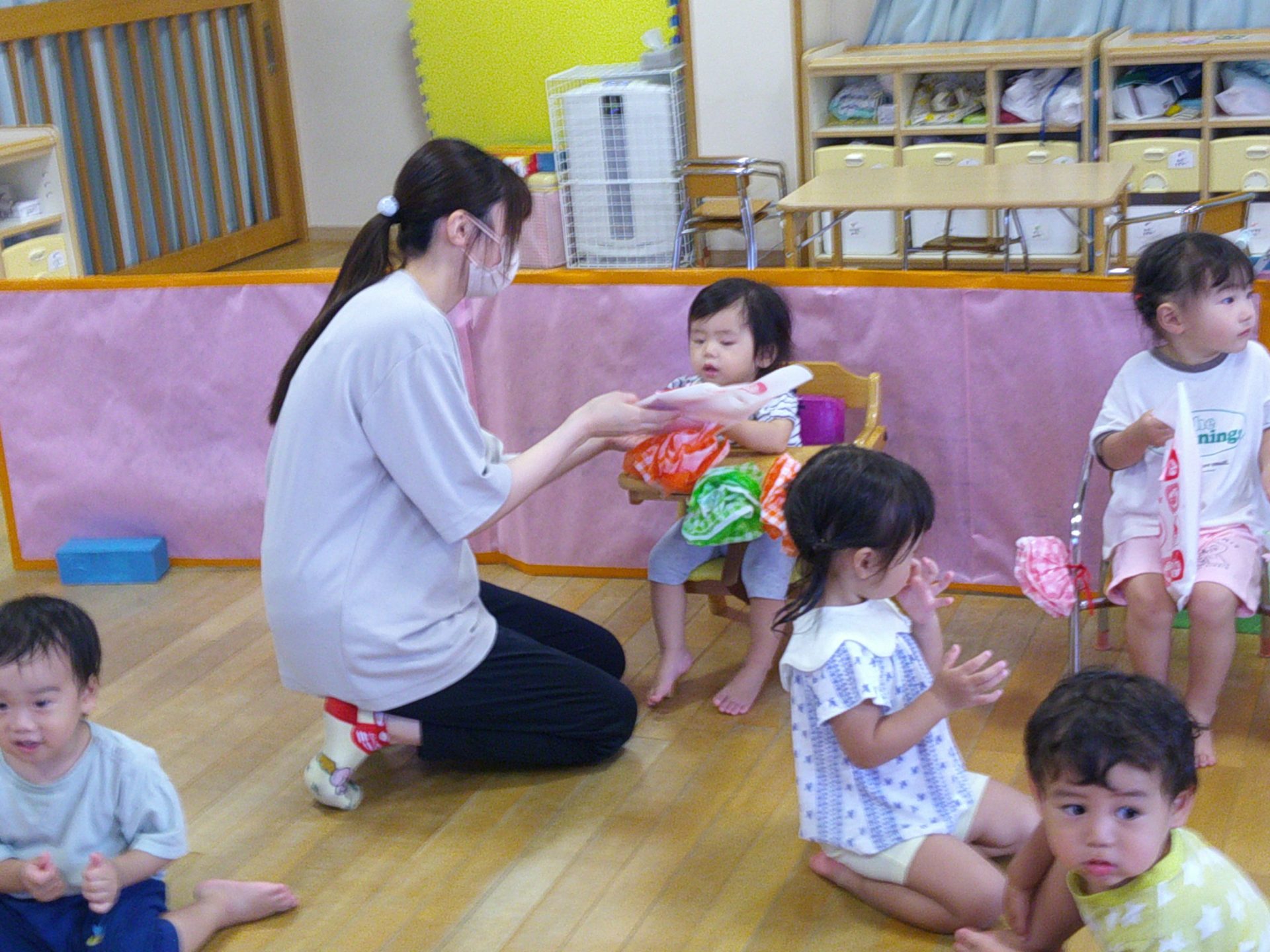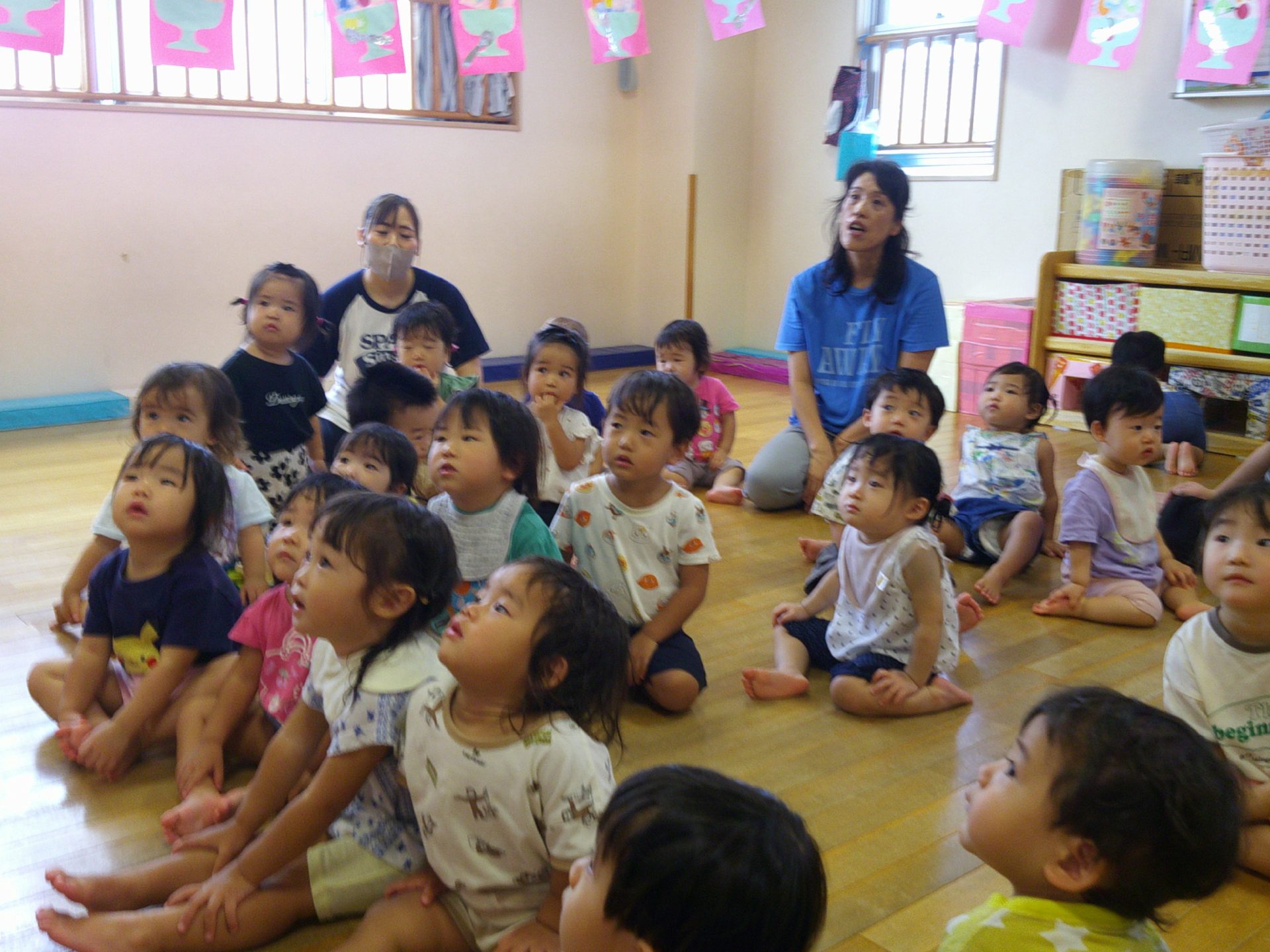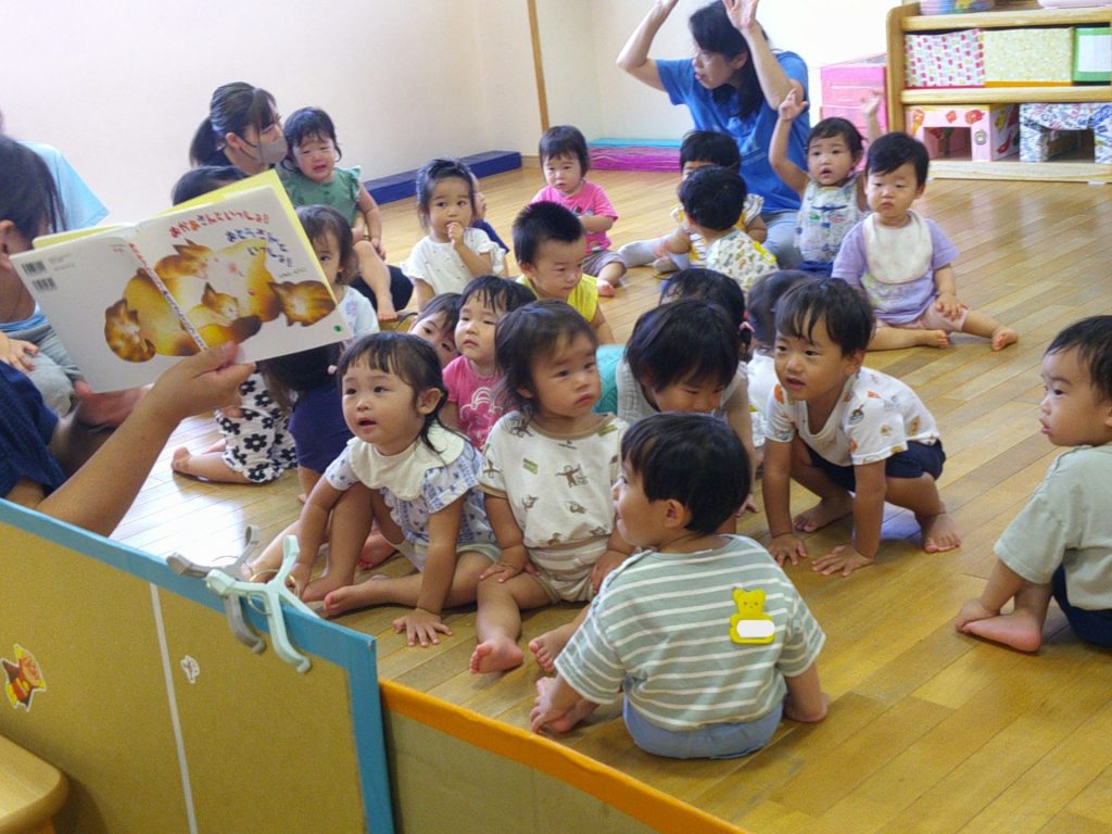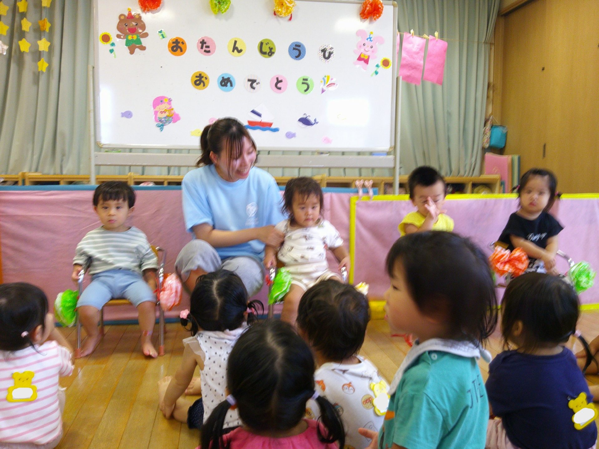 2025年08月26日 8月の誕生会(^▽^) 今日は8月生まれの子ども達の誕生会をしました。歌を歌ったり、園長先生からの絵本の読み聞かせをしてもらったりして楽しみました!担当の先生からの「くいしんぼうのおばけ」のスケッチブックシアターに興味津々な子ども達でした。これからも沢山食べて大きくなってね♡お誕生日おめでとうございます🎂