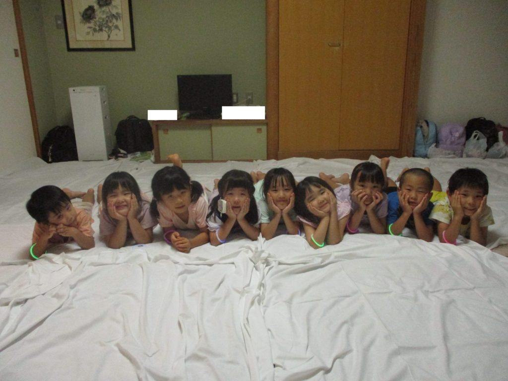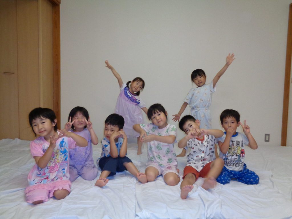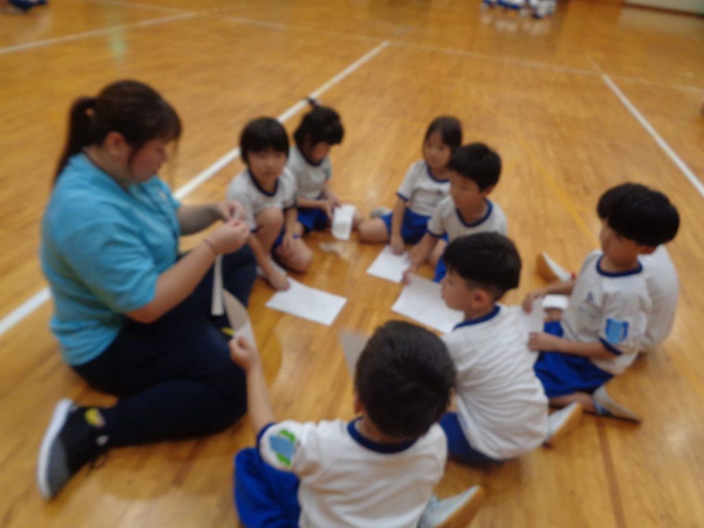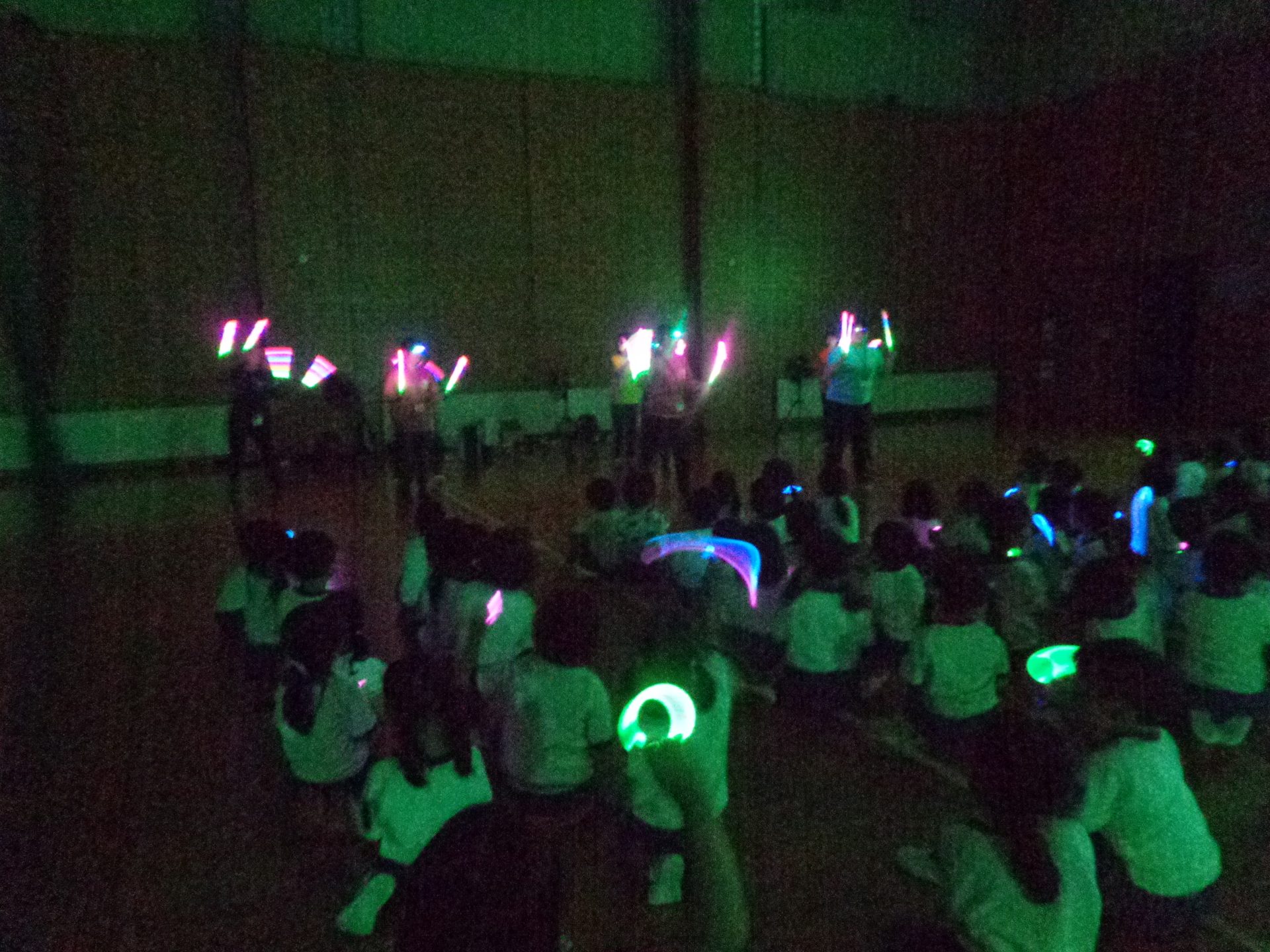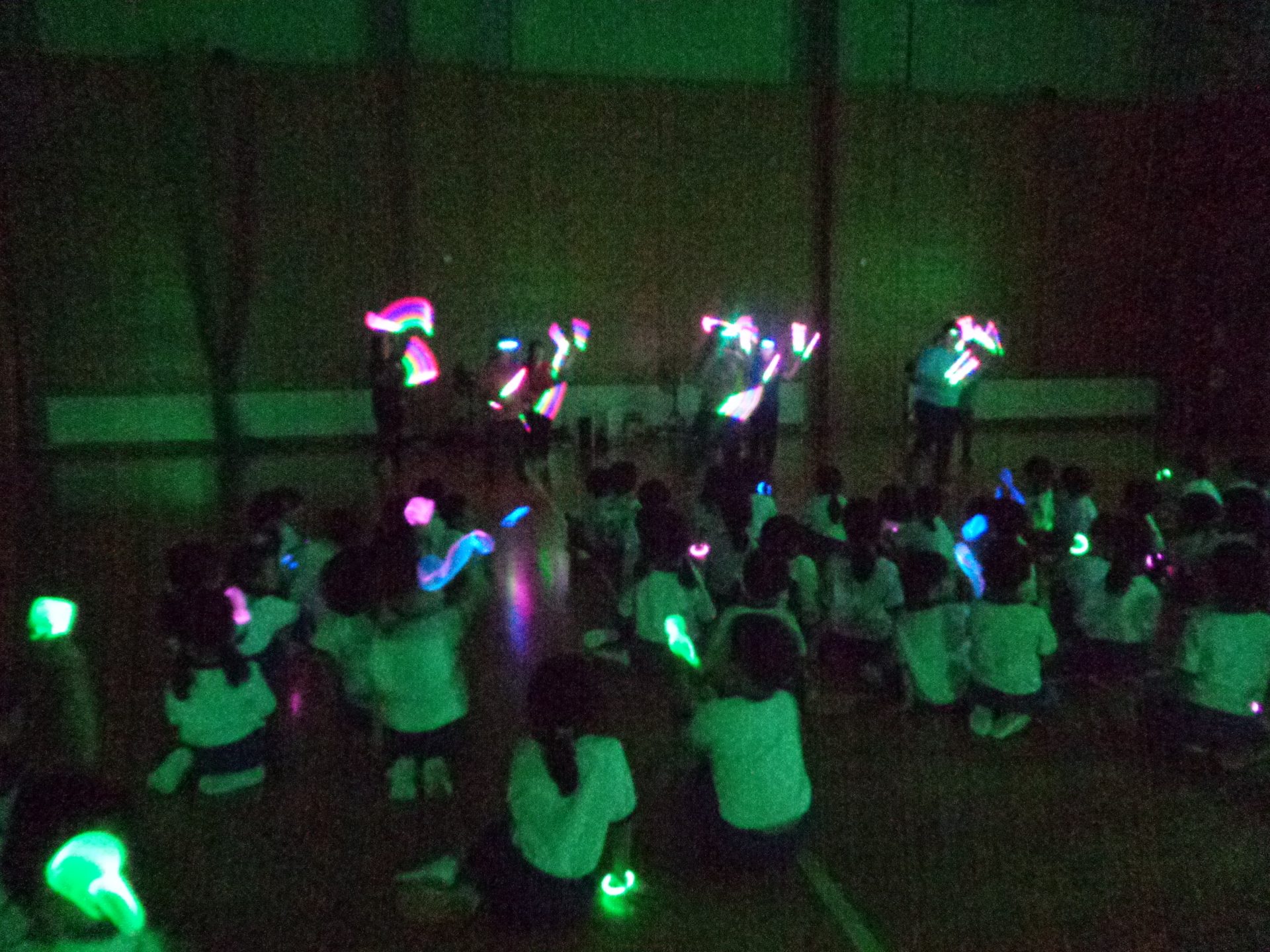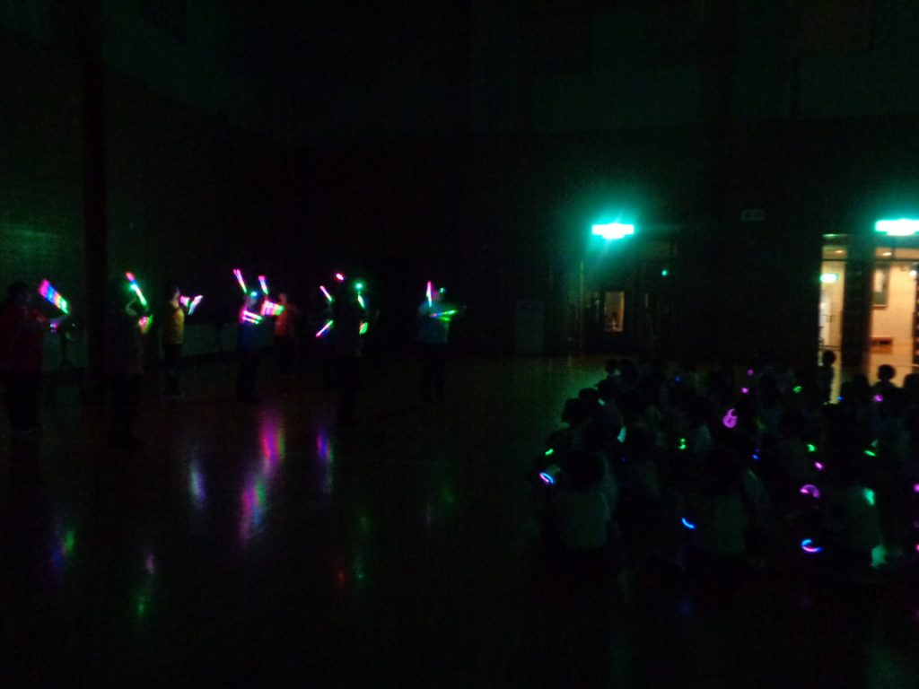 まだまだ楽しい時間は続きます。体育館に集まって、ゆうべのつどいをしました。先生クイズや紙飛行機大会、お楽しみコーナーでは先生たちのダンスがありました♪みんなも、腕に付けたサイリウムを振って応援してくれました♪