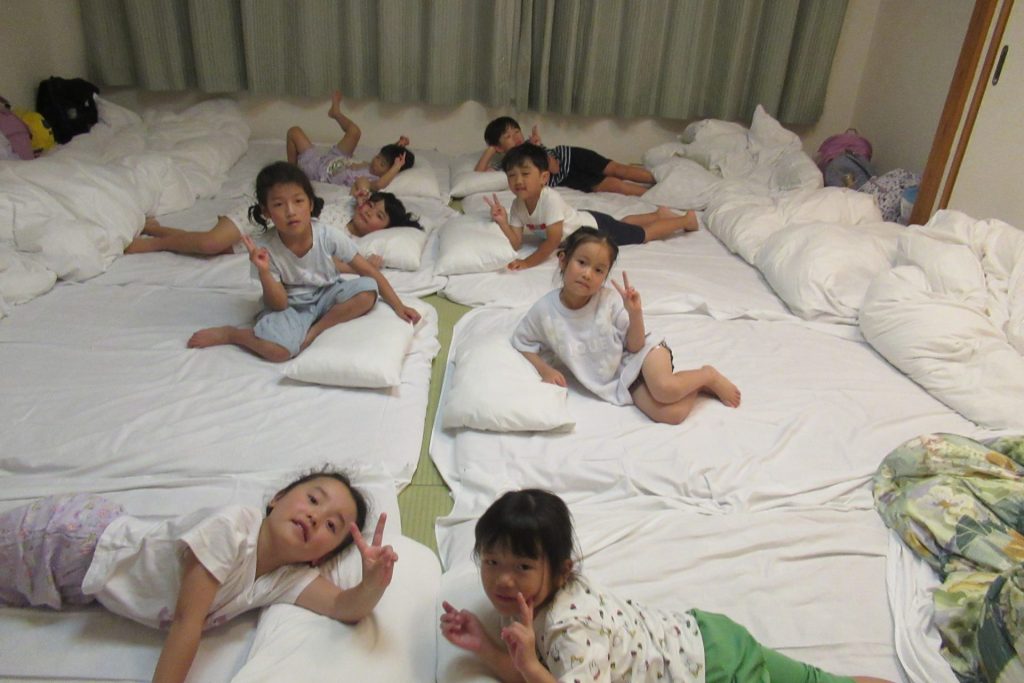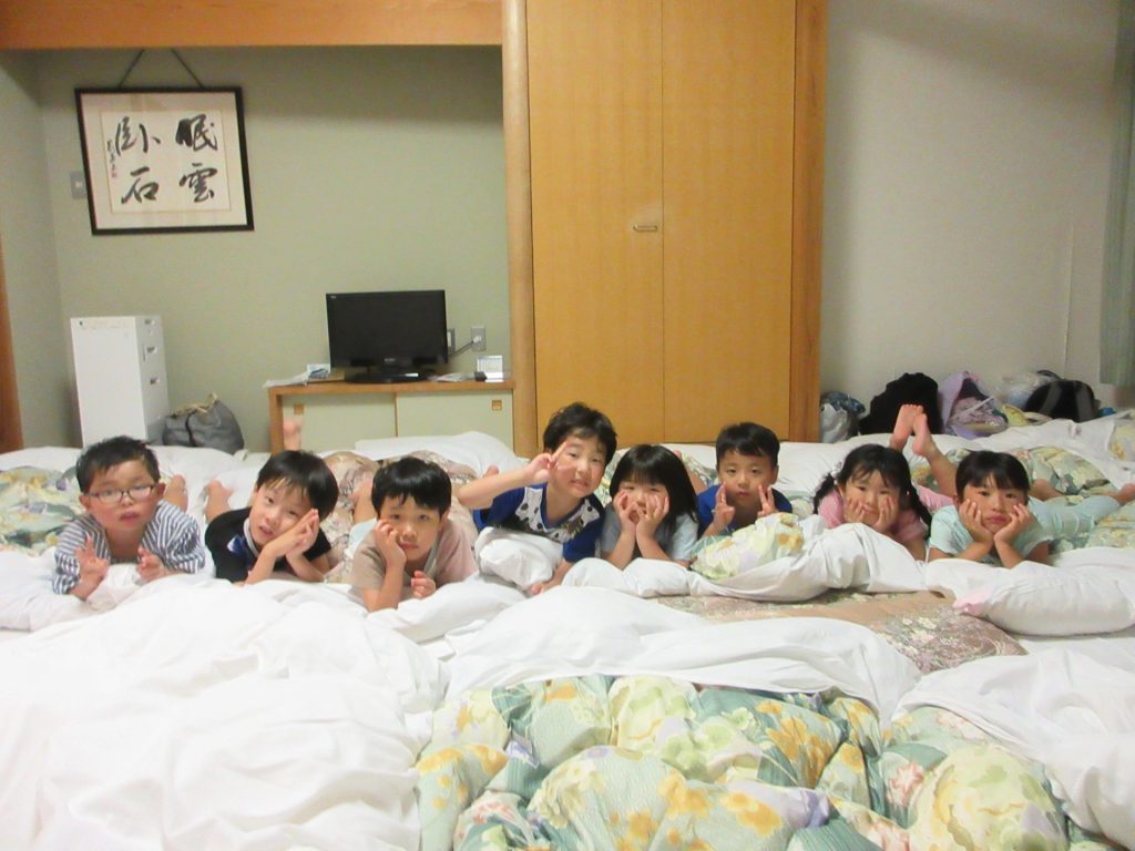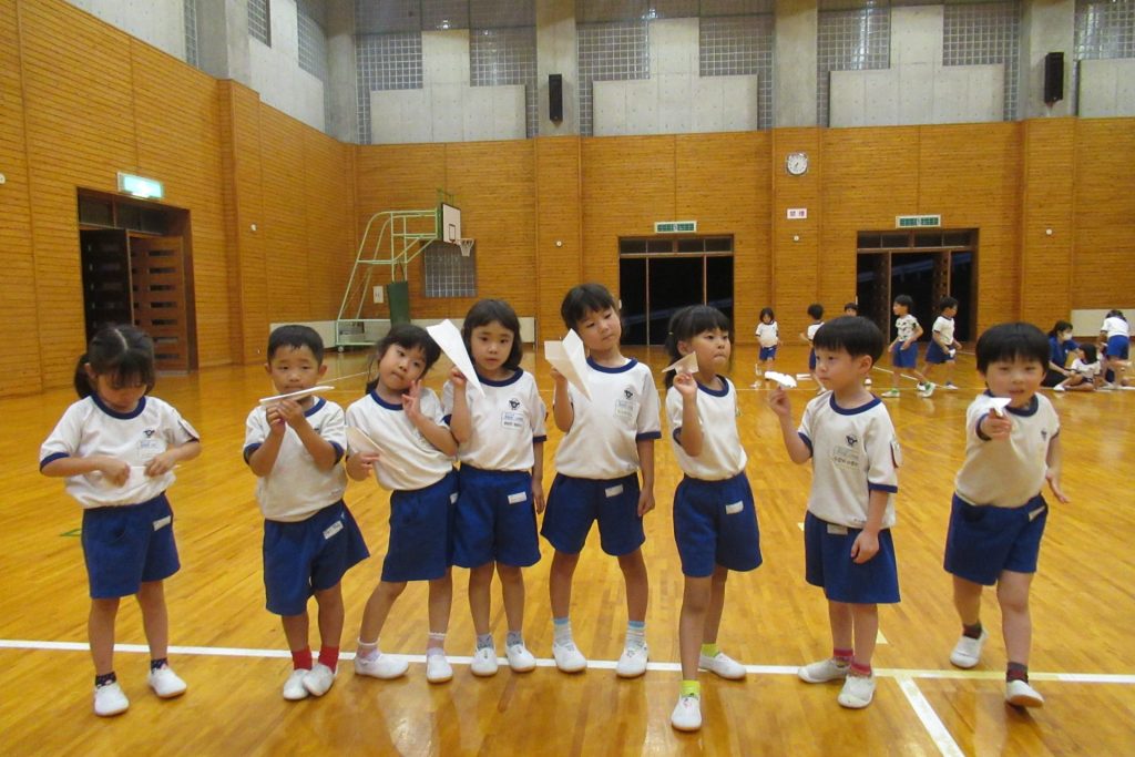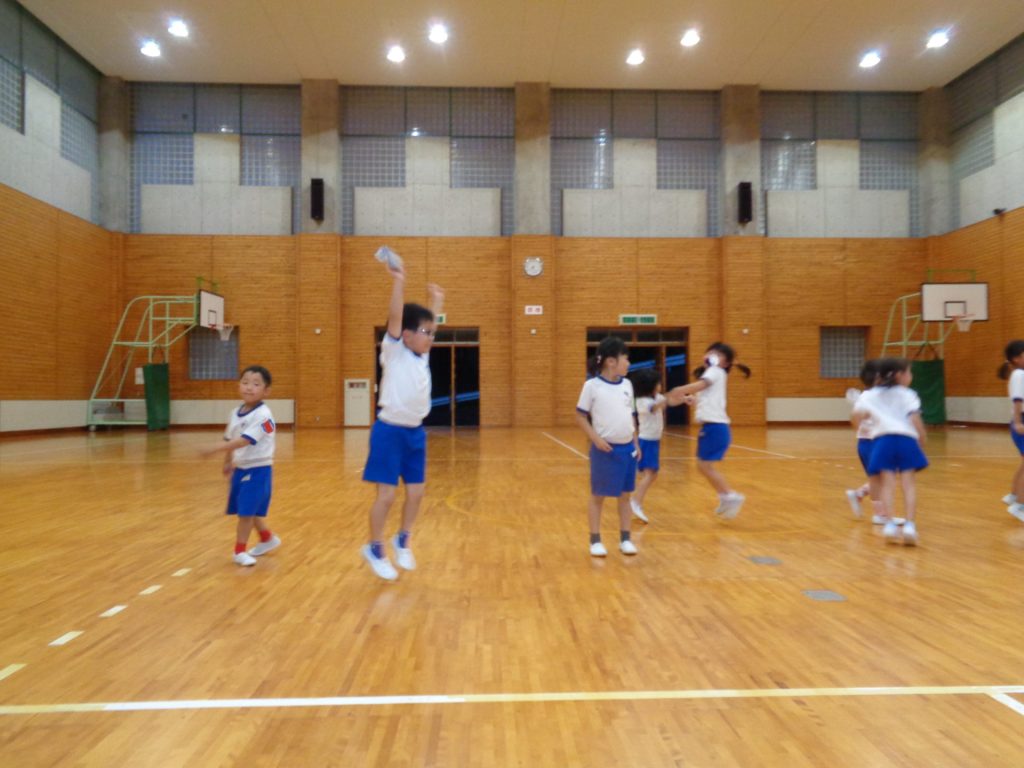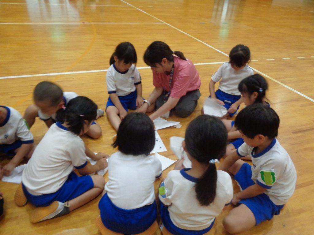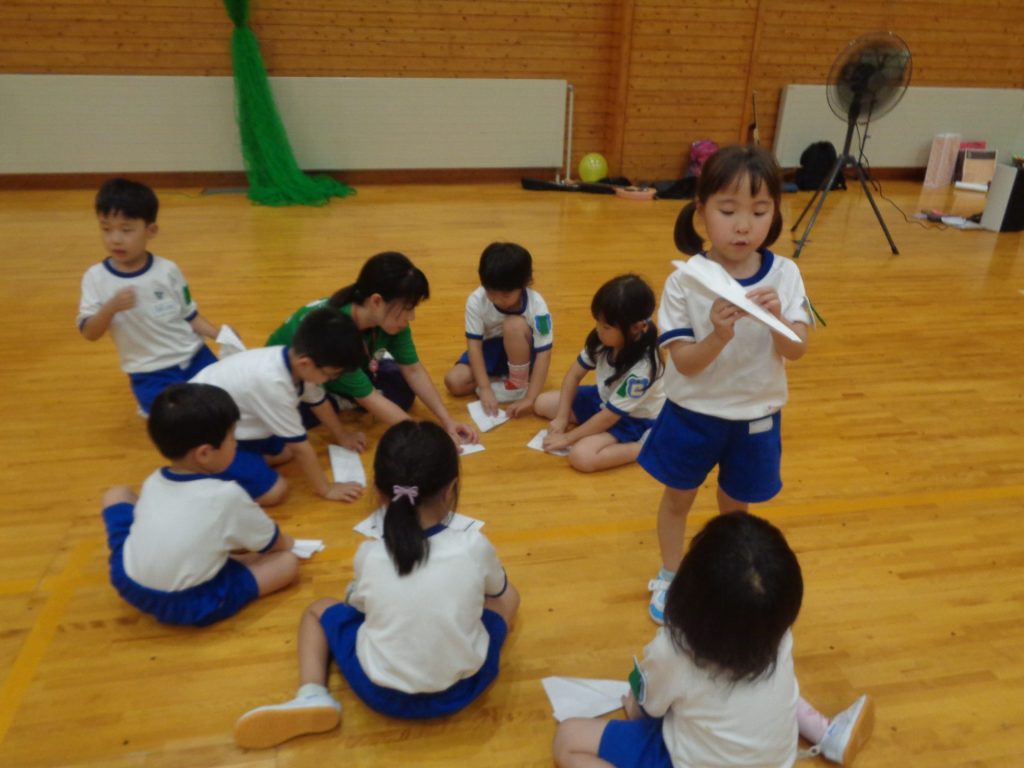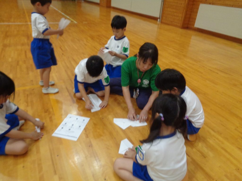 まだまだ楽しい時間は続きます。体育館に集まって、ゆうべのつどいをしました。先生クイズや紙飛行機大会、お楽しみコーナーでは先生たちのダンスがありました♪みんなも、腕に付けたサイリウムを振って応援してくれました♪