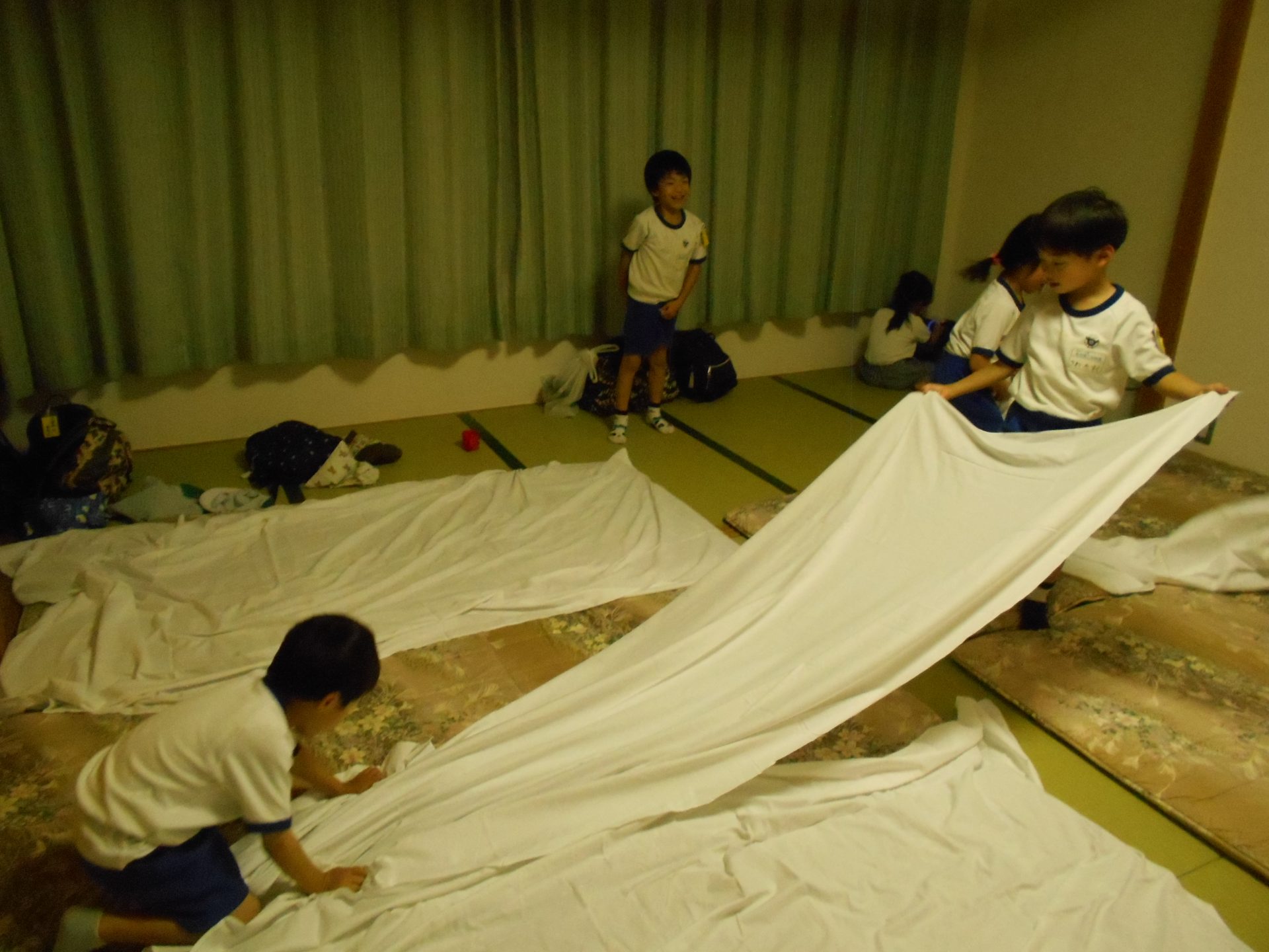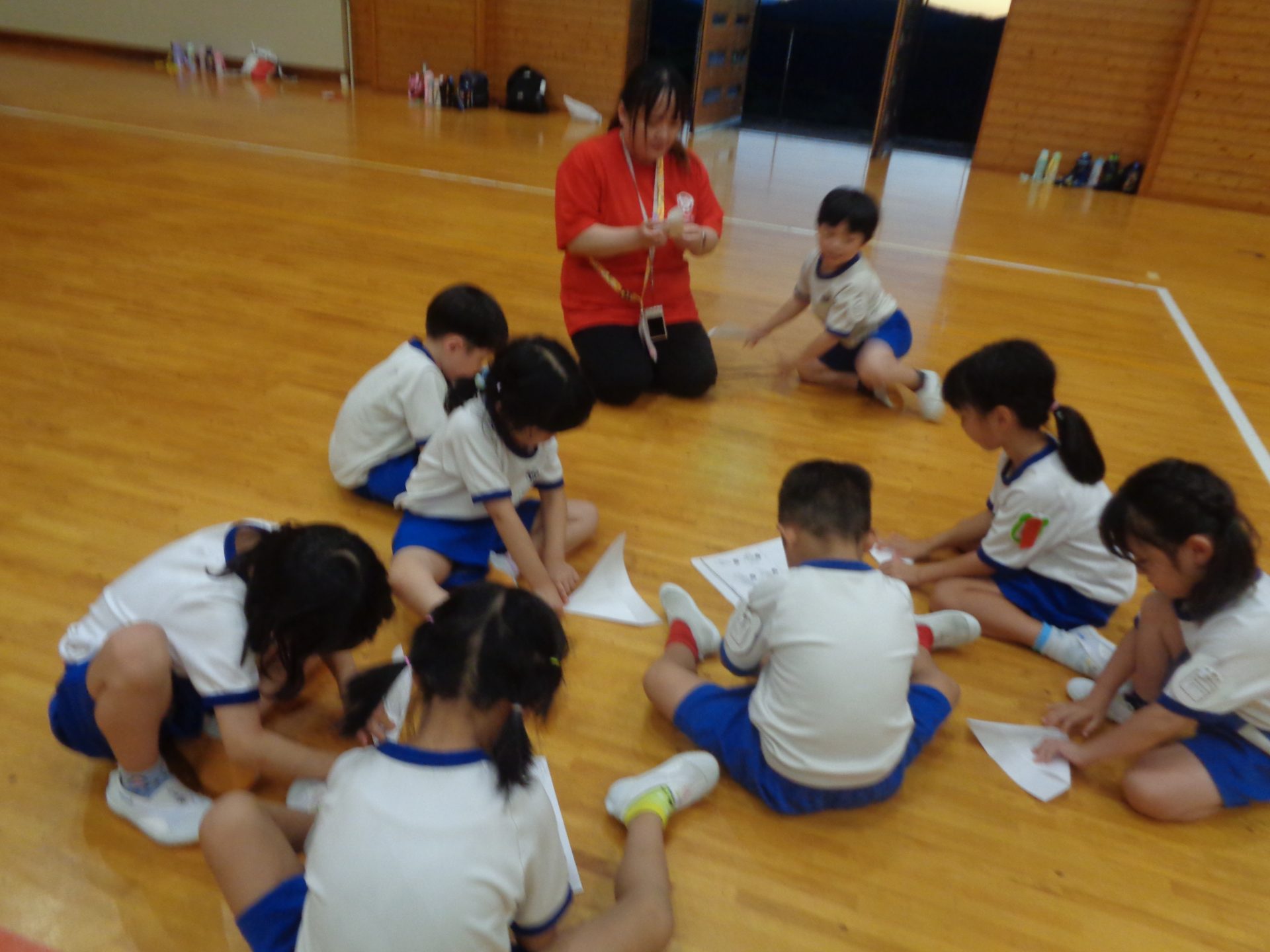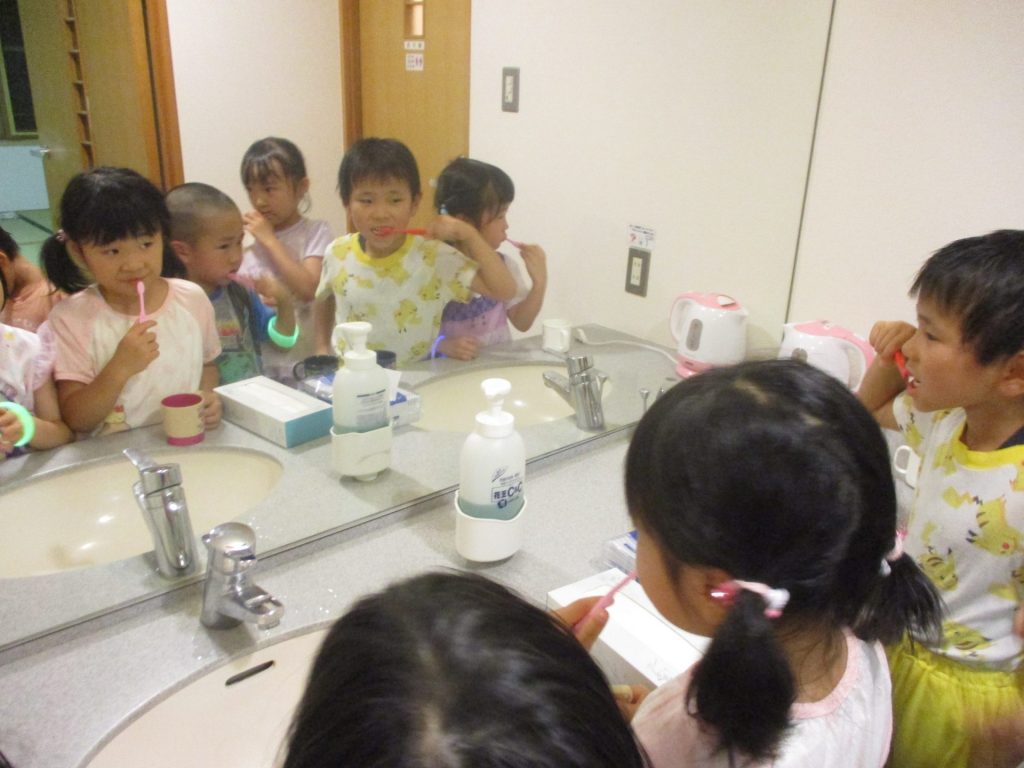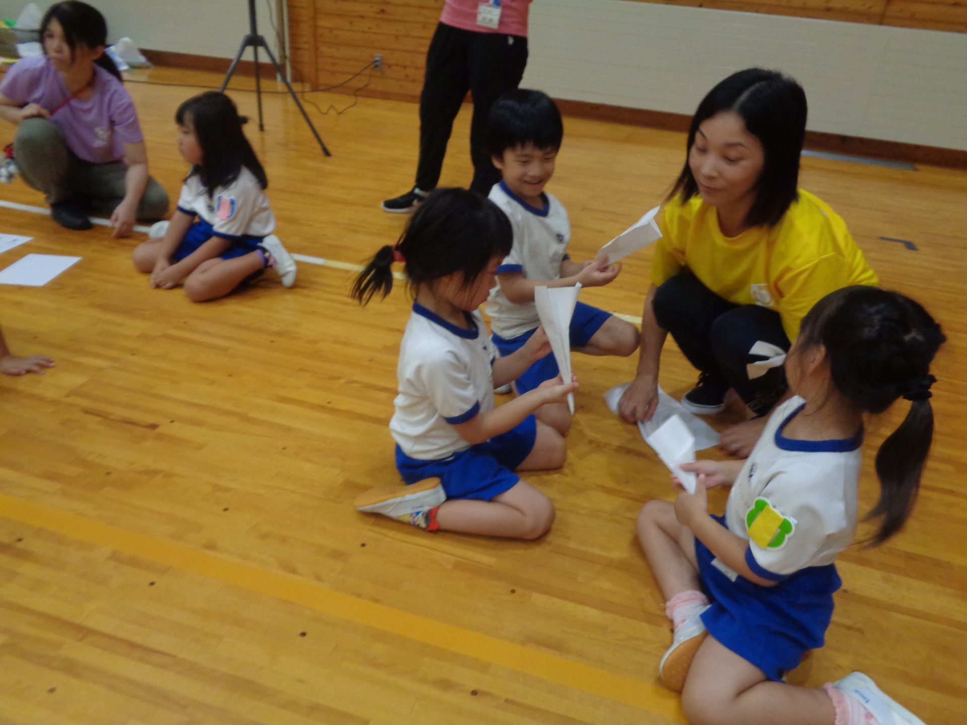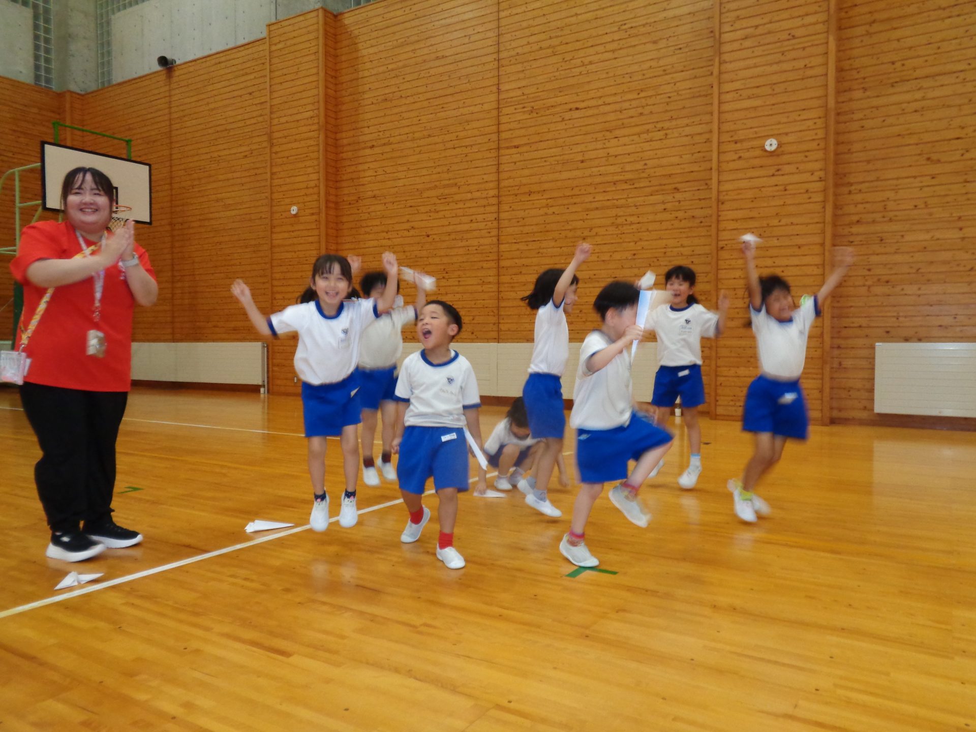 まだまだ楽しい時間は続きます。体育館に集まって、ゆうべのつどいをしました。先生クイズや紙飛行機大会、お楽しみコーナーでは先生たちのダンスがありました♪みんなも、腕に付けたサイリウムを振って応援してくれました♪