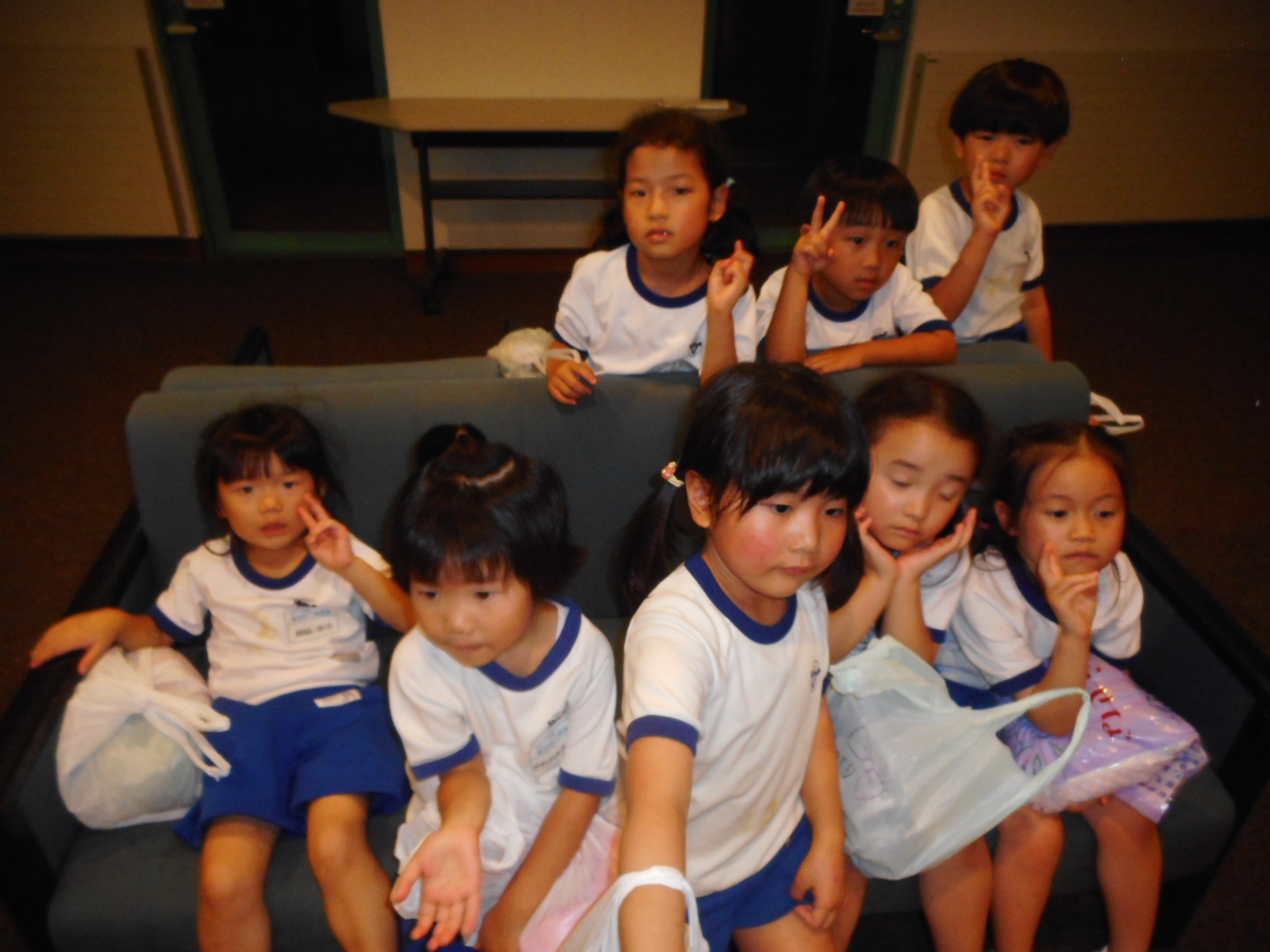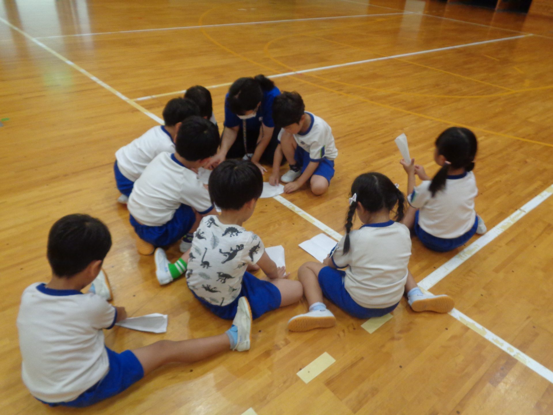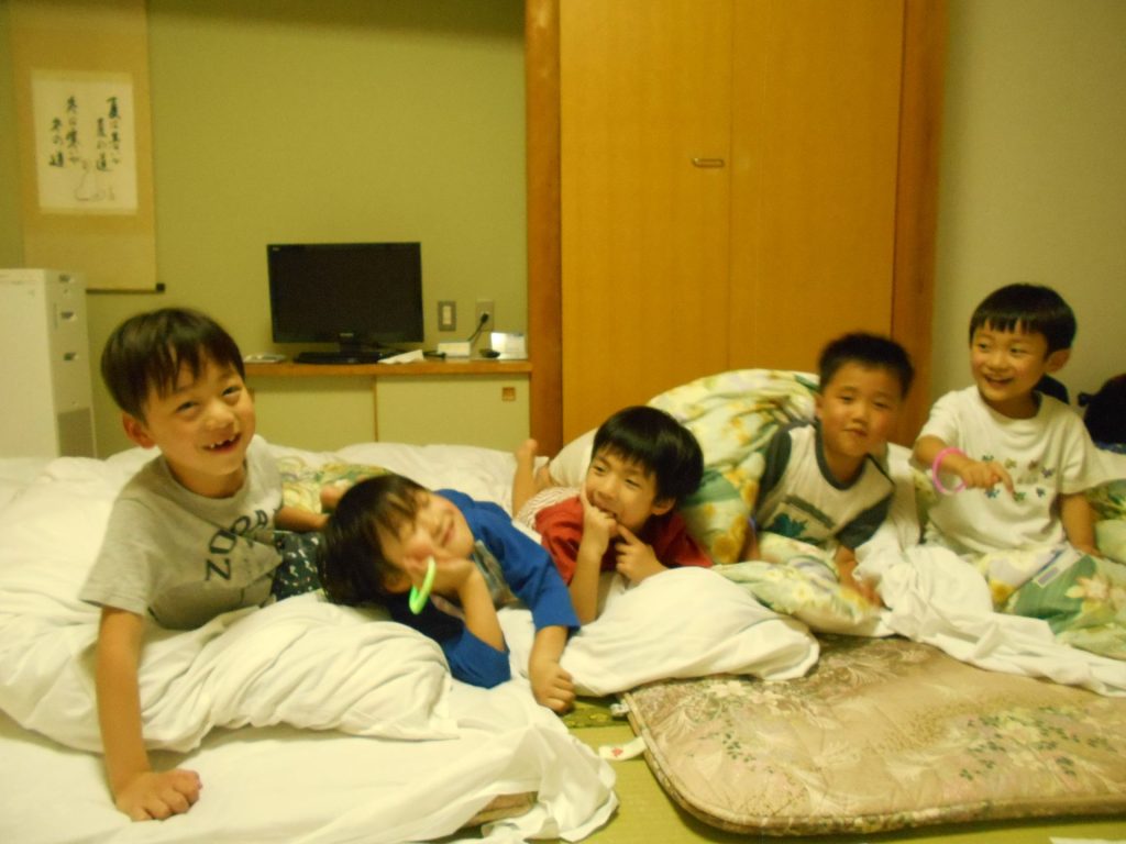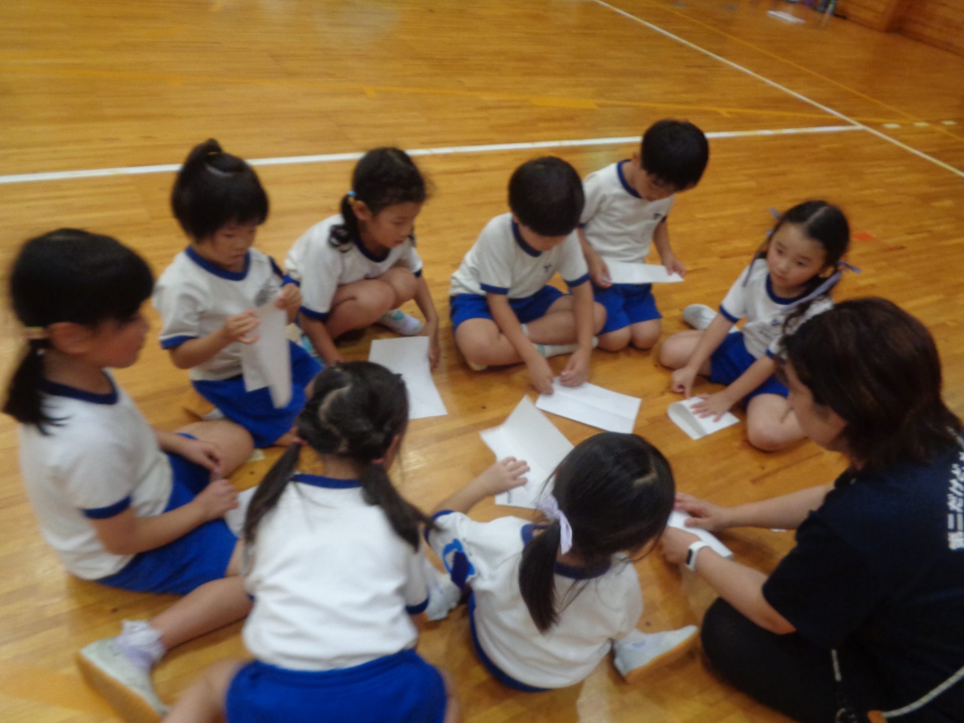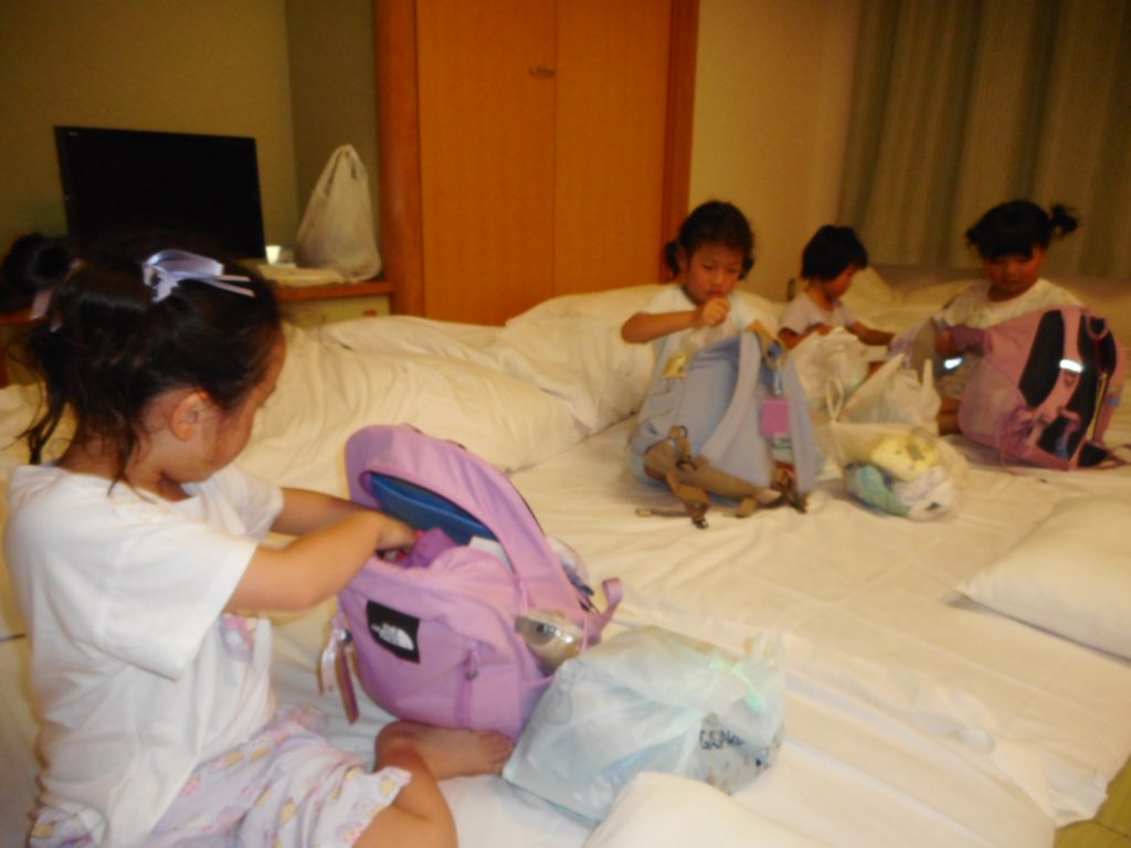 まだまだ楽しい時間は続きます。体育館に集まって、ゆうべのつどいをしました。先生クイズや紙飛行機大会、お楽しみコーナーでは先生たちのダンスがありました♪みんなも、腕に付けたサイリウムを振って応援してくれました♪