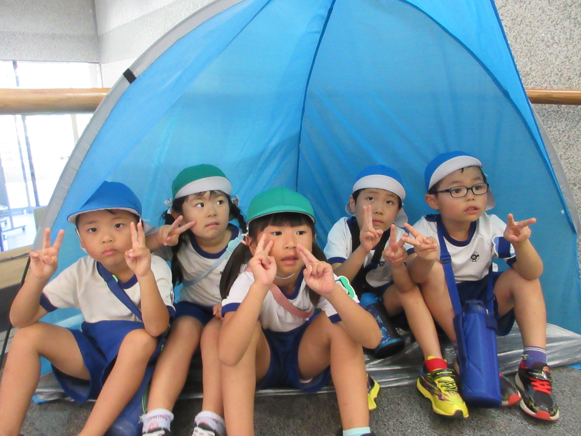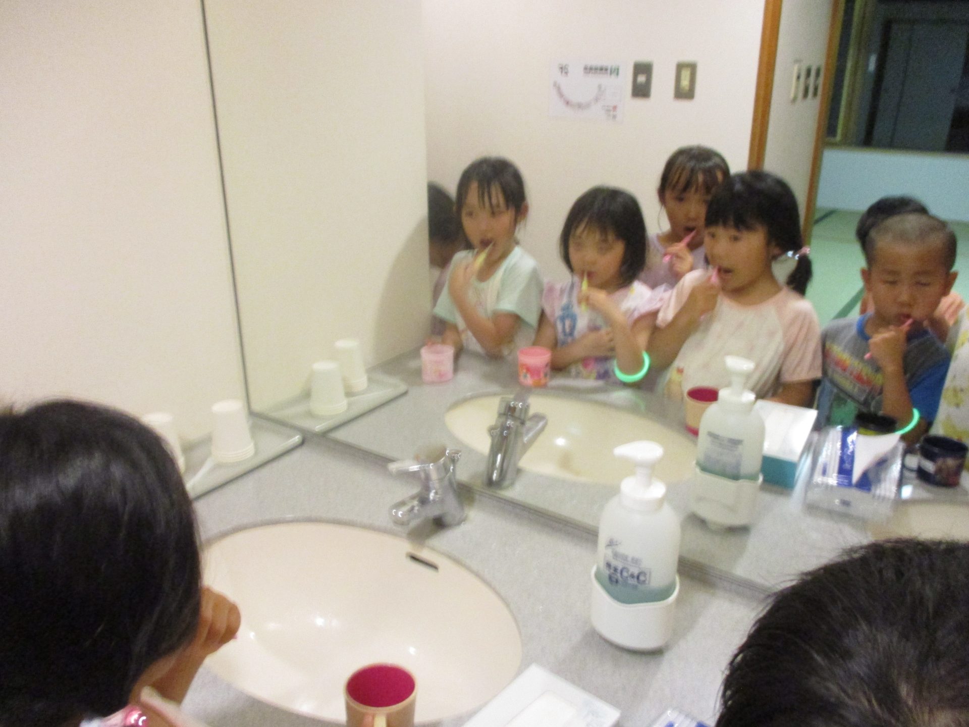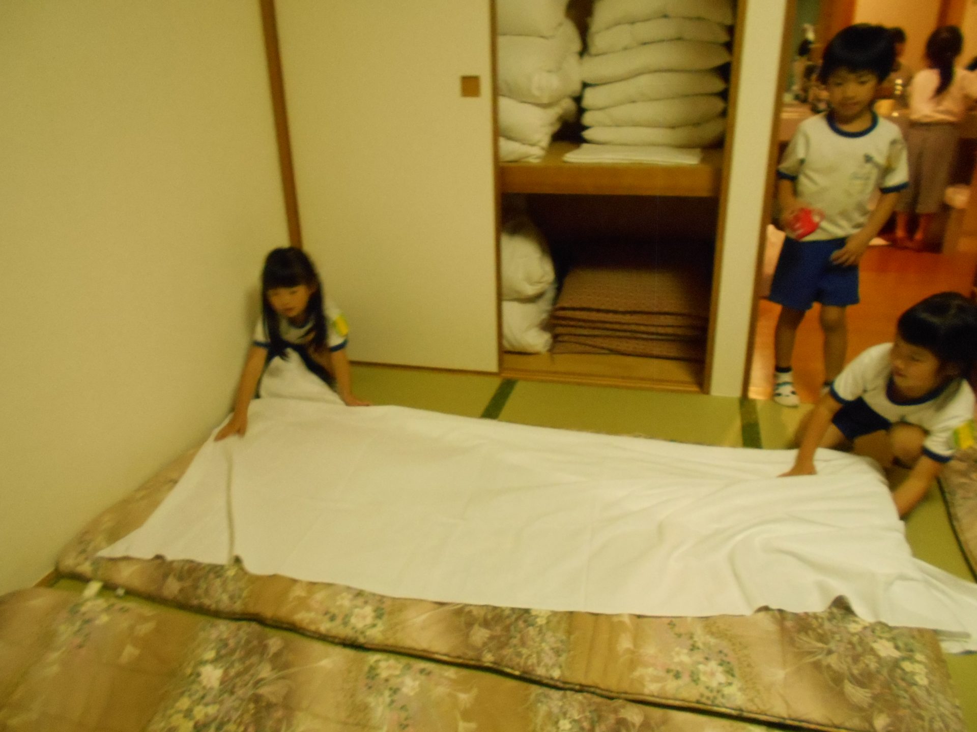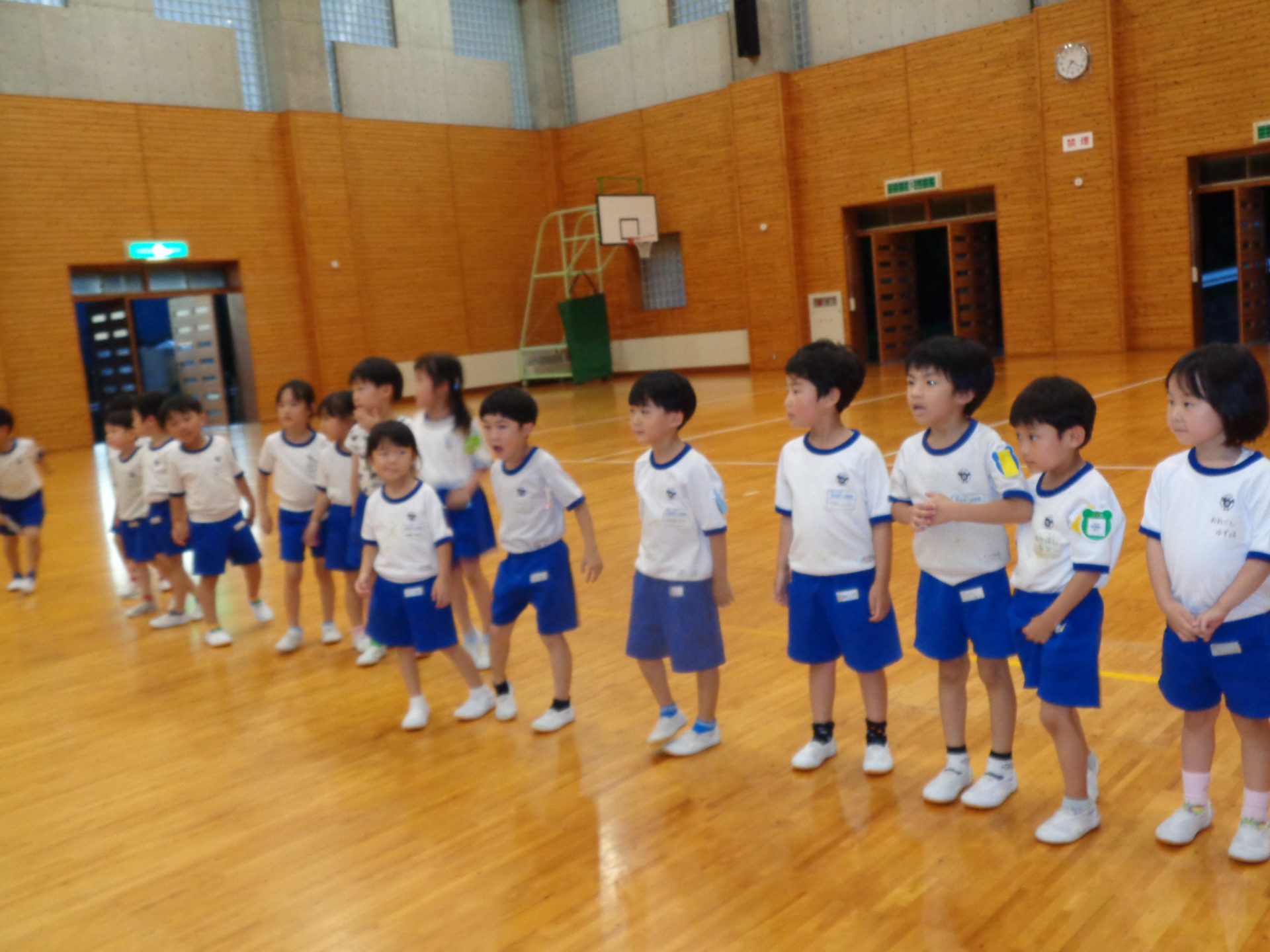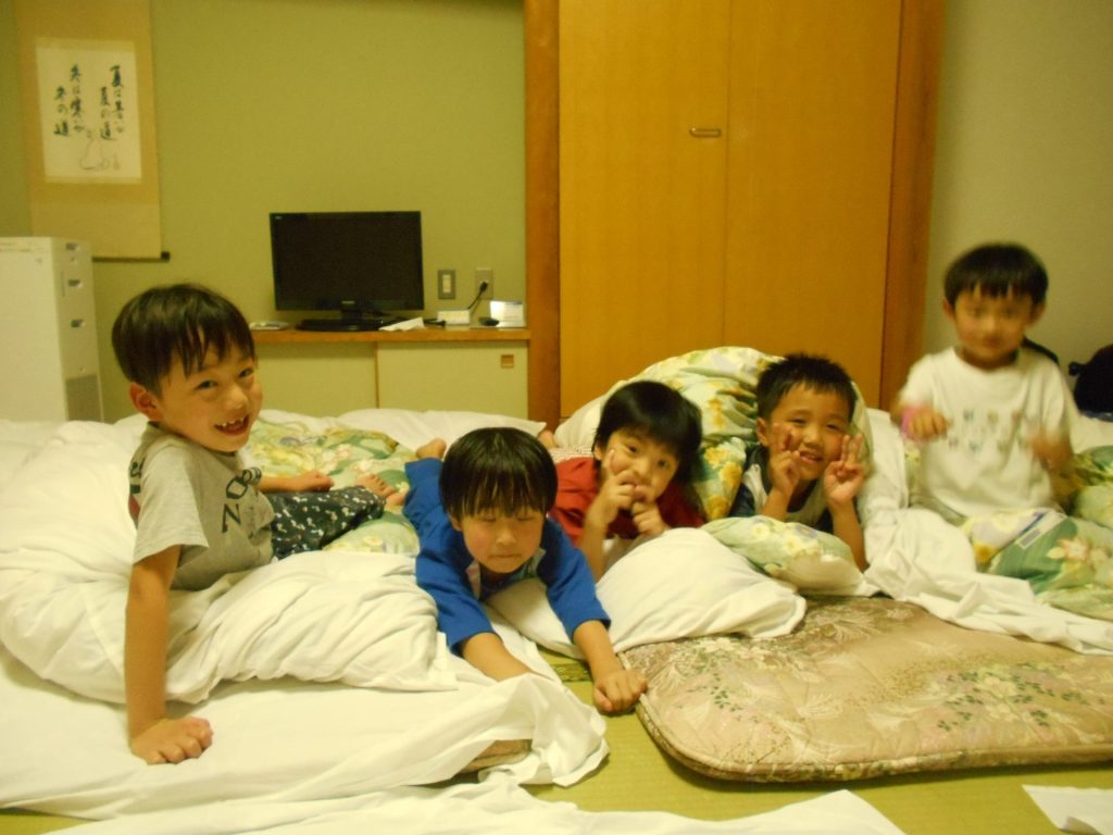 まだまだ楽しい時間は続きます。体育館に集まって、ゆうべのつどいをしました。先生クイズや紙飛行機大会、お楽しみコーナーでは先生たちのダンスがありました♪みんなも、腕に付けたサイリウムを振って応援してくれました♪
