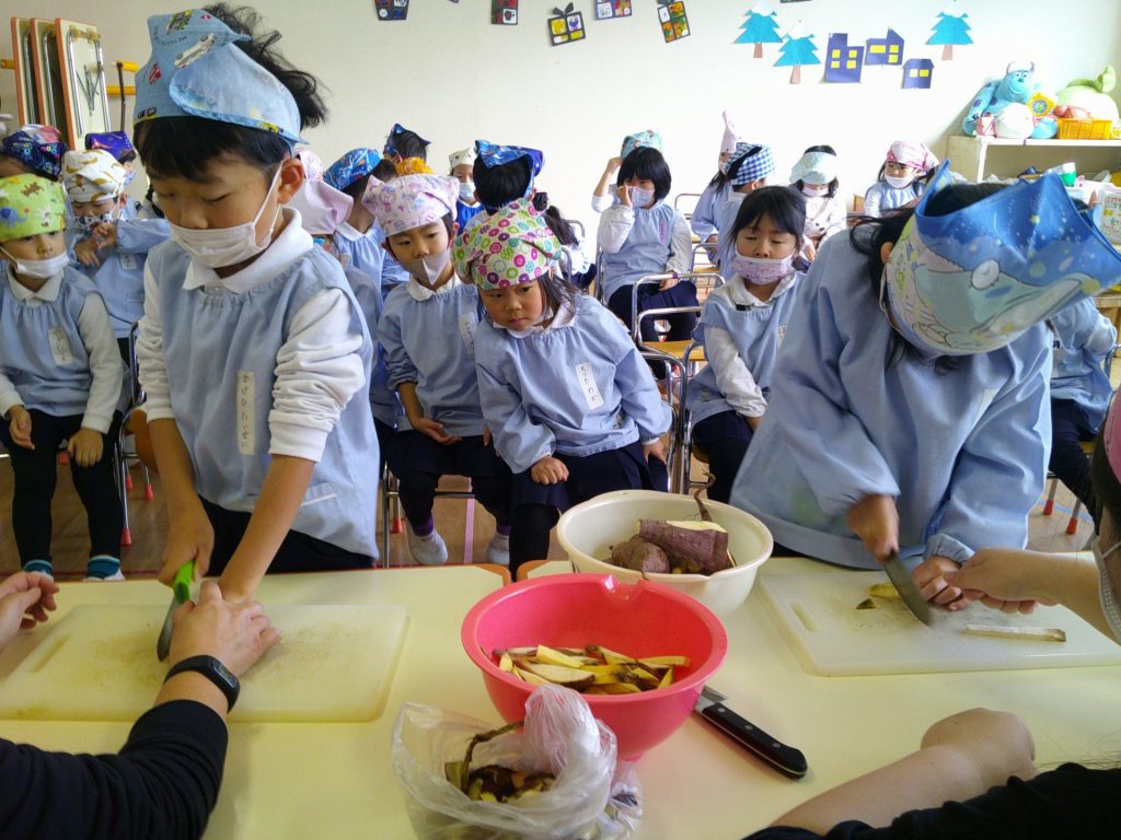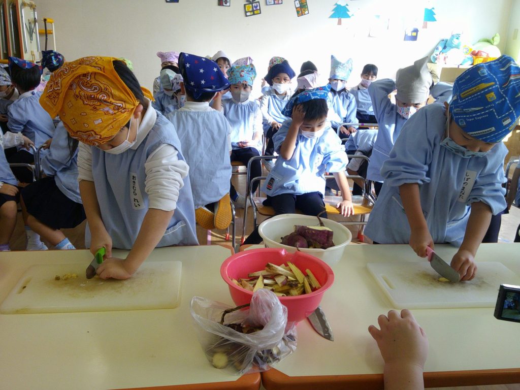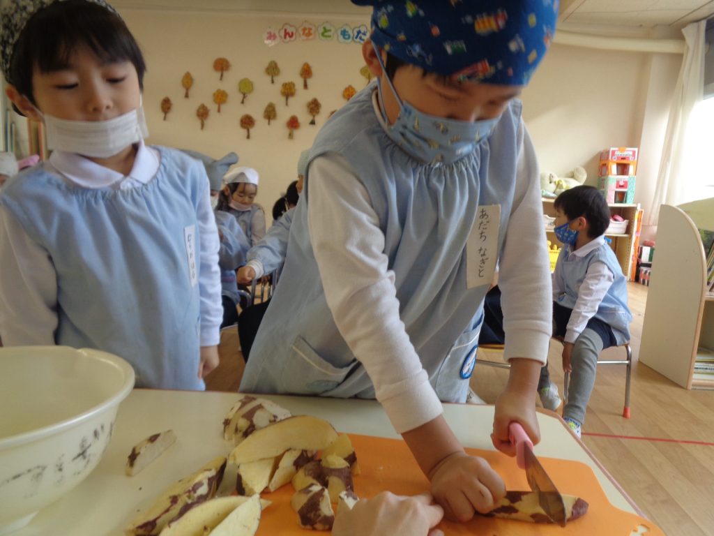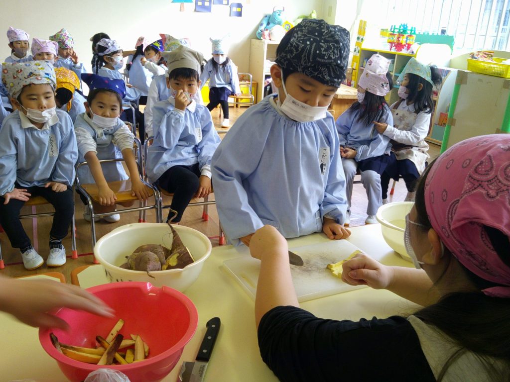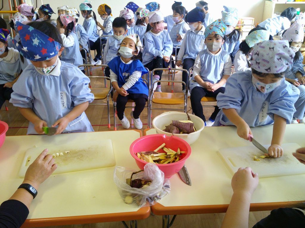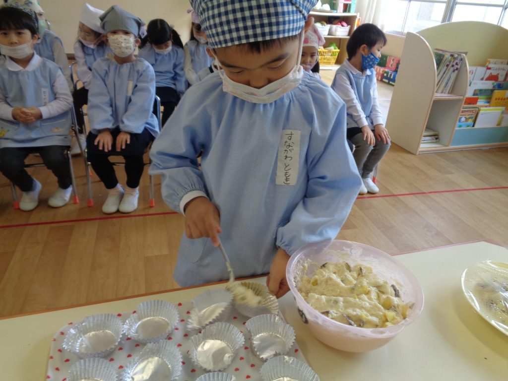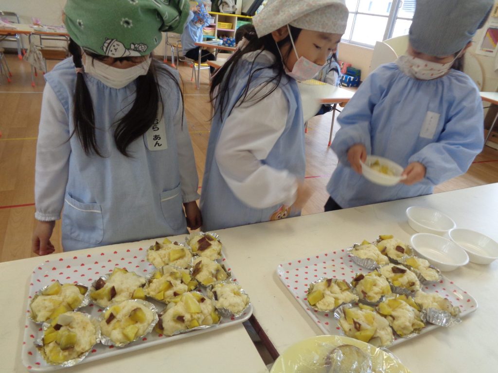 さつまいもクッキング第2弾の様子です。園の畑で収穫したさつまいもを使って蒸しパン作りをしました!