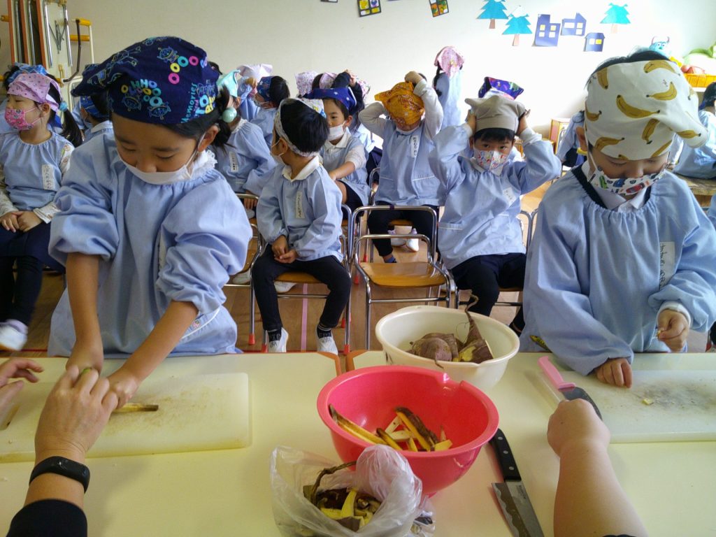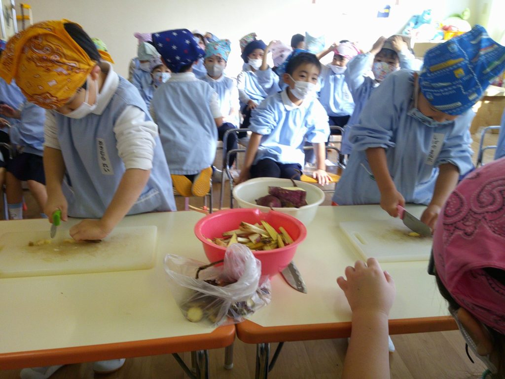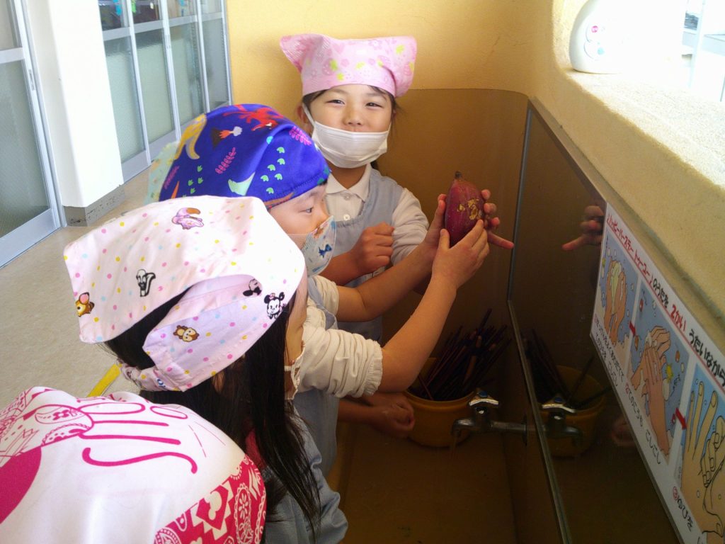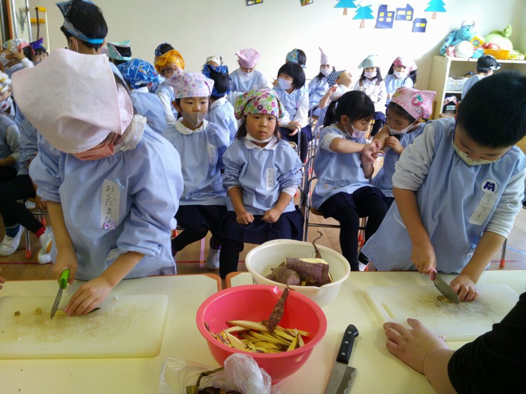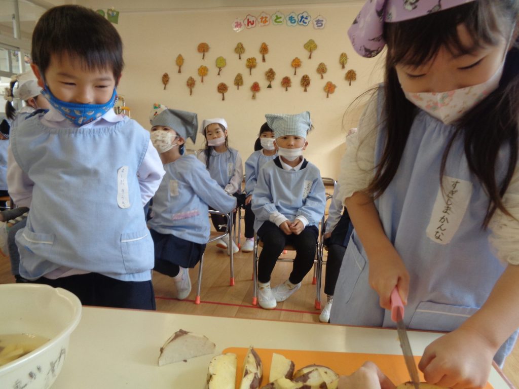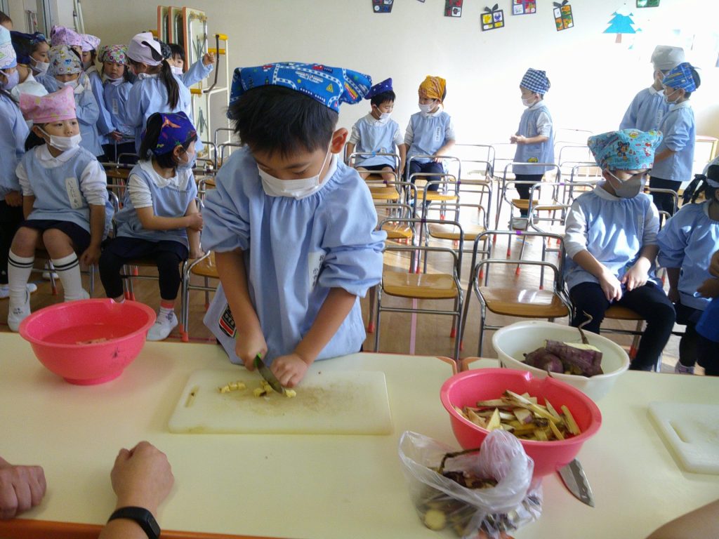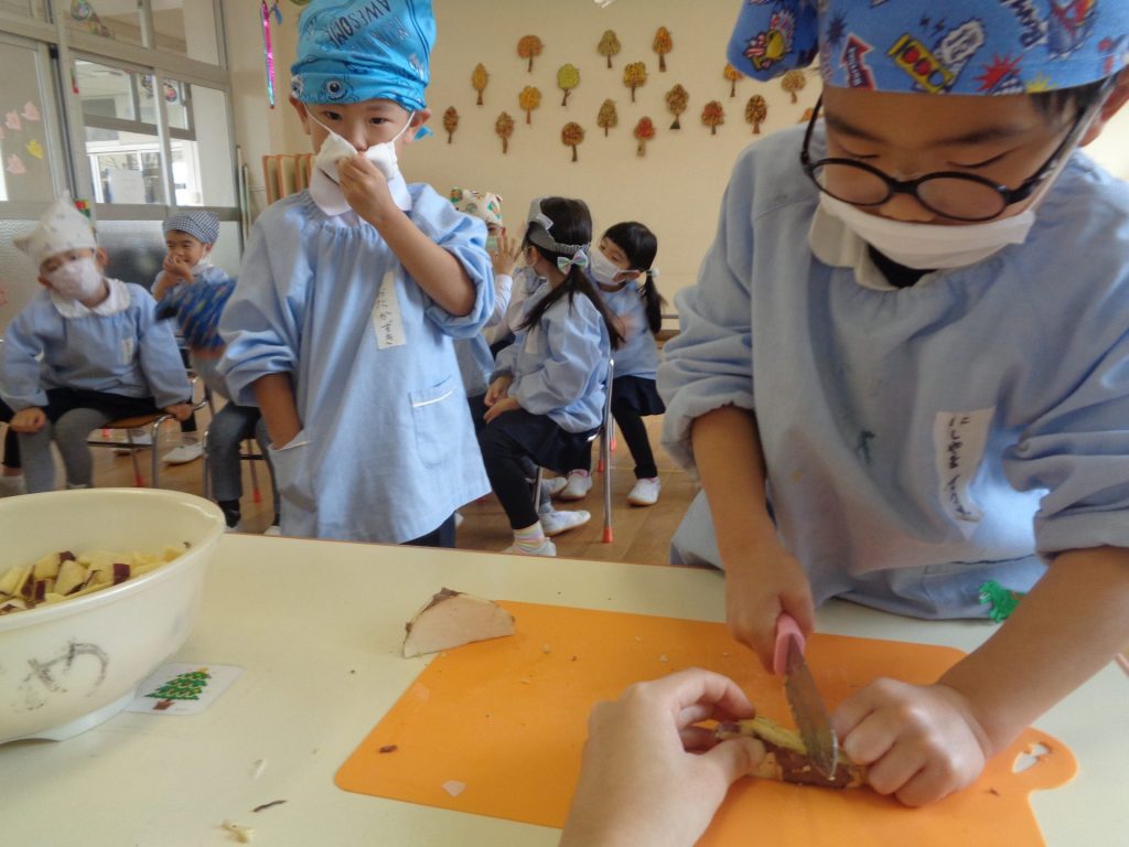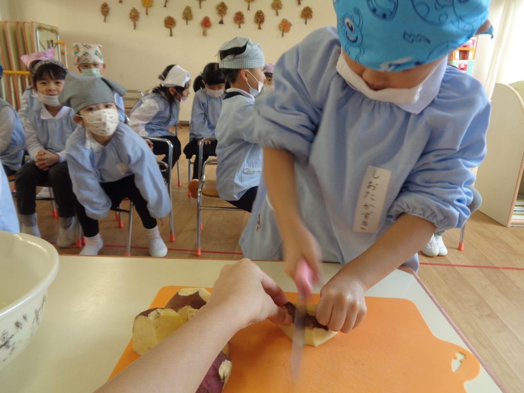 さつまいもクッキング第2弾の様子です。園の畑で収穫したさつまいもを使って蒸しパン作りをしました!