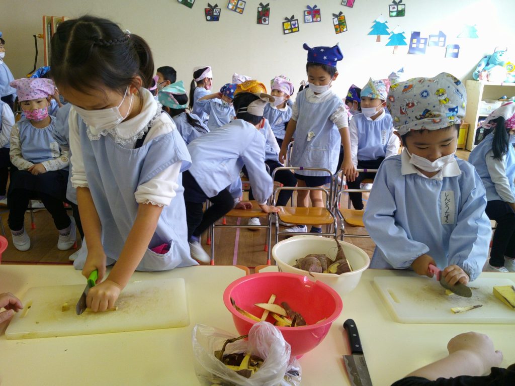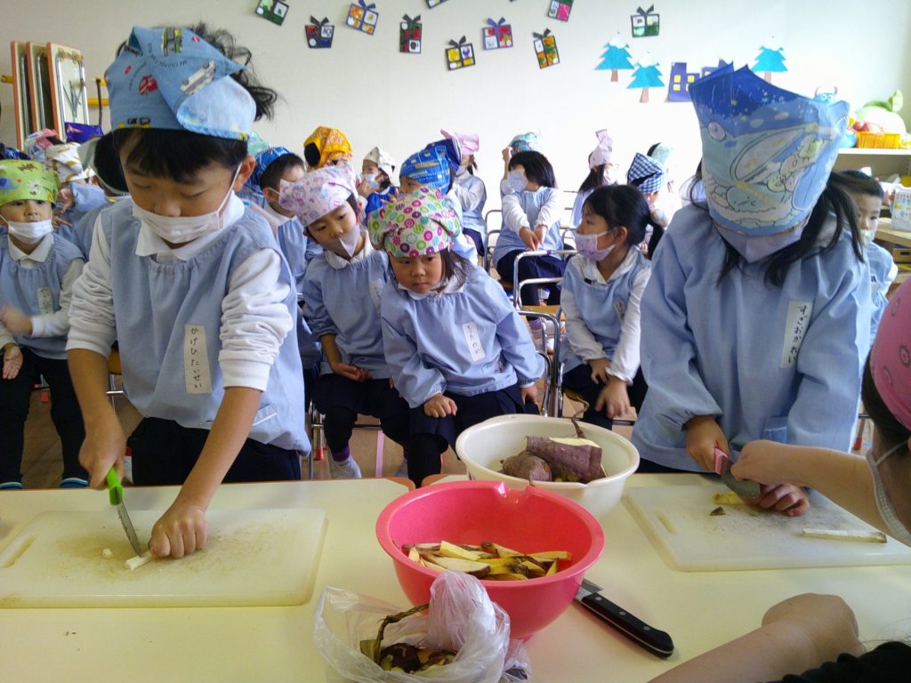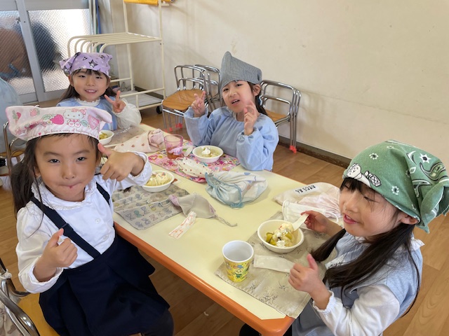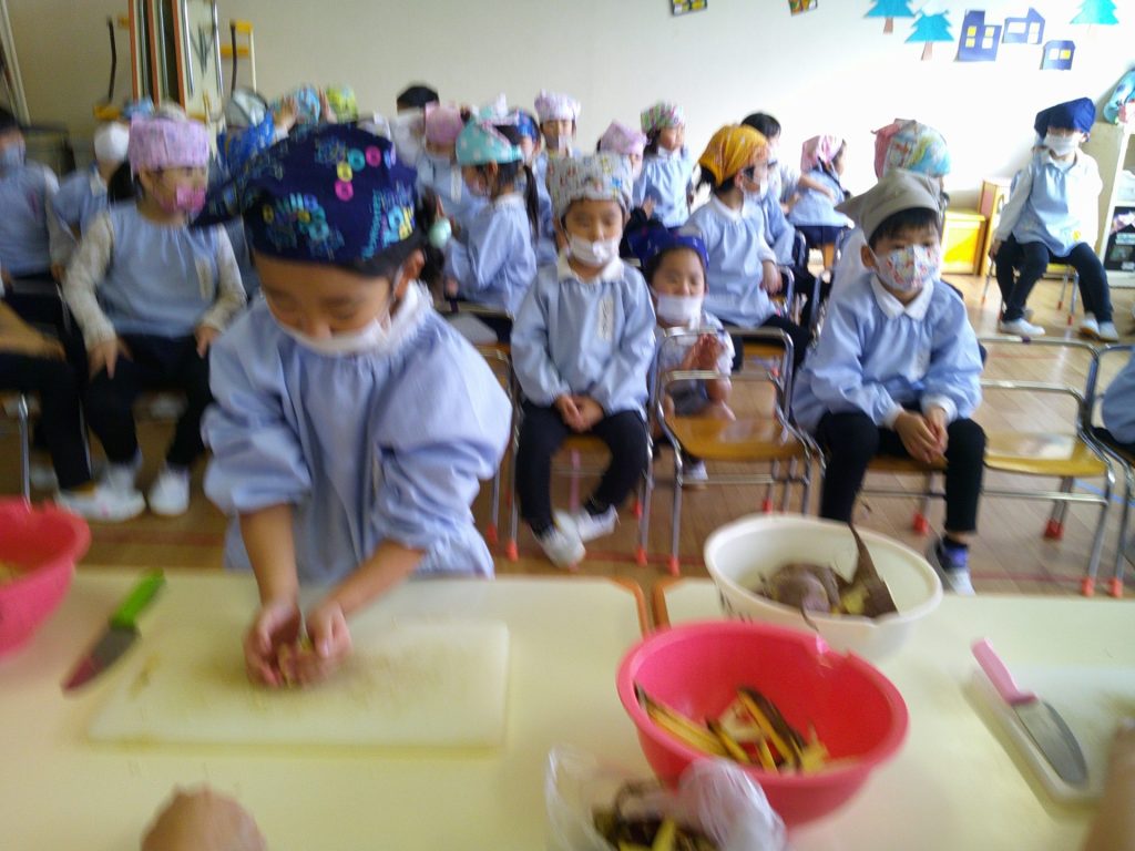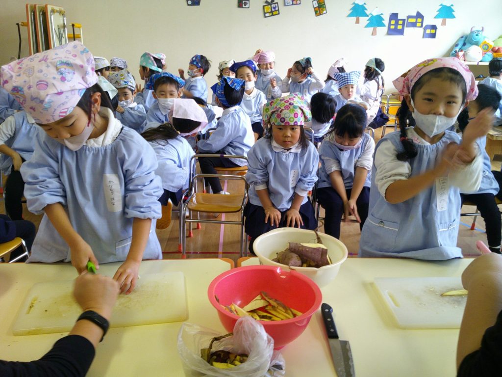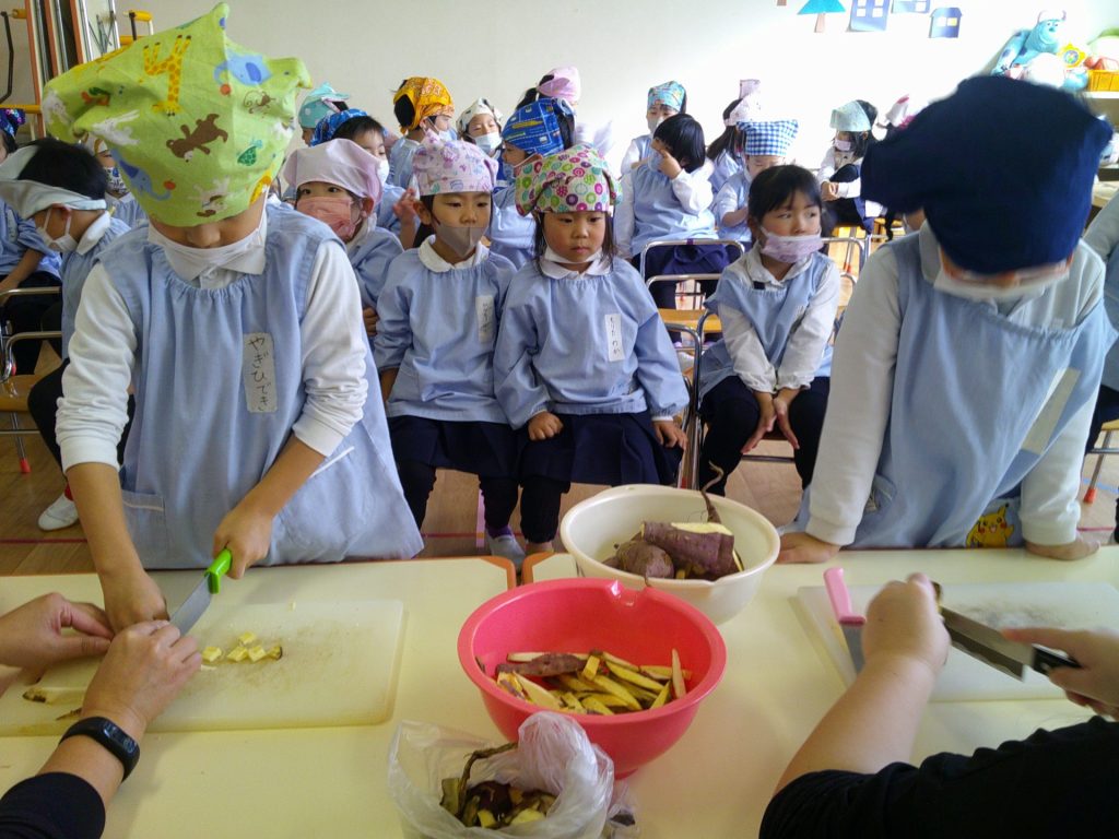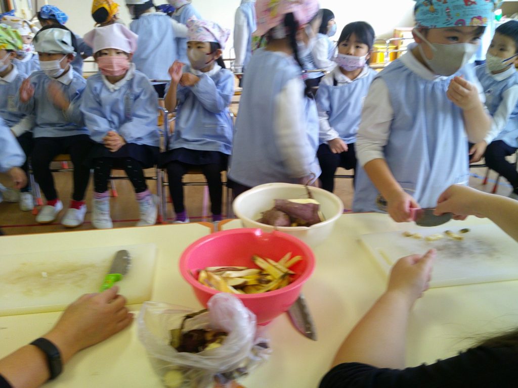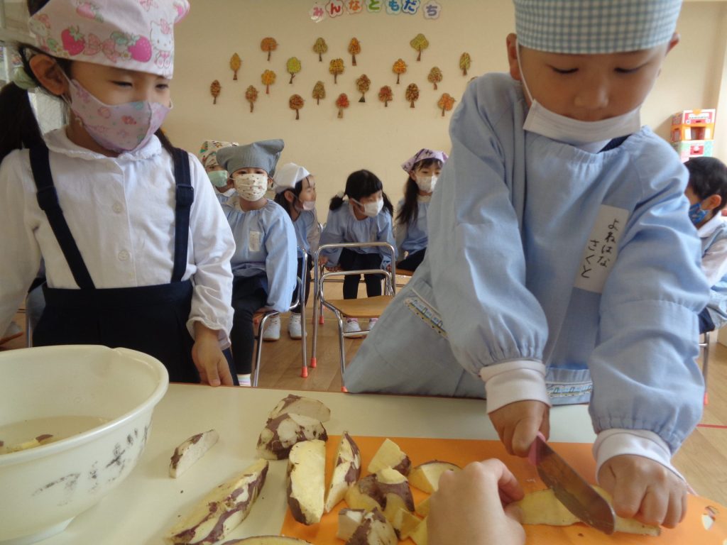 さつまいもクッキング第2弾の様子です。園の畑で収穫したさつまいもを使って蒸しパン作りをしました!