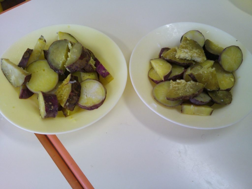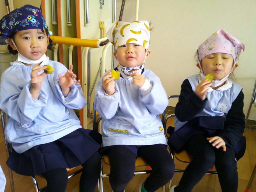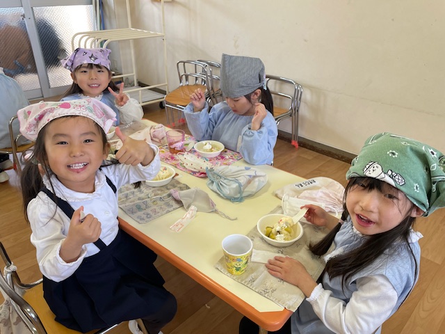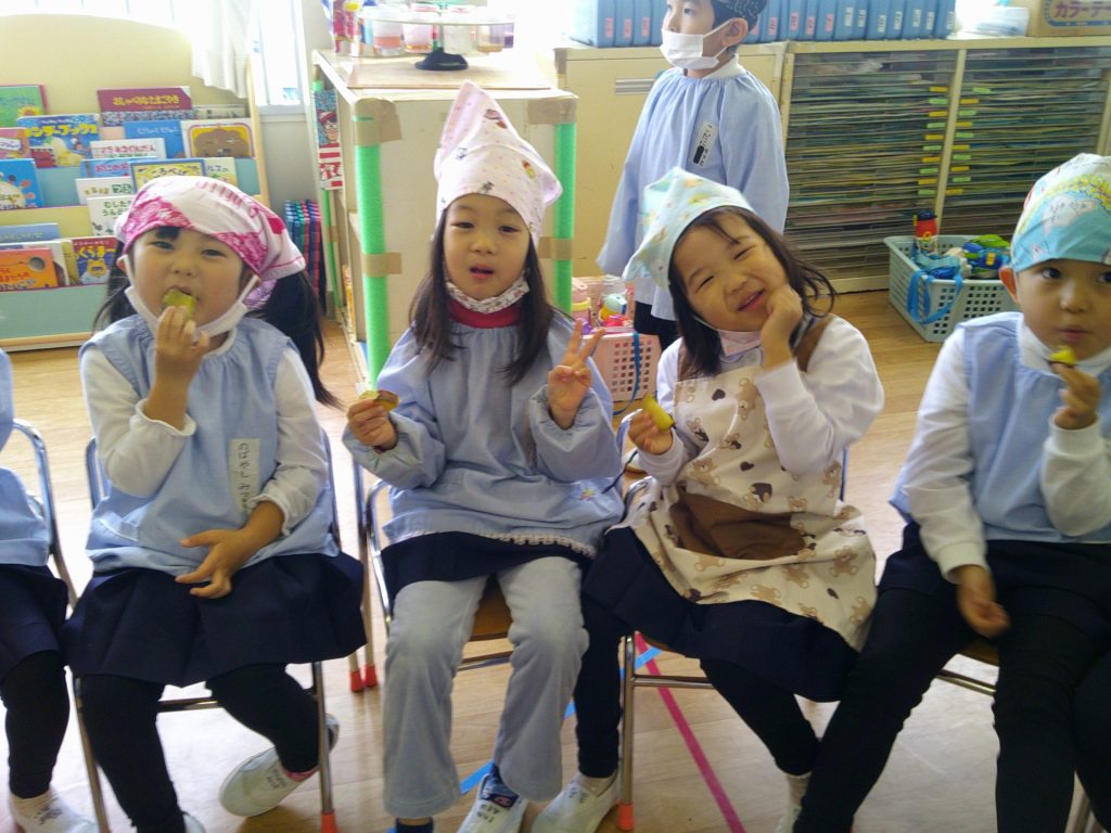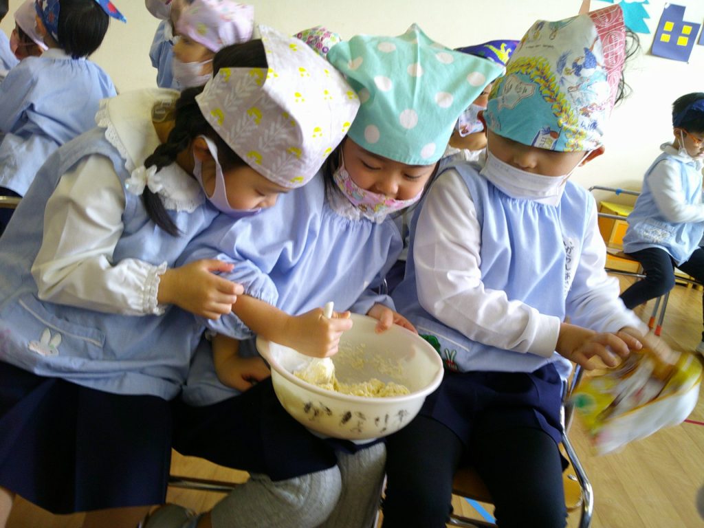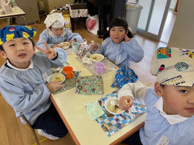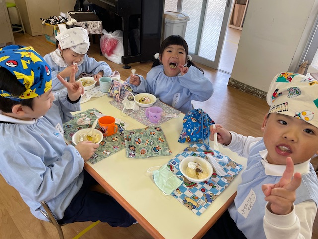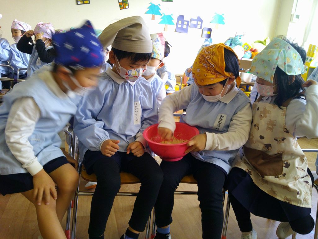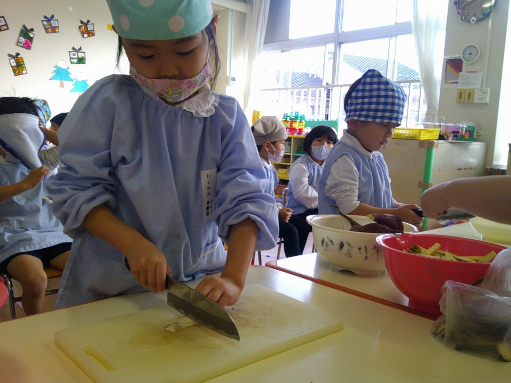 さつまいもクッキング第2弾の様子です。園の畑で収穫したさつまいもを使って蒸しパン作りをしました!