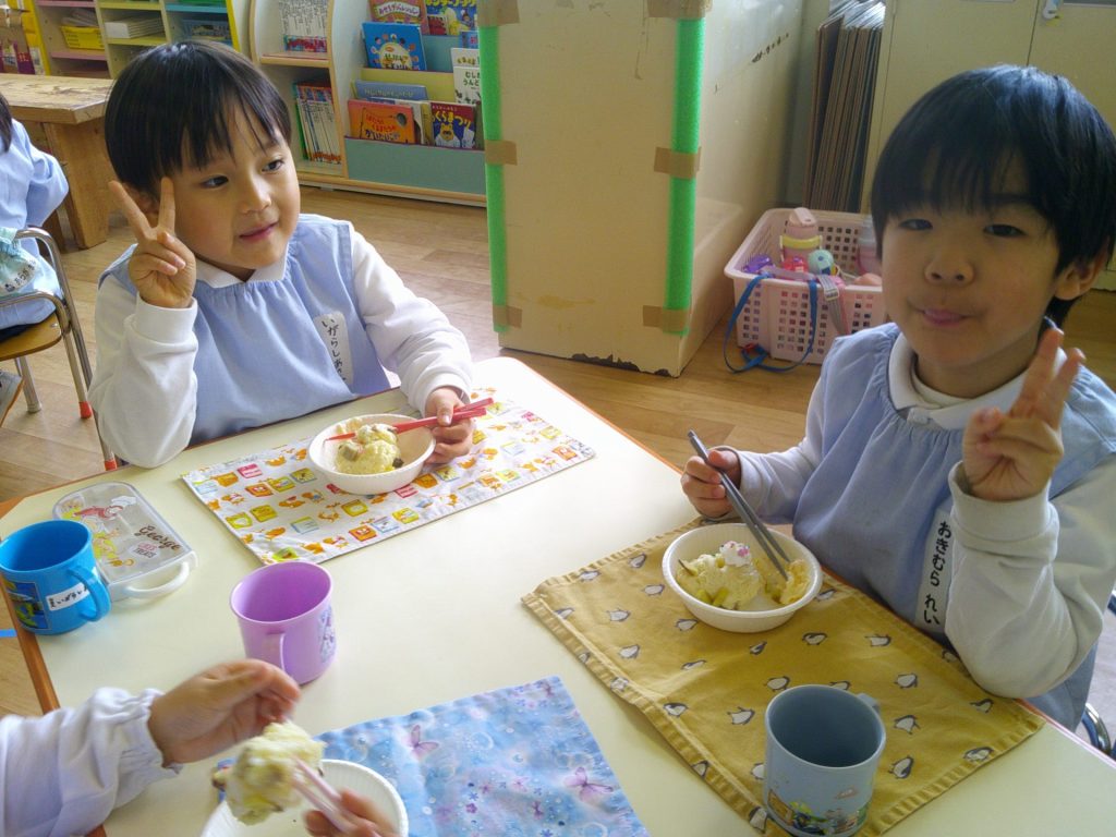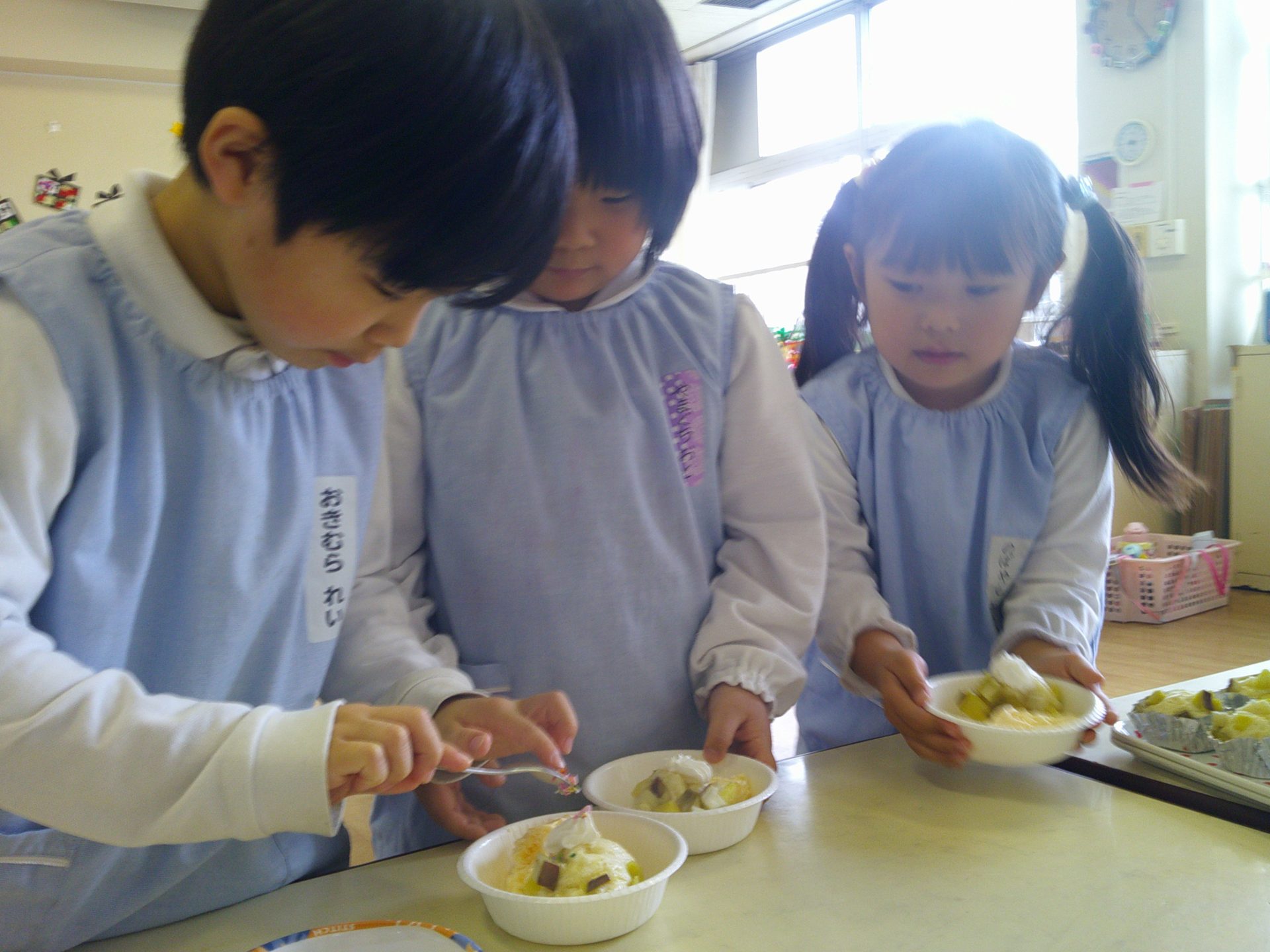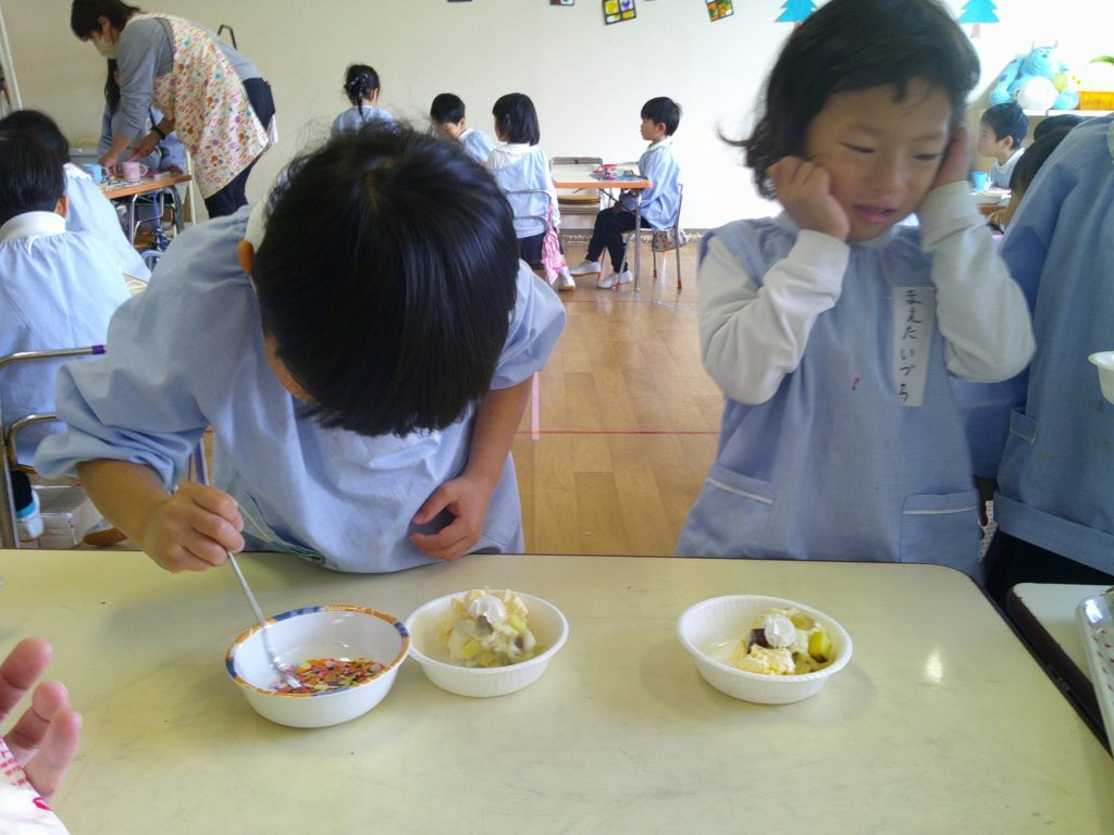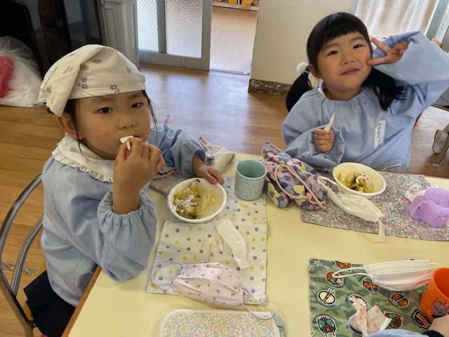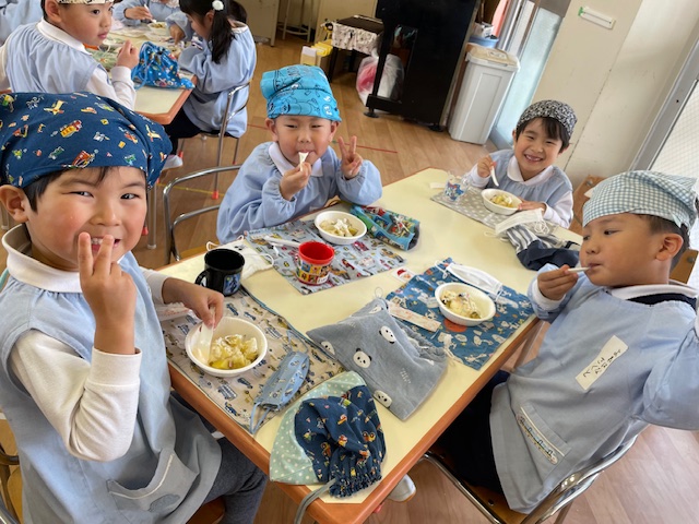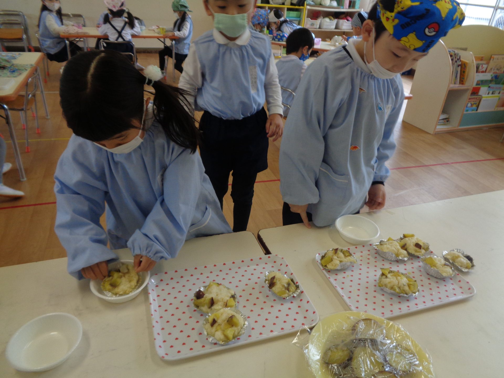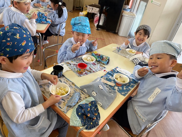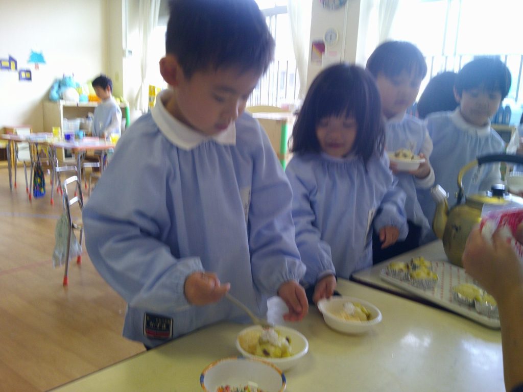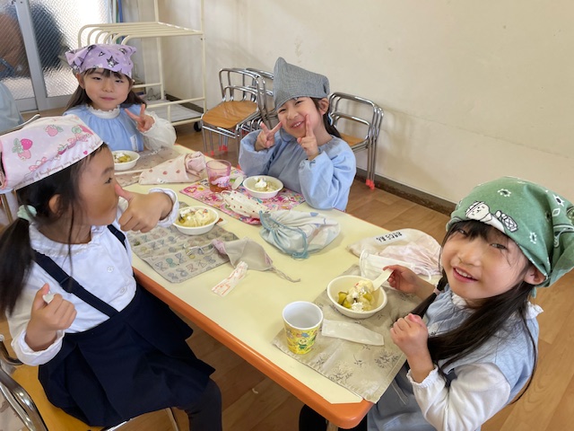 さつまいもクッキング第2弾の様子です。園の畑で収穫したさつまいもを使って蒸しパン作りをしました!