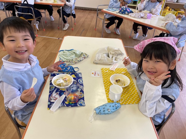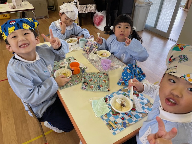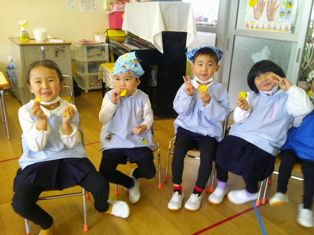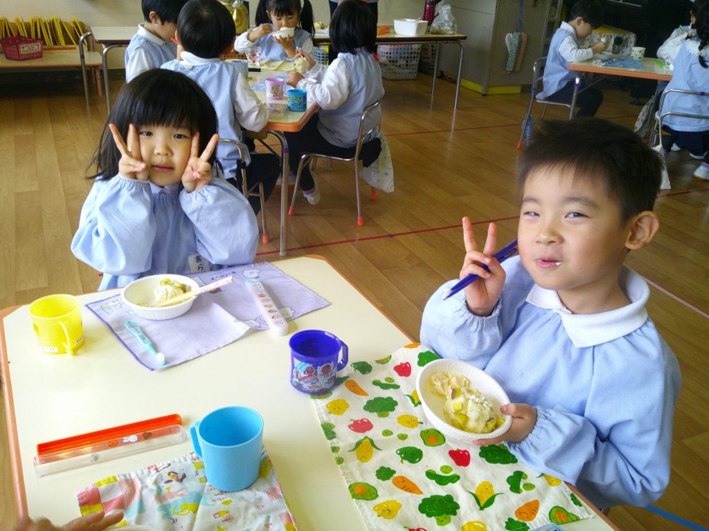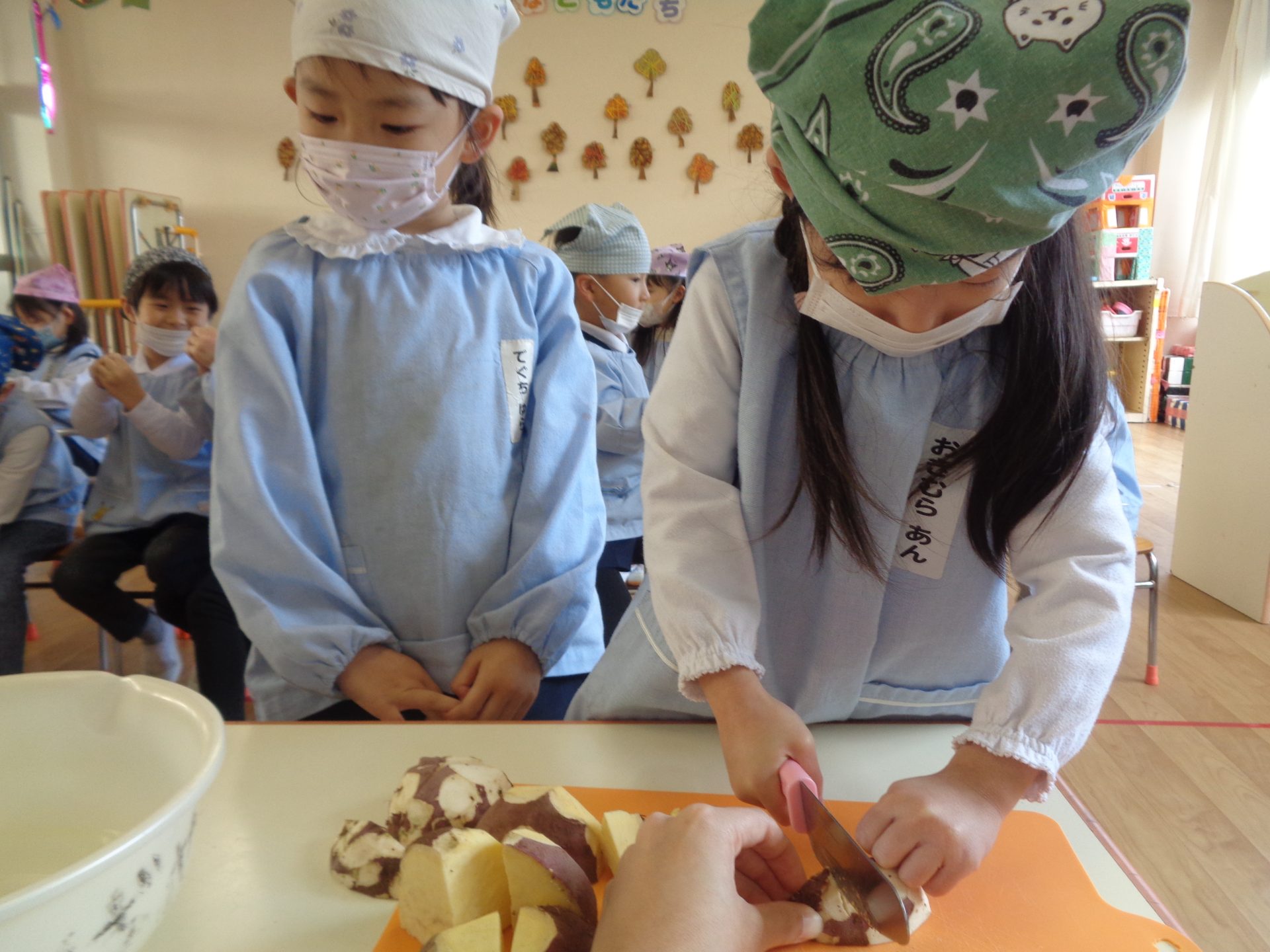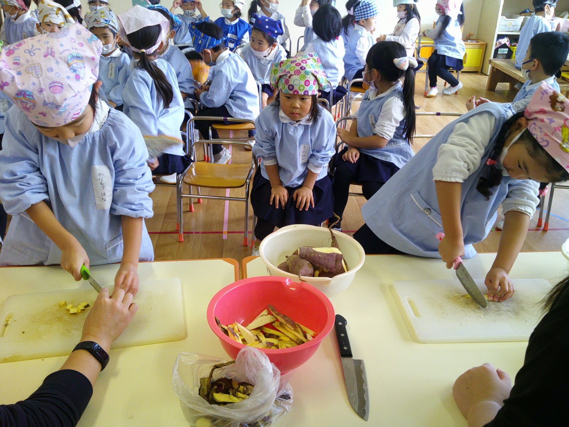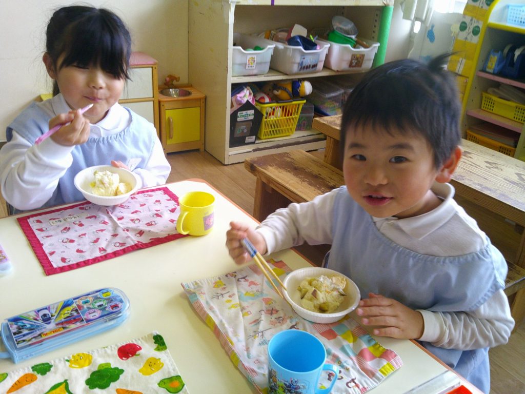 さつまいもクッキング第2弾の様子です。園の畑で収穫したさつまいもを使って蒸しパン作りをしました!