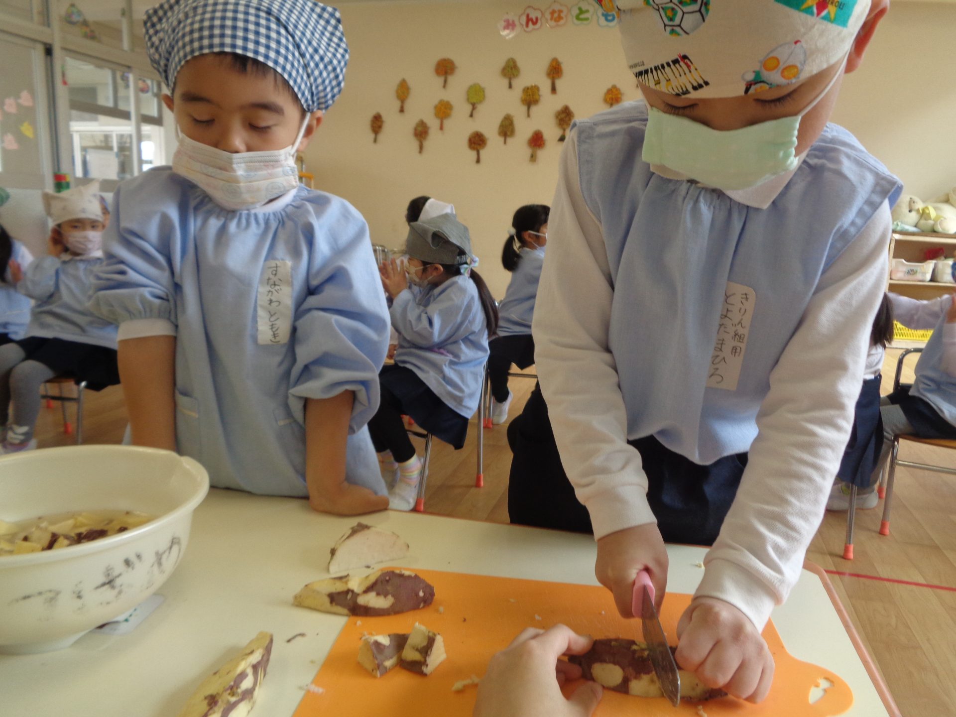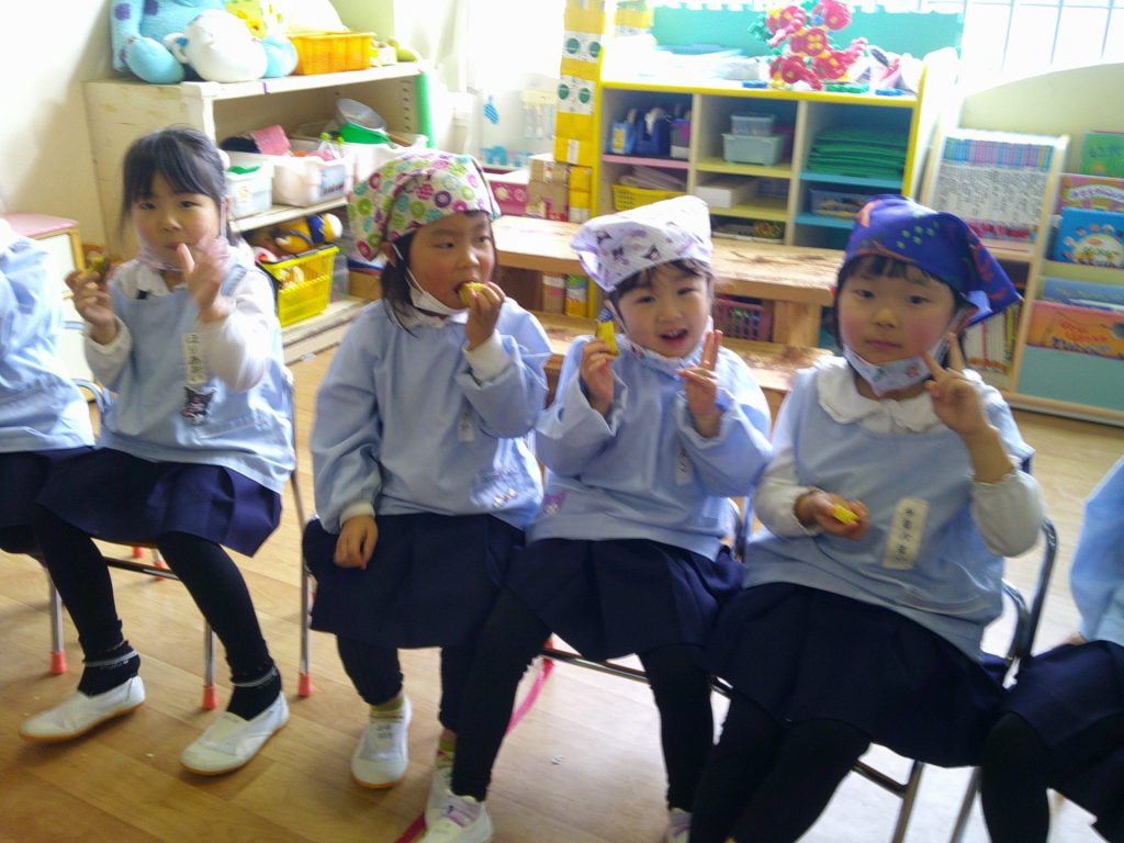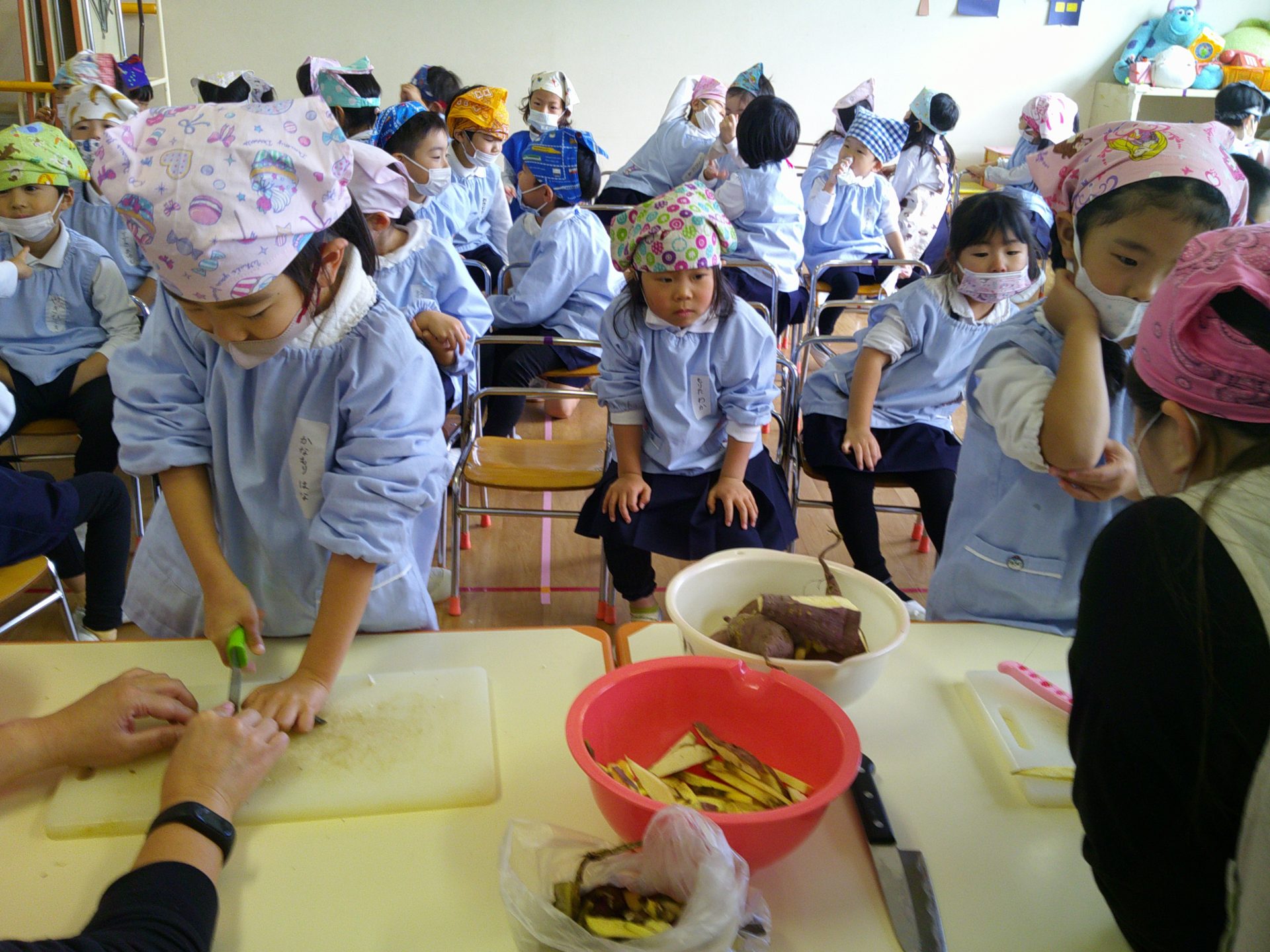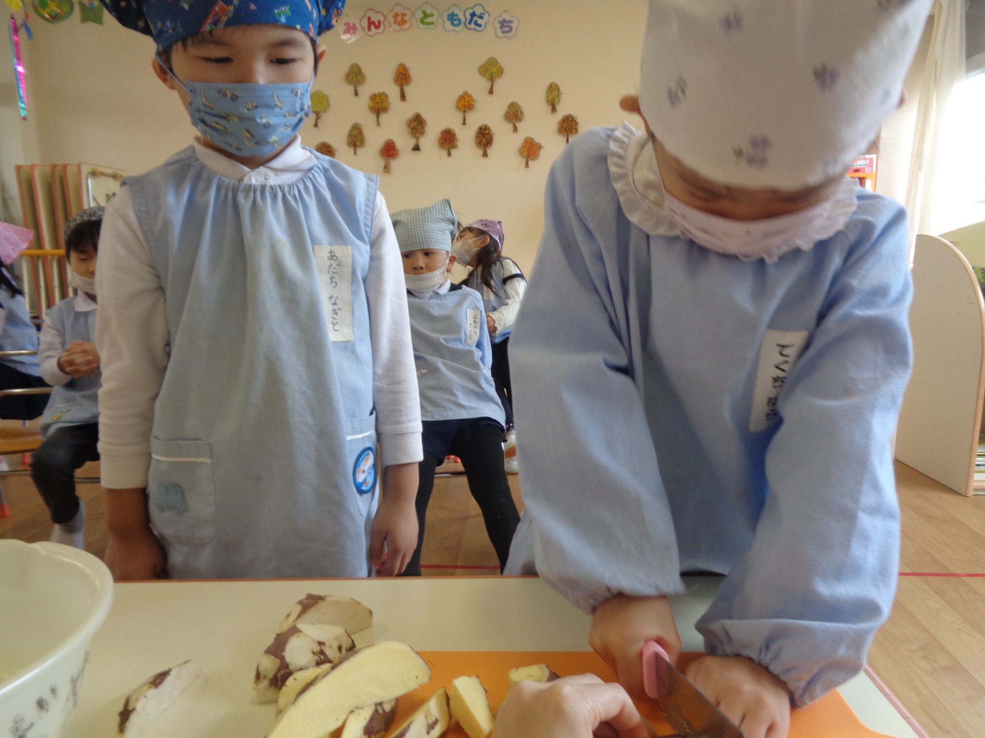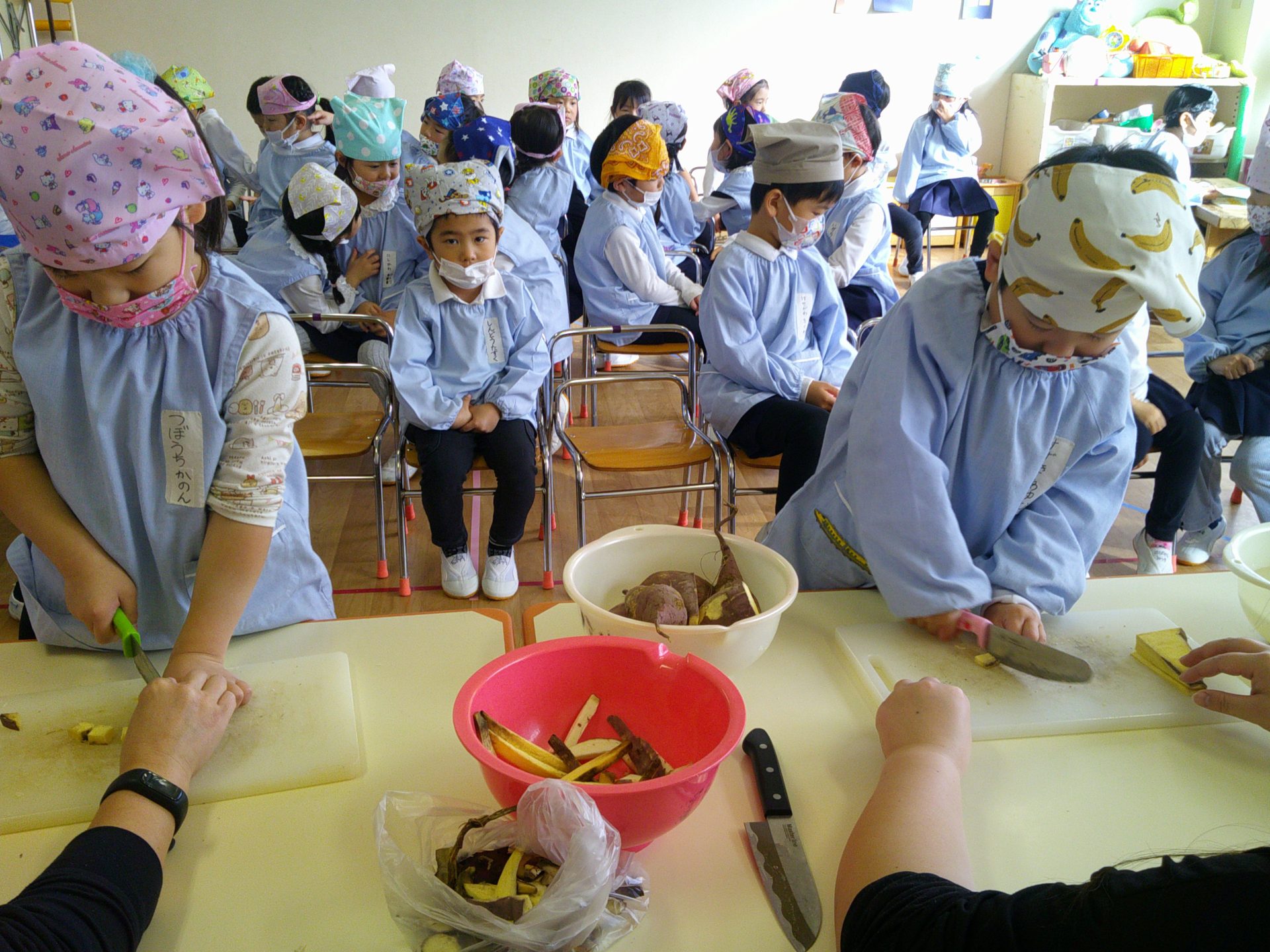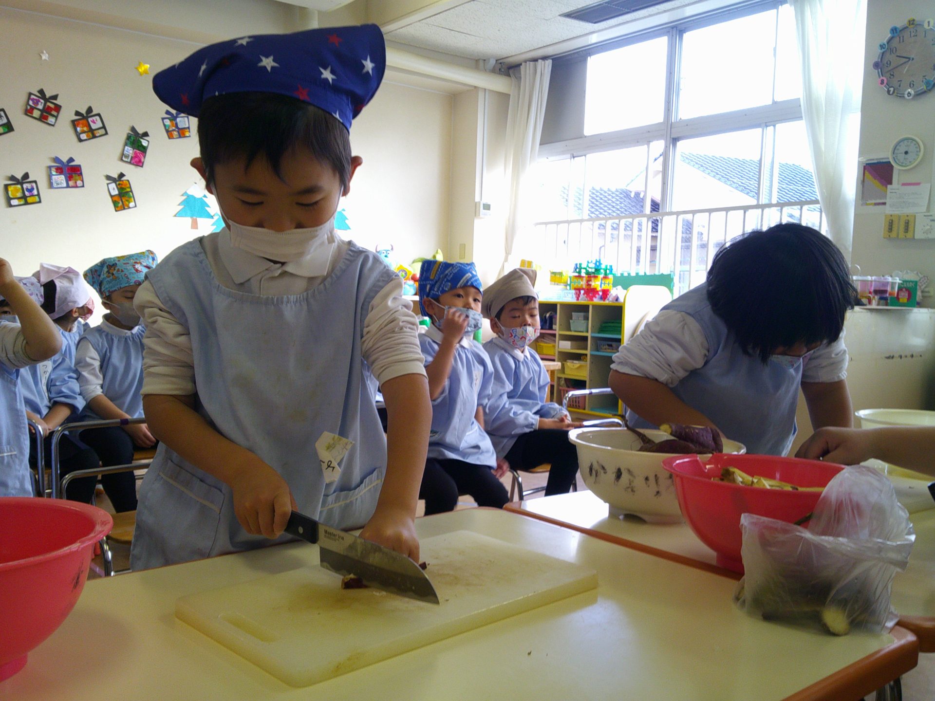 さつまいもクッキング第2弾の様子です。園の畑で収穫したさつまいもを使って蒸しパン作りをしました!