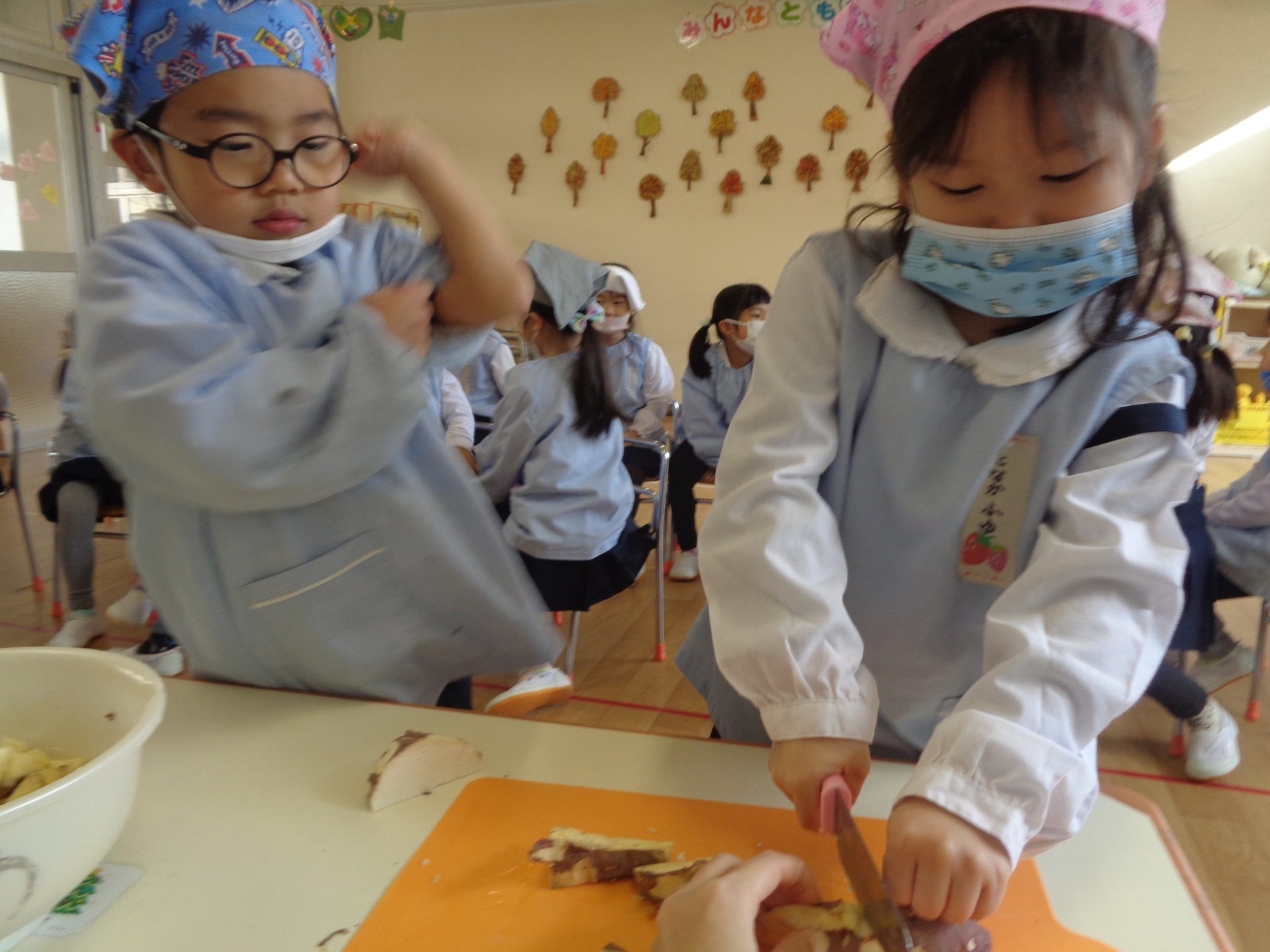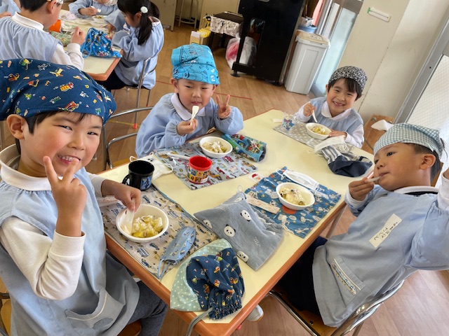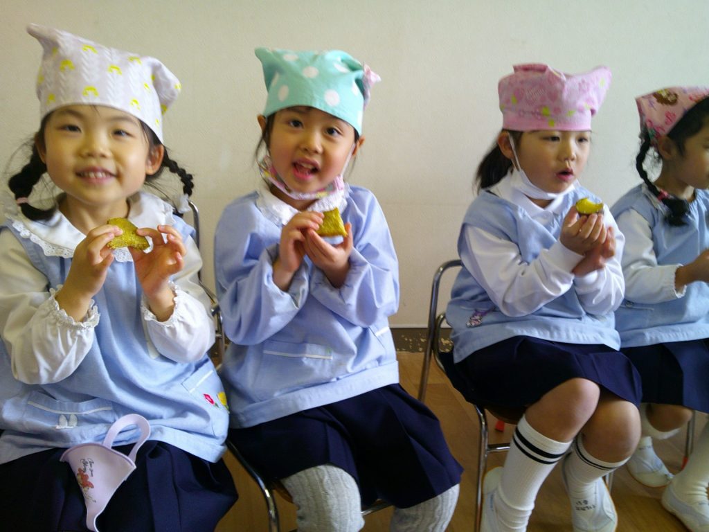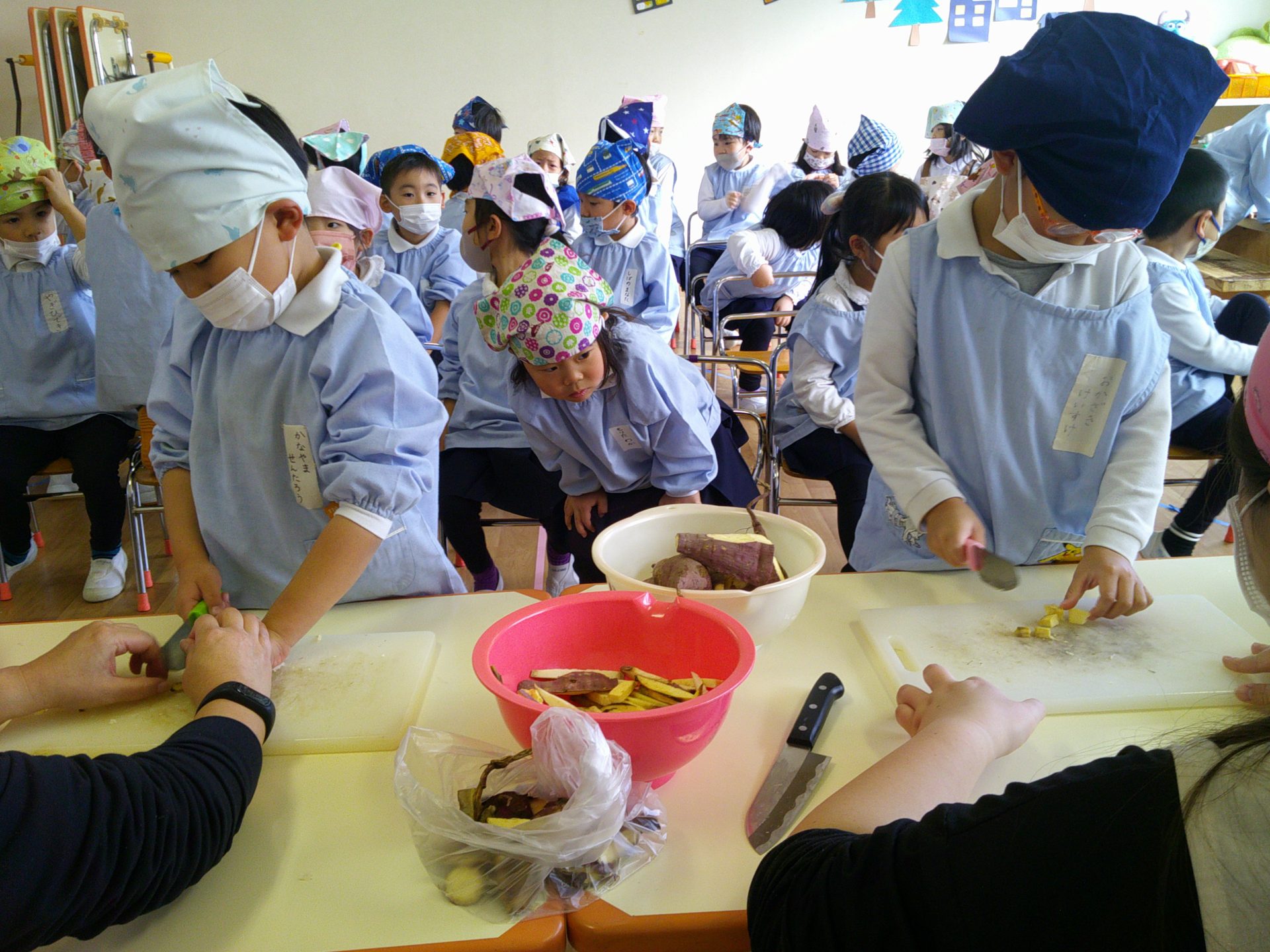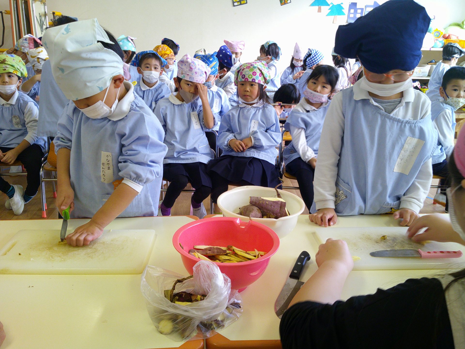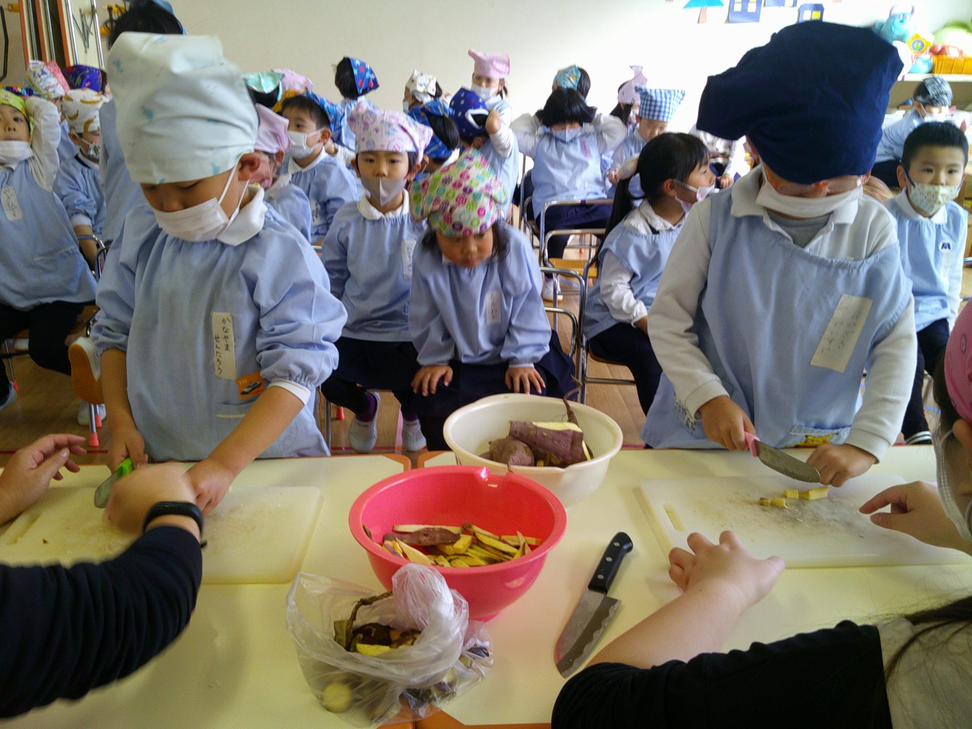 さつまいもクッキング第2弾の様子です。園の畑で収穫したさつまいもを使って蒸しパン作りをしました!