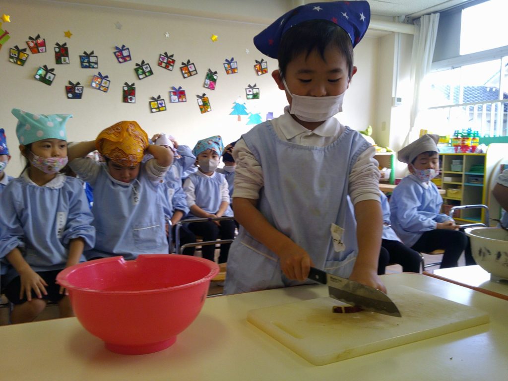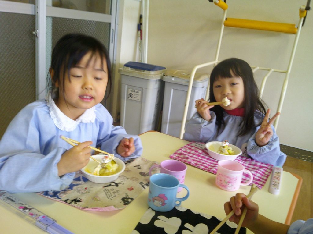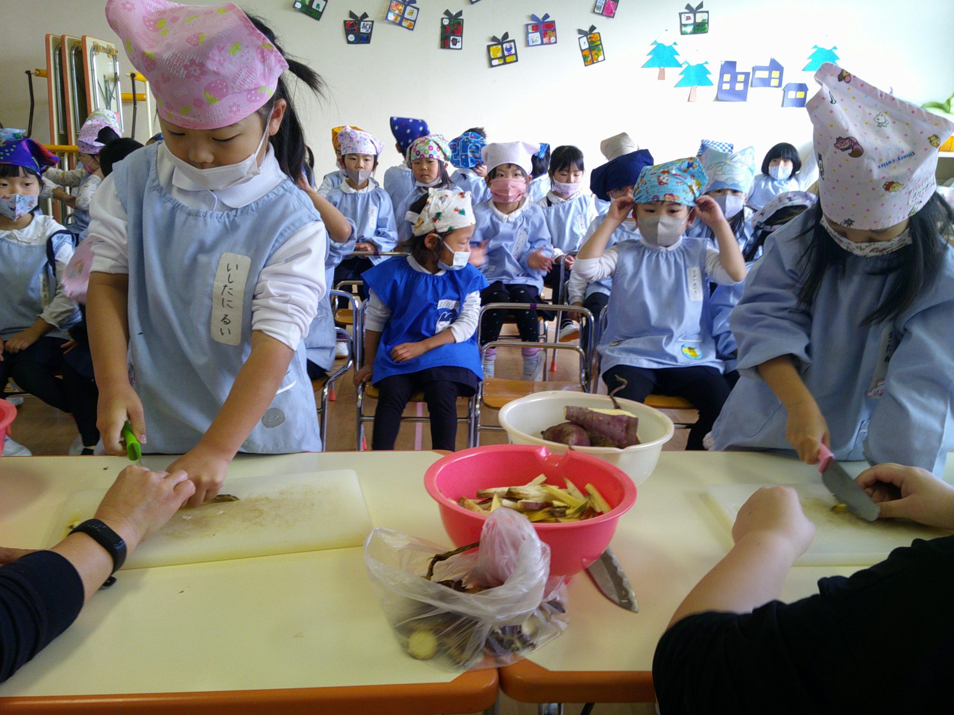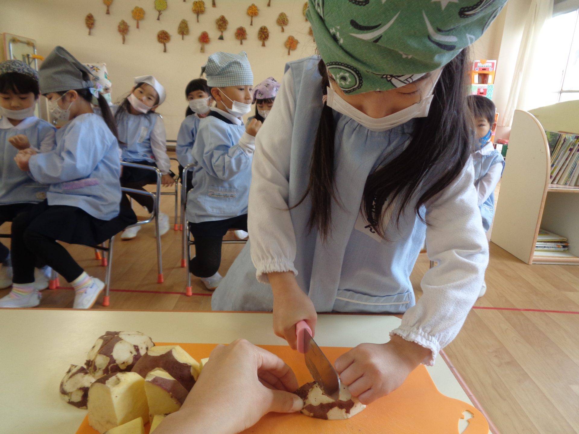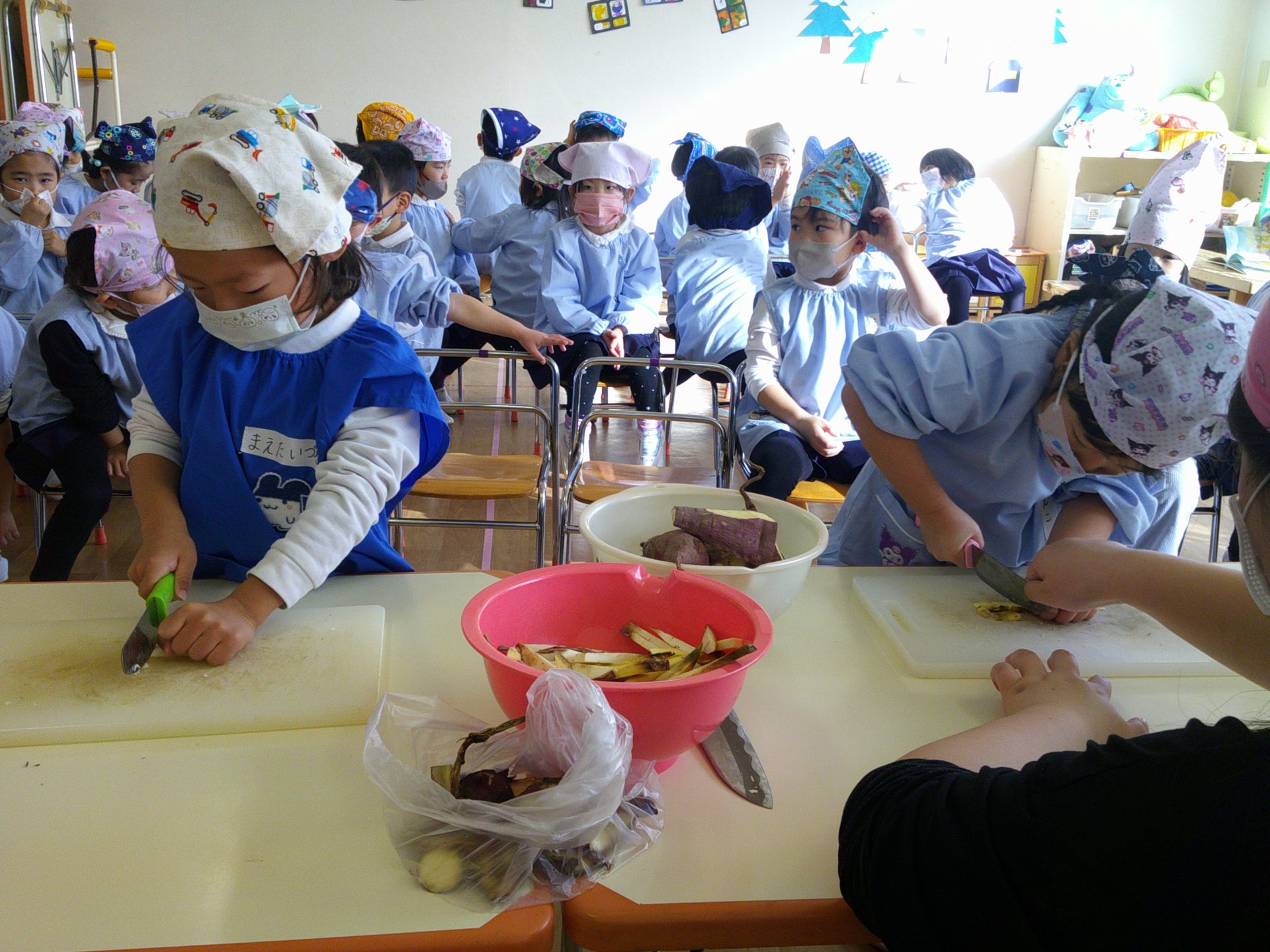 さつまいもクッキング第2弾の様子です。園の畑で収穫したさつまいもを使って蒸しパン作りをしました!