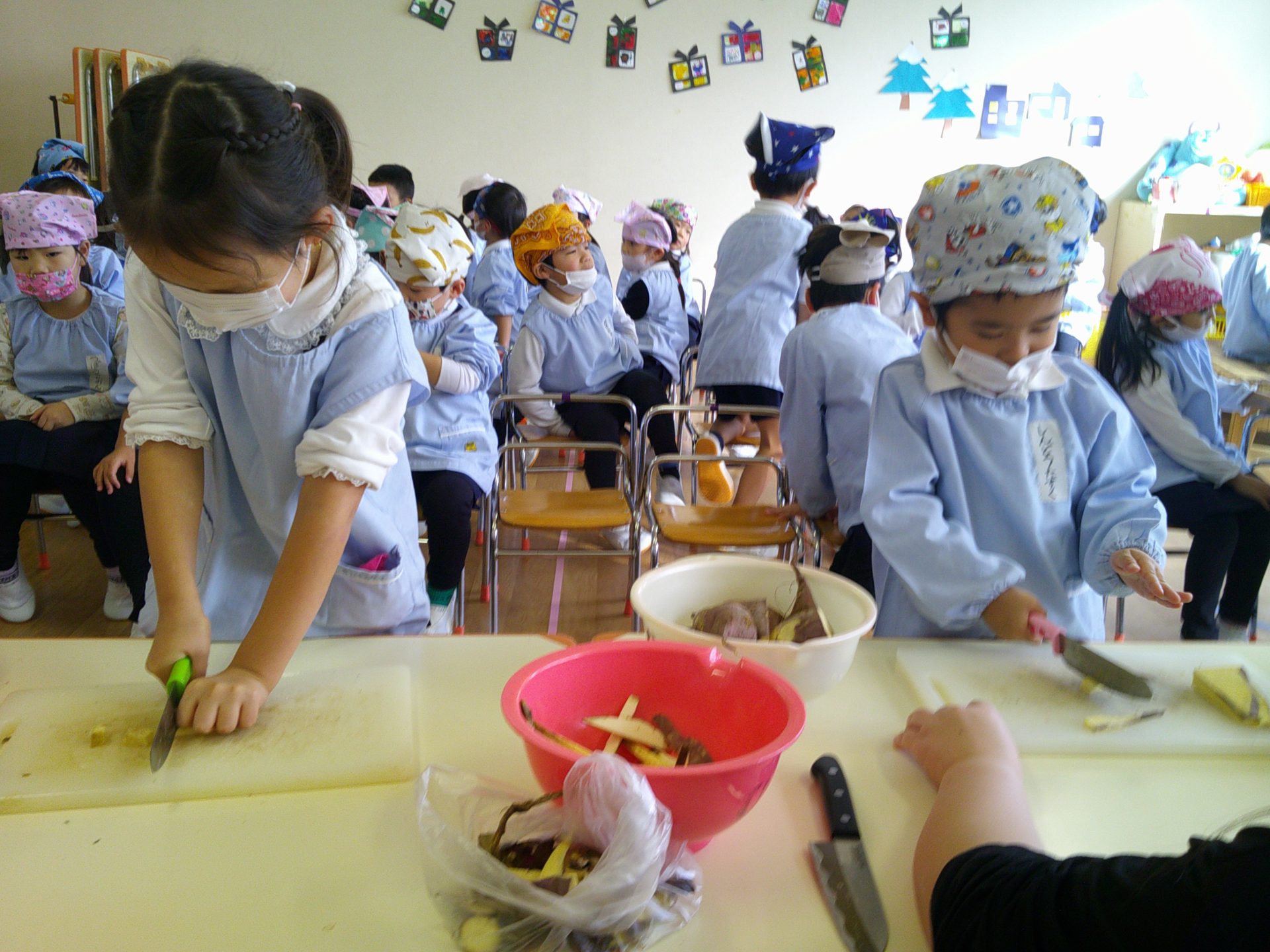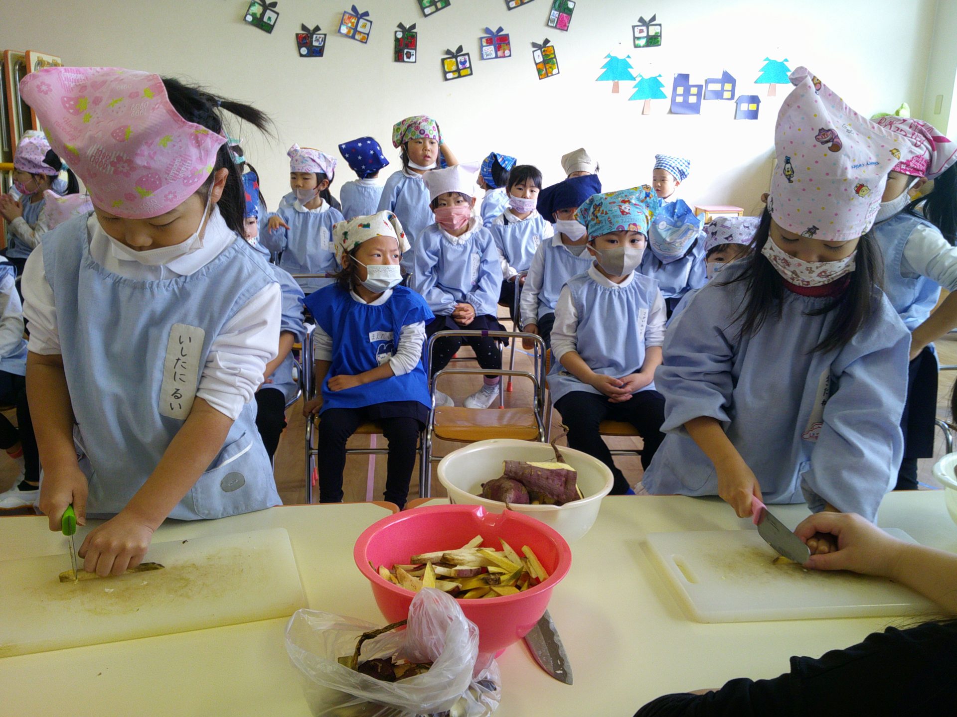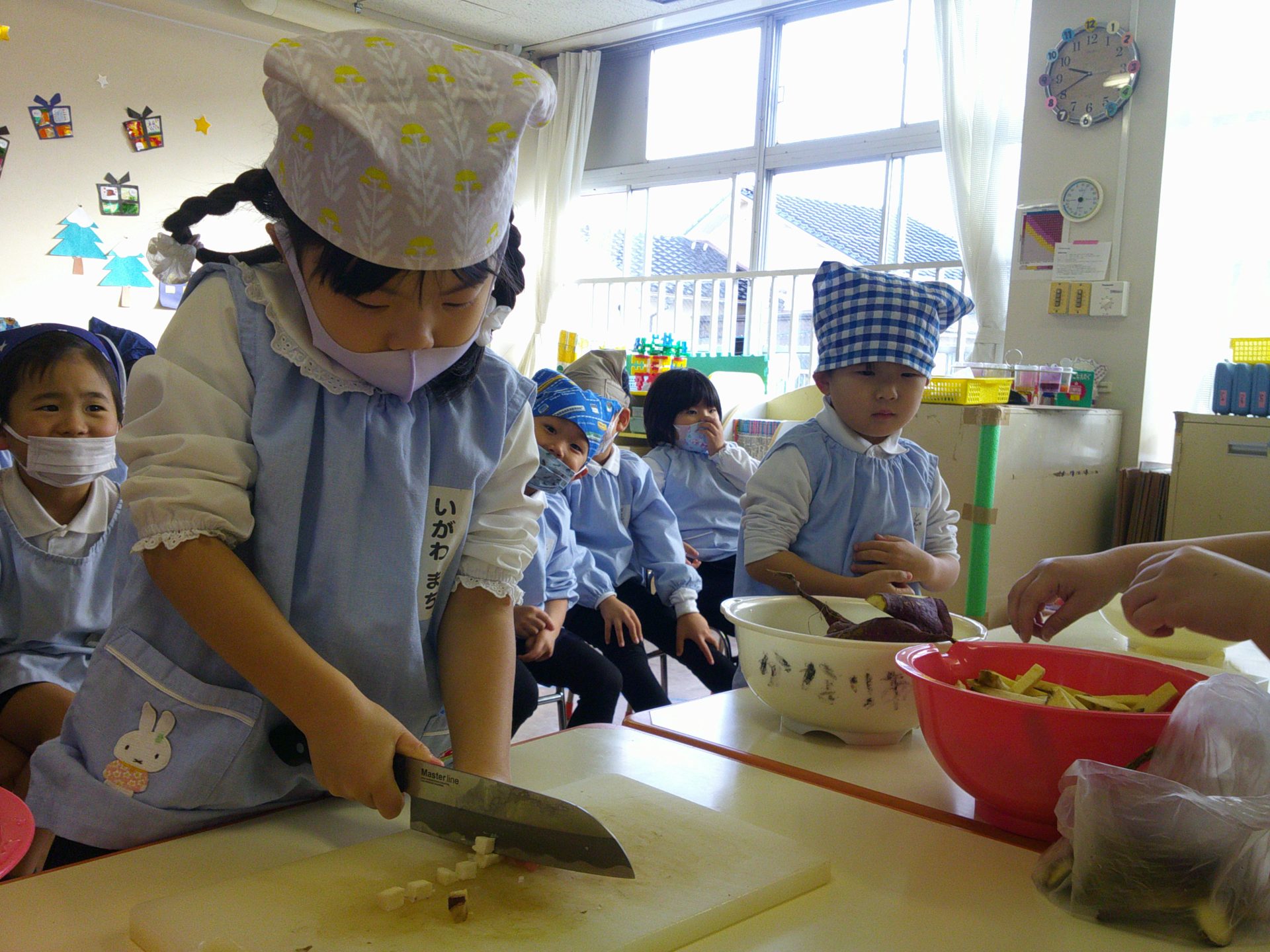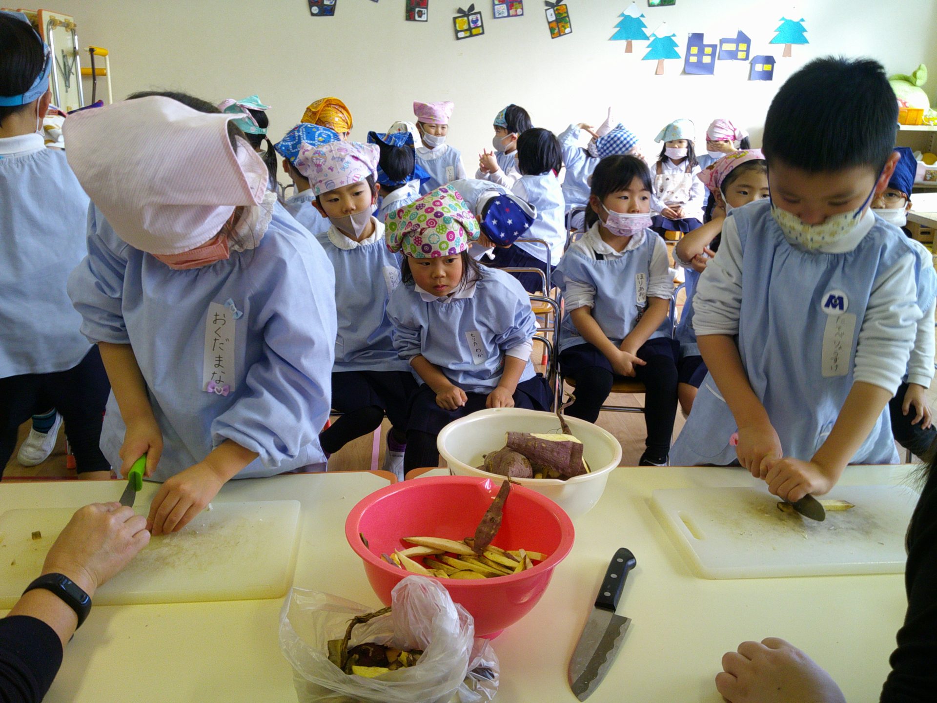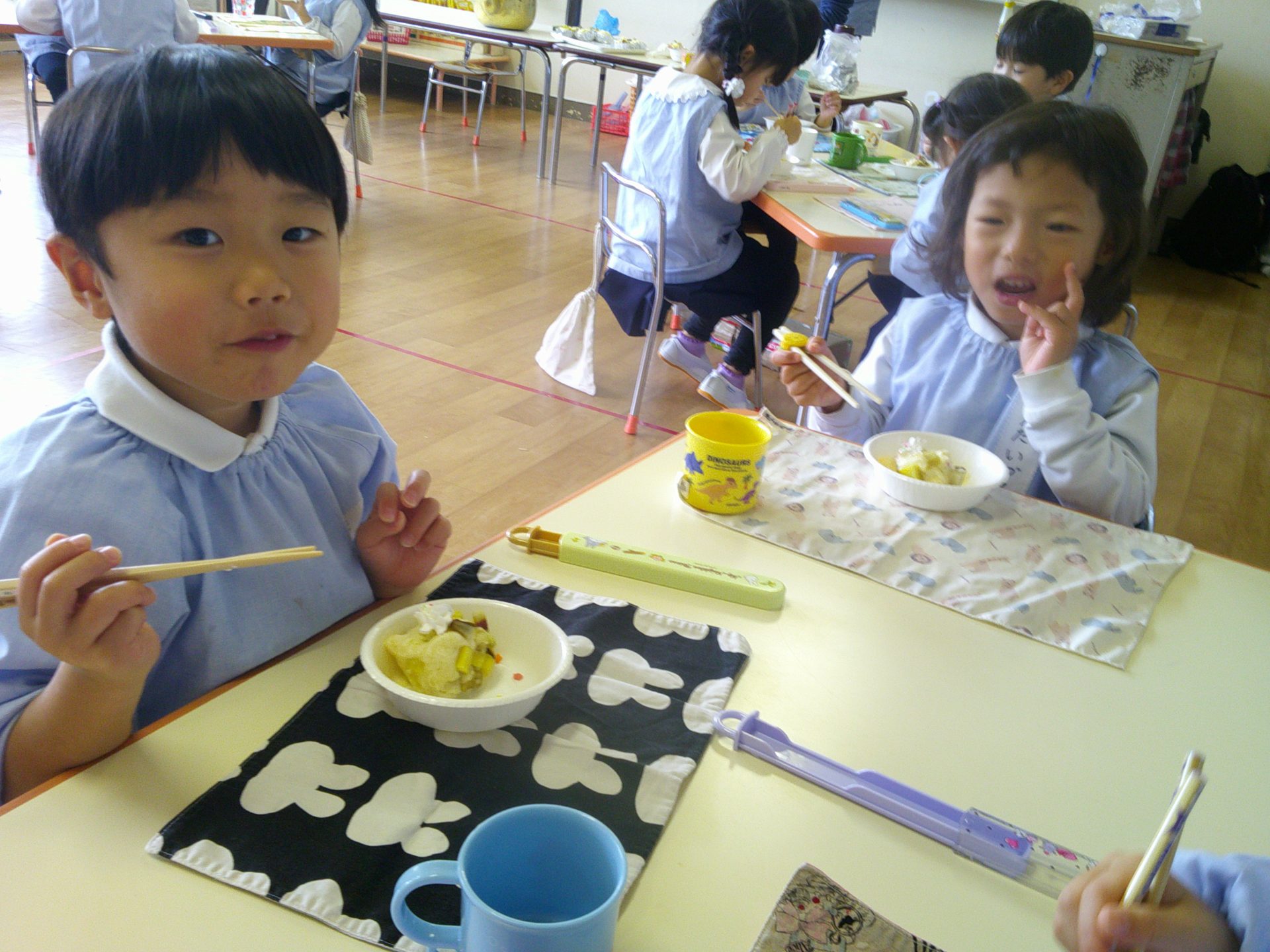 さつまいもクッキング第2弾の様子です。園の畑で収穫したさつまいもを使って蒸しパン作りをしました!