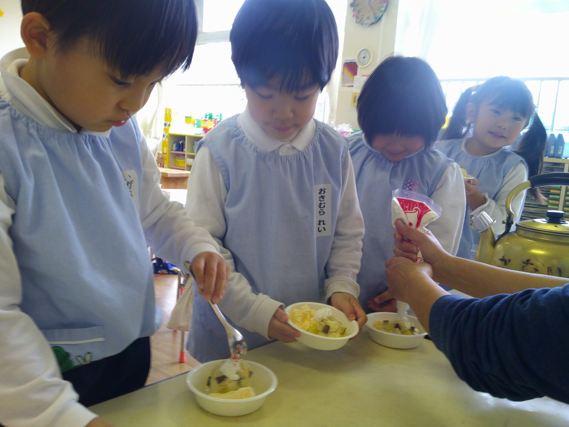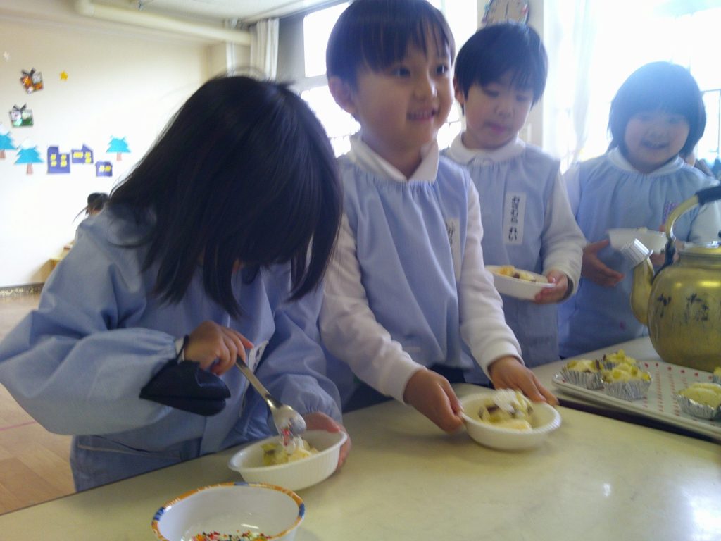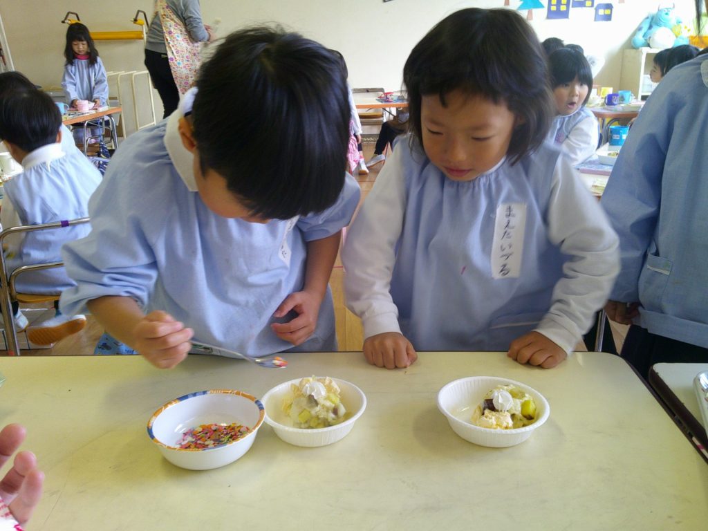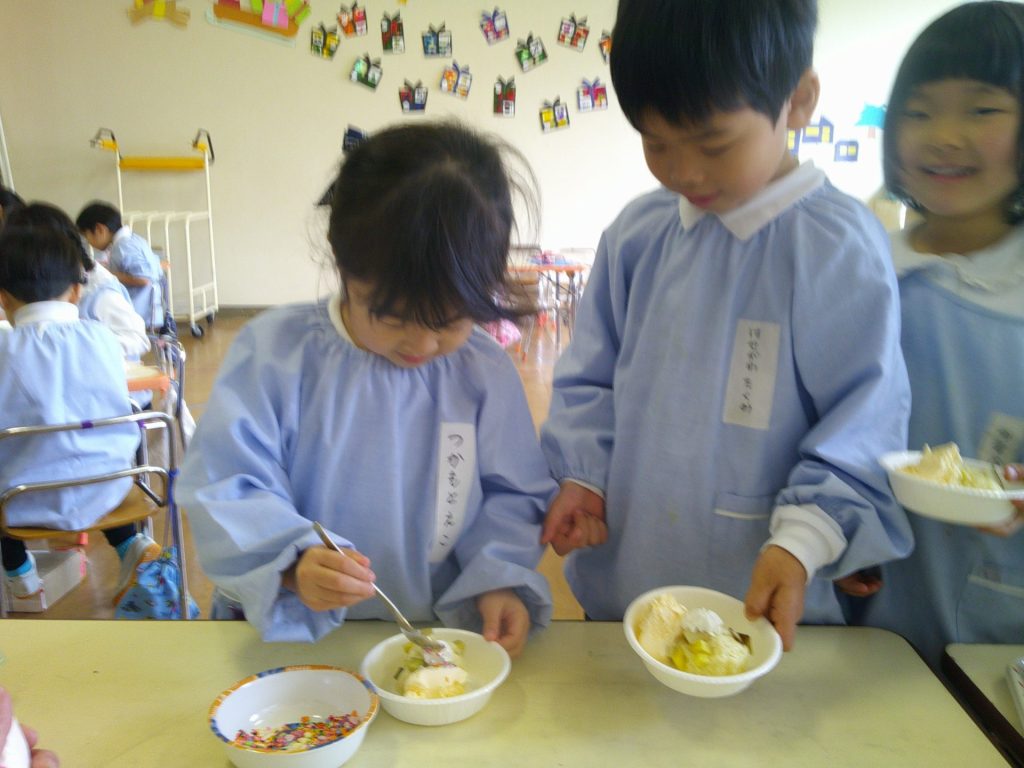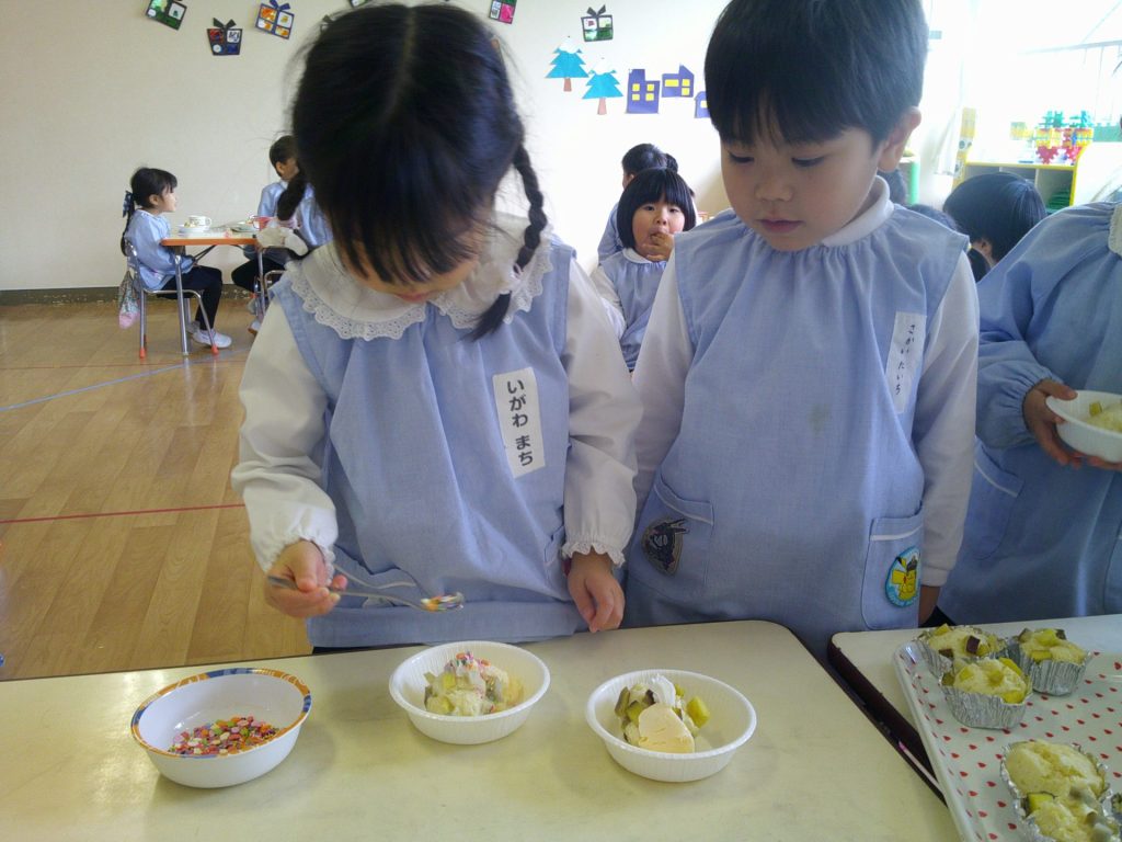音楽発表会もとってもよく頑張った子どもたち。トッピングではアイスや生クリームをのせて、楽しく作ることができました☺