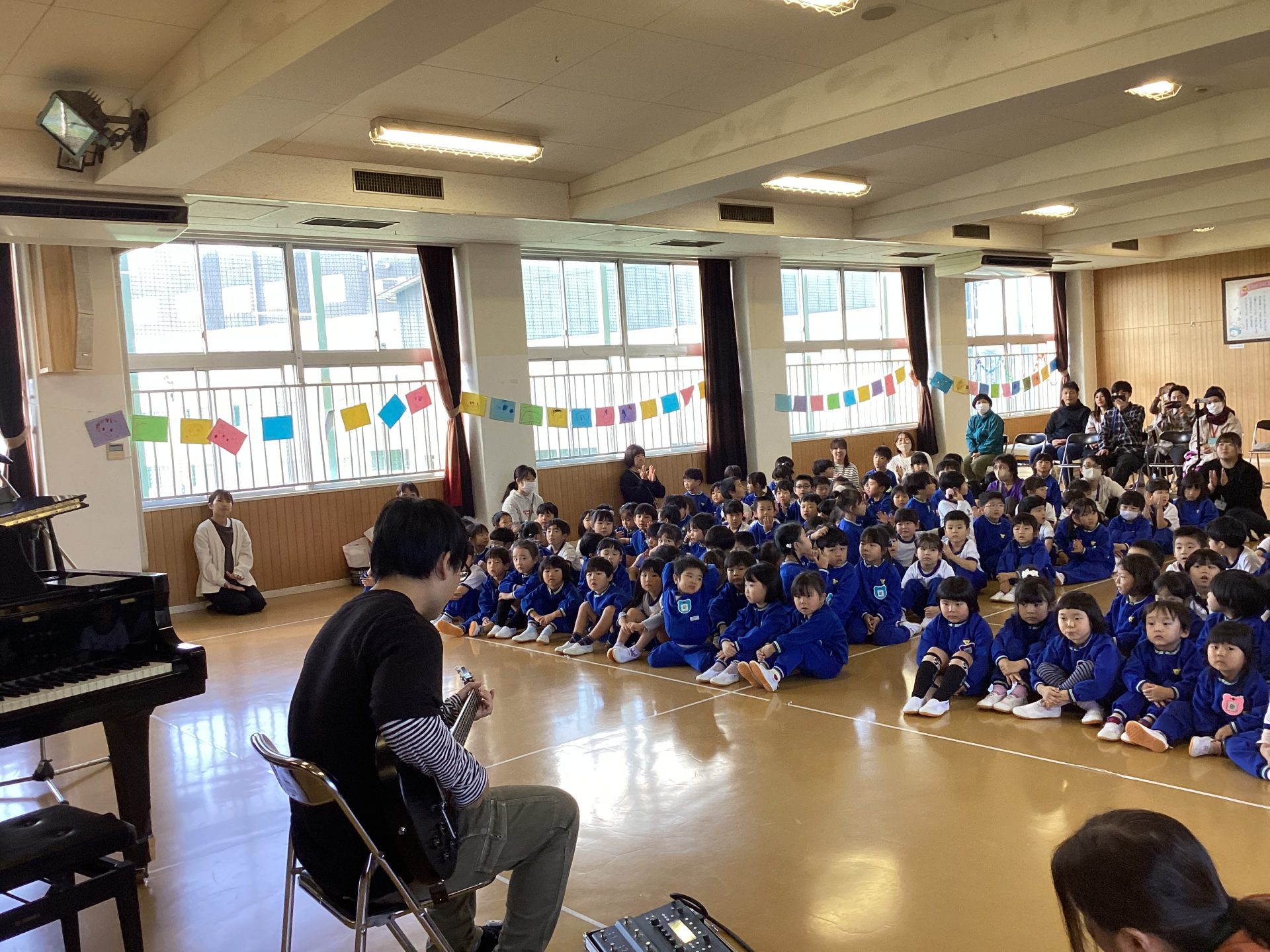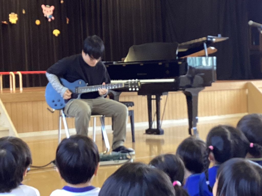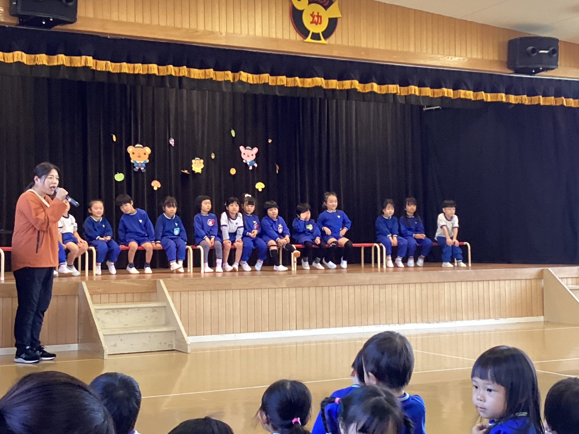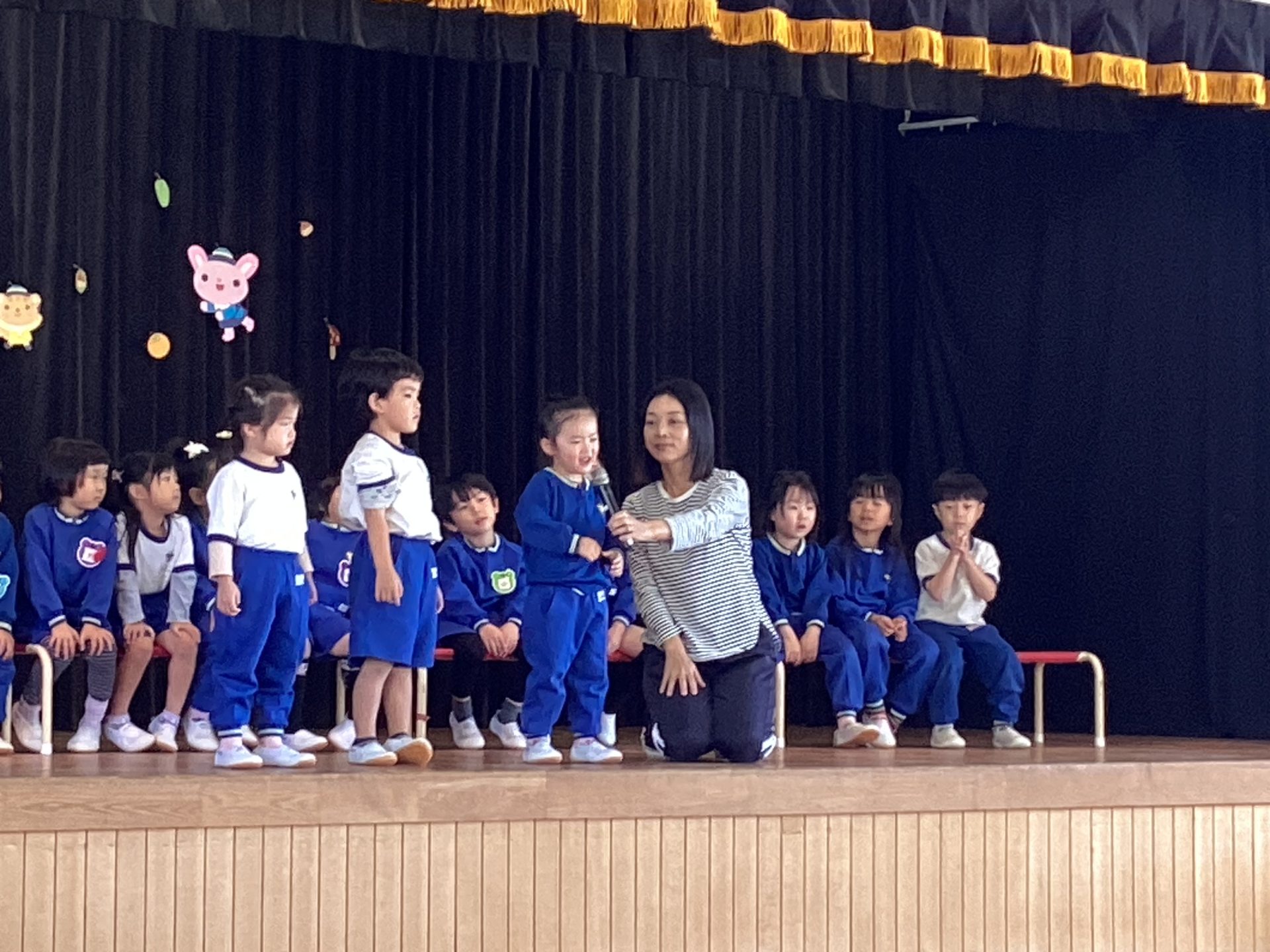 10月誕生会の様子です。みんなの前でステージに立ち、ドキドキしながらも自己紹介できました!!みんな素敵でした!!今月のお楽しみコーナーはゲストが2組来てくださいました!!かっこいいギターの音色とジャズピアノに合わせて歌やダンスを見せてくださいました!!とっても楽しい時間となりました!!